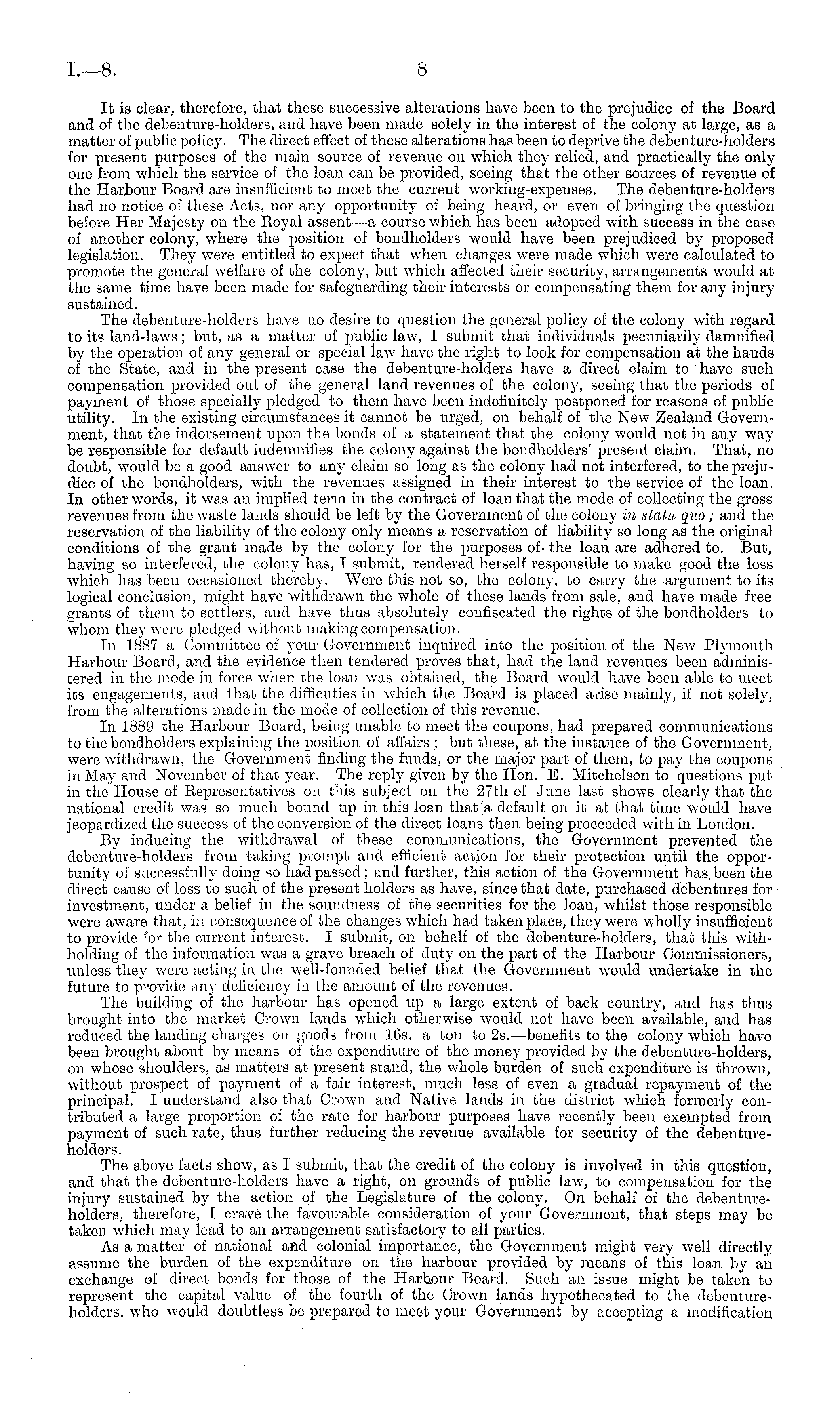 It is clear, therefore, that these successive alterations have been to the prejudice of the Board and of the debenture-holders, and have been made solely in the interest of the colony at large, as a matter of public policy. The direct effect of these alterations has been to deprive the debenture-holders for present purposes of the main source of revenue on which they relied, and practically the only one from which the service of the loan can be provided, seeing that the other sources of revenue of the Harbour Board are insufficient to meet the current working-expenses. The debenture-holders had no notice of these Acts, nor any opportunity of being heard, or even of bringing the question before Her Majesty on the Royal assent —a course which has been adopted with success in the case of another colony, where the position of bondholders would have been prejudiced by proposed legislation. They were entitled to expect that when changes were made which were calculated to promote the general welfare of the colony, but which affected their security, arrangements would at the same time have been made for safeguarding their interests or compensating them for any injury sustained. The debenture-holders have no desire to question the general policy of the colony with regard to its land-laws; but, as a matter of public law, I submit that individuals pecuniarily damnified by the operation of any general or special law have the right to look for compensation at the hands of the State, and in the present case the debenture-holders have a direct claim to have such compensation provided out of the general land revenues of the colony, seeing that the periods of payment of those specially pledged to them have been indefinitely postponed for reasons of public utility. In the existing circumstances it cannot be urged, on behalf of the New Zealand Government, that the indorsement upon the bonds of a statement that the colony would not in any way be responsible for default indemnifies the colony against the bondholders' present claim. That, no doubt, would be a good answer to any claim so long as the colony had not interfered, to the prejudice of the bondholders, with the revenues assigned in their interest to the service of the loan. In other words, it was an implied term in the contract of loan that the mode of collecting the gross revenues from the waste lands should be left by the Government of the colony in statu quo; and the reservation of the liability of the colony only means a reservation of liability so long as the original conditions of the grant made by the colony for the purposes of- the loan are adhered to. But, having so interfered, the colony has, I submit, rendered herself responsible to make good the loss which has been occasioned thereby. Were this not so, the colony, to carry the argument to its logical conclusion, might have withdrawn the whole of these lands from sale, and have made free grants of them to settlers, and have thus absolutely confiscated the rights of the bondholders to whom they were pledged without making compensation. In 1887 a Committee of your Government inquired into the position of the New Plymouth Harbour Board, and the evidence then tendered proves that, had the land revenues been administered in the mode in force when the loan was obtained, the Board would have been able to meet its engagements, and that the difficuties in which the Board is placed arise mainly, if not solely, from the alterations made in the mode of collection of this revenue. In 1889 the Harbour Board, being unable to meet the coupons, had prepared communications to the bondholders explaining the position of affairs ; but these, at the instance of the Government, were withdrawn, the Government finding the funds, or the major part of them, to pay the coupons in May and November of that year. The reply given by the Hon. E. Mitchelson to questions put in the House of Representatives on this subject on the 27th of June last shows clearly that the national credit was so much bound up in this loan that a default on it at that time would have jeopardized the success of the conversion of the direct loans then being proceeded with in London. By inducing the withdrawal of these communications, the Government prevented the debenture-holders from taking prompt and efficient action for their protection until the opportunity of successfully doing so had passed; and further, this action of the Government has been the direct cause of loss to such of the present holders as have, since that date, purchased debentures for investment, under a belief in the soimdness of the securities for the loan, whilst those responsible were aware that, in consequence of the changes which had taken place, they were wholly insufficient to provide for the current interest. I submit, on behalf of the debenture-holders, that this withholding of the information was a grave breach of duty on the part of the Harbour Commissioners, unless they were acting in tlie well-founded belief that the Government would undertake in the future to provide any deficiency in the amount of the revenues. The building of the harbour has opened up a large extent of back country, and has thus brought into the market Crown lands which otherwise would not have been available, and has reduced the landing charges on goods from 16s. a ton to 2s.—benefits to the colony which have been brought about by means of the expenditure of the money provided by the debenture-holders, on whose shoulders, as matters at present stand, the whole burden of such expenditure is thrown, without prospect of payment of a fair interest, much less of even a gradual repayment of the principal. I understand also that Crown and Native lands in the district which formerly contributed a large proportion of the rate for harbour purposes have recently been exempted from payment of such rate, thus further reducing the revenue available for security of the debentureholders. The above facts sh