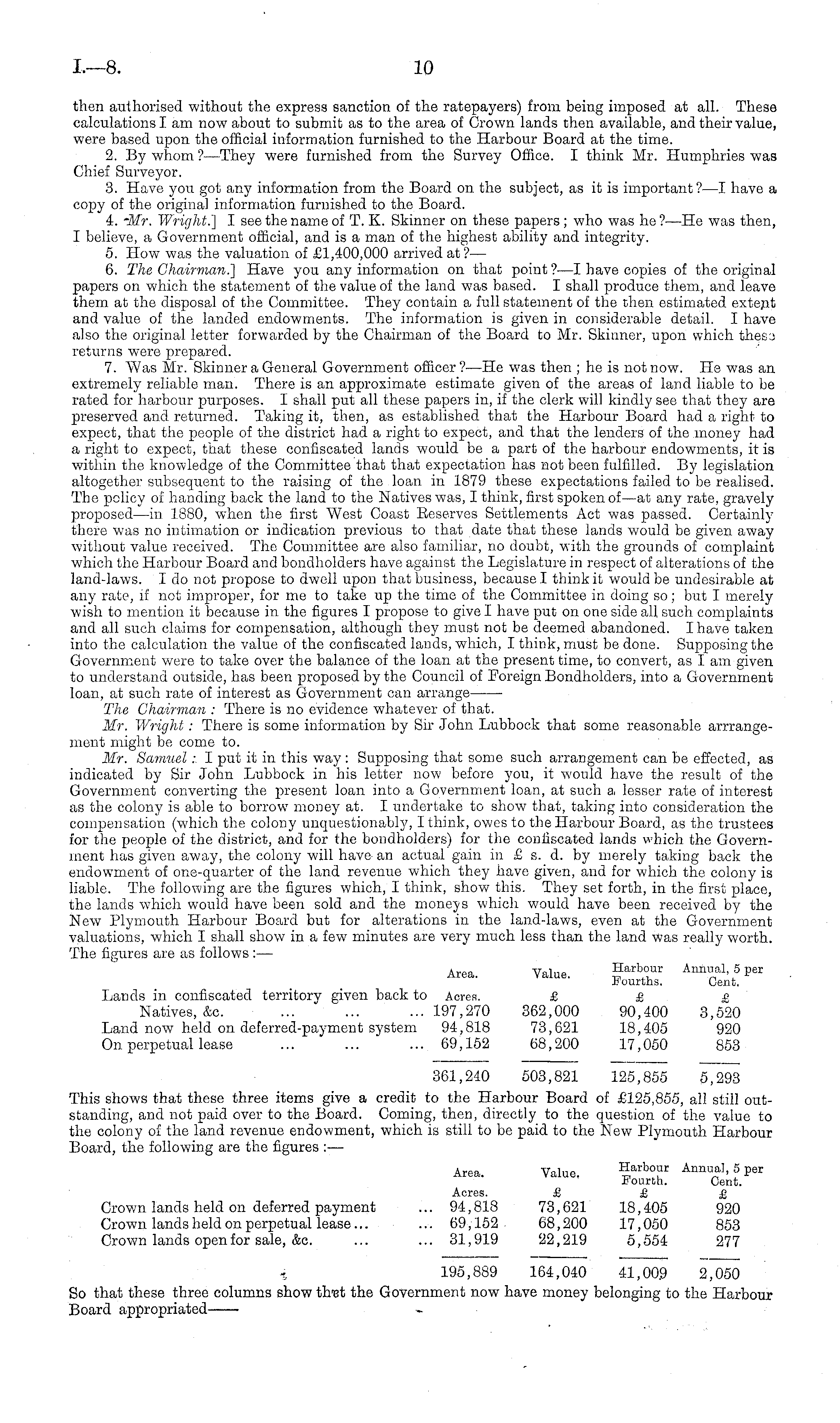 then authorised without the express sanction of the ratepayers) from being imposed at all. These calculations I am now about to submit as to the area of Crown lands then available, and their value, were based upon the official information furnished to the Harbour Board at the time. 2. By whom ?—They were furnished from the Survey Office. I think Mr. Humphries was Chief Surveyor. 3. Have you got any information from the Board on the subject, as it is important?—l have a copy of the original information furnished to the Board. 4. 'Mr. Wright.] I see the name of T. K. Skinner on these papers ; who was he ? —He was then, I believe, a Government official, and is a man of the highest ability and integrity. 5. How was the valuation of £1,400,000 arrived at? — 6. The Chairman.] Have you any information on that point ? —I have copies of the original papers on which the statement of the value of the land was based. I shall produce them, and leave them at the disposal of the Committee. They contain a full statement of the then estimated extent and value of the landed endowments. The information is given in considerable detail. I have also the original letter forwarded by the Chairman of the Board to Mr. Skinner, upon which thesa returns were prepared. 7. Was Mr. Skinner a General Government officer?—He was then ;he is not now. He was an extremely reliable man. There is an approximate estimate given of the areas of land liable to be rated for harbour purposes. I shall put all these papers in, if the clerk will kindly see that they are preserved and returned. Taking it, then, as established that the Harbour Board had a right to expect, that the people of the district had a right to expect, and that the lenders of the money had a right to expect, that these confiscated lands would be a part of the harbour endowments, it is within the knowledge of the Committee that that expectation has not been fulfilled. By legislation altogether subsequent to the raising of the loan in 1879 these expectations failed to be realised. The policy of handing back the land to the Natives was, I think, first spoken of —at any rate, gravely proposed—in 1880, when the first West Coast Eeserves Settlements Act was passed. Certainly there was no intimation or indication previous to that date that these lands would be given away without value received. The Committee are also familiar, no doubt, with the grounds of complaint which the Harbour Board and bondholders have against the Legislature in respect of alterations of the land-laws. Ido not propose to dwell upon that business, because I think it would be undesirable at any rate, if not improper, for me to take up the time of the Committee in doing so; but I merely wish to mention it because in the figures I propose to give I have put on one side all such complaints and all such claims for compensation, although they must not be deemed abandoned. I have taken into the calculation the value of the confiscated lands, which, I think, must be clone. Supposing the Government were to take over the balance of the loan at the present time, to convert, as I am given to understand outside, has been proposed by the Council of Foreign Bondholders, into a Government loan, at such rate of interest as Government can arrange The Chairman : There is no evidence whatever of that. Mr. Wright: There is some information by Sir John Lubbock that some reasonable arrrangement might be come to. Mr. Samuel :. I put it in this way : Supposing that some such arrangement can be effected, as indicated by Sir John Lubbock in his letter now before you, it would have the result of the Government converting the present loan into a Government loan, at such a lesser rate of interest as the colony is able to borrow money at. I undertake to show that, taking into consideration the compensation (which the colony unquestionably, I think, owes to the Harbour Board, as the trustees for the people of the district, and for the bondholders) for the confiscated lands which the Government has given away, the colony will have an actual gain in £ s. d. by merely taking back the endowment of one-quarter of the land revenue which they have given, and for which the colony is liable. The following are the figures which, I think, show this. They set forth, in the first place, the lands which would have been sold and the moneys which would have been received by the New Plymouth Harbour Board but for alterations in the land-laws, even at the Government valuations, which I shall show in a few minutes are very much less than the land was really worth. The figures are as follows : — Area. Value. Harbour Annual 5 per Fourths. Cent. Lands in confiscated territory given back to Acres. £ £ £ Natives, &c. ... ... ...197,270 362,000 90,400 3,520 Land now held on deferred-payment system 94,818 73,621 18,405 920 On perpetual lease ... ... ... 69,152 68,200 17,050 853 361,240 503,821 125,855 5,293 This shows that these three items give a credit to the Harbour Board of £125,855, all still outstanding, and not paid over to the Board. Coming, then, directly to the question of the value to the colony of the land revenue endowment, which is still to be paid to the New Plymouth Harbour Board, the following are the figures : — Area. Value. Jt A°? r Ann"al> 5 Per Fourth. Cent. Acres. £ £ £ Crown lands held on deferred payment ... 94,818 73,621 18,405 920 Crown lands held on perpetual lease... ... 69,152 68,200 17,050 853 Crown lands open for sale, &c. ... ... 31,919 22,219 5,554 277 195,889 164,040 41,00.9 2,050 So that these three columns show tlnst the Government now have money belonging to the Harbour Board appropriated