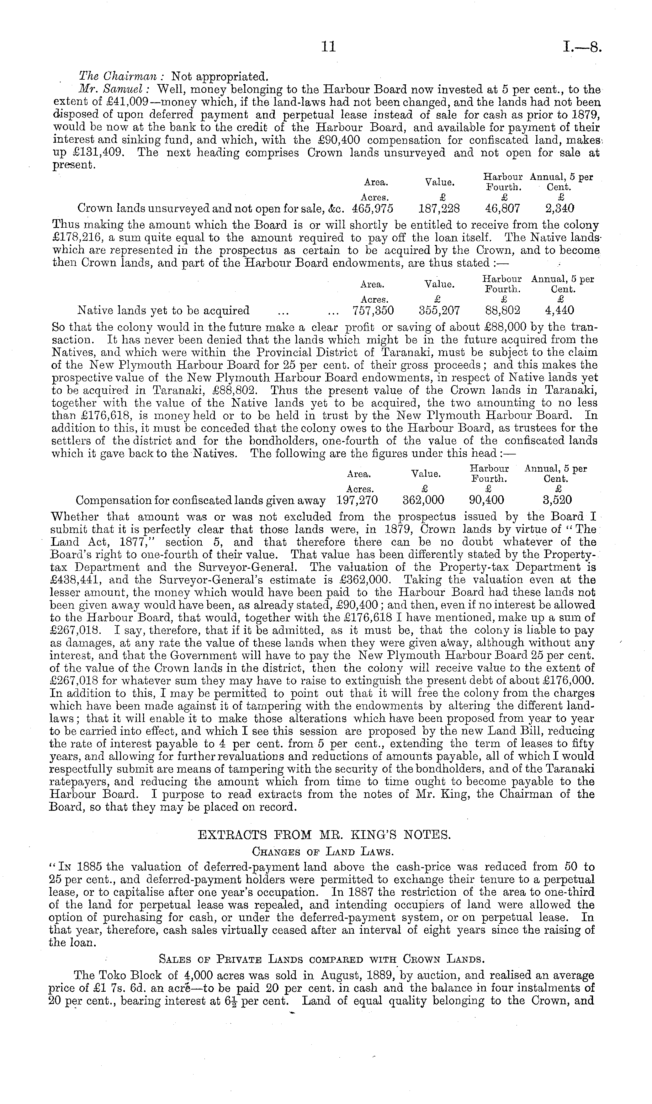 The Chairman : Not appropriated. Mr. Samuel: Well, money belonging to the Harbour Board now invested at 5 per cent., to the extent of £41,009 —money which, if the land-laws had not been changed, and the lands had not been disposed of upon deferred payment and perpetual lease instead of sale for cash as prior to 1879, would be now at the bank to the credit of the Harbour Board, and available for payment of their interest and sinking fund, and which, with the £90,400 compensation for confiscated land, makes up £131,409. The next heading comprises Crown lands unsurveyed and not open for sale at present. , ~ , Harbour Annual, 5 per Area. Valuo. Fourth _ Cen '_ » Acres. £ £ £ Crown lands unsurveyed and not open for sale, &c. 465,975 187,228 46,807 2,340 Thus making the amount which the Board is or will shortly be entitled to receive from the colony £178,216, a sum quite equal to the amount required to pay off the loan itself. The Native landswhich are represented in the prospectus as certain to be acquired by the Crown, and to become then Crown lands, and part of the Harbour Board endowments, are thus stated : — , TT , Harbour Annual, 5 per Area. Value. j^^ - Acres. £ £ £ Native lands yet to be acquired ... ... 757,350 355,207 88,802 4,440 So that the colony would in the future make a clear profit or saving of about £88,000 by the transaction. It has never been denied that the lands which might be in the future acquired from the Natives, and which were within the Provincial District of Taranaki, must be subject to the claim of the New Plymouth Harbour Board for 25 per cent, of their gross proceeds ; and this makes the prospective value of the New Plymouth Harbour Board endowments, in respect of Native lands yet to be acquired in Taranaki, £88,802. Thus the present value of the Crown lands in Taranaki, together with the value of the Native lands yet to be acquired, the two amounting to no less than £176,618, is money held or to be held in trust by the New Plymouth Harbour Board. In addition to this, it must be conceded that the colony owes to the Harbour Board, as trustees for the settlers of the district and for the bondholders, one-fourth of the value of the confiscated lands which it gave back to the Natives. The following are the figures under this head : — , TT , Harbour Annual, 5 per Area. Value. .g,^^ I \cres £ £ £> Compensation for confiscated lands given away 197,270 362,000 90,400 3,520 Whether that amount was or was not excluded from the prospectus issued by the Board I submit that it is perfectly clear that those lands were, in 1879, Crown lands by virtue of " The Land Act, 1877," section 5, and that therefore there can be no doubt whatever of the Board's right to one-fourth of their value. That value has been differently stated by the Propertytax Department and the Surveyor-General. The valuation of the Property-tax Department is £438,441, and the Surveyor-General's estimate is £362,000. Taking the valuation even at the lesser amount, the money which would have been paid to the Harbour Board had these lands not been given away would have been, as already stated, £90,400; and then, even if no interest be allowed to the Harbour Board, that would, together with the £176,618 I have mentioned, make up a sum of £267,018. I say, therefore, that if it be admitted, as it must be, that the colony is liable to pay as damages, at any rate the value of these lands when they were given away, although without any interest, and that the Government will have to pay the New Plymouth Harbour Board 25 per cent. of the value of the Crown lands in the district, then the colony will receive value to the extent of £267,018 for whatever sum they may have to raise to extinguish the present debt of about £176,000. In addition to this, I may be permitted to point out that it will free the colony from the charges which have been made against it of tampering with the endowments by altering the different landlaws ; that it will enable it to make those alterations which have been proposed from year to year to be carried into effect, and which I see this session are proposed by the new Land Bill, reducing the rate of interest payable to 4 per cent, from 5 per cent., extending the term of leases to fifty years, and allowing for further revaluations and reductions of amounts payable, all of which I would respectfully submit are means of tampering with the security of the bondholders, and of the Taranaki ratepayers, and reducing the amount which from time to time ought to become payable to the Harbour Board. I purpose to read extracts from the notes of Mr. King, the Chairman of the Board, so that they may be placed on record. EXTEACTS FEOM ME. KING'S NOTES. Changes op Land Laws. "In 1885 the valuation of deferred-payment land above the cash-price was reduced from 50 to 25 per cent., and deferred-payment holders were permitted to exchange their tenure to a perpetual lease, or to capitalise after one year's occupation. In 1887 the restriction of the area to one-third of the land for perpetual lease was repealed, and intending occupiers of land were allowed the option of purchasing for cash, or under the deferred-payment system, or on perpetual lease. In that year, therefore, cash sales virtually ceased after an interval of eight years since the raising of the loan. Sales of Private Lands compared with Ceown Lands. The Toko Block of 4,000 acres was sold in August, 1889, by auction, and realised an average price of £1 7s. 6d. an acre—to be paid 20 per cent, in cash and the balance in four instalments of 20 per cent., bearing interest at 6-J per cent. Land of equal quality belonging to the Crown, and