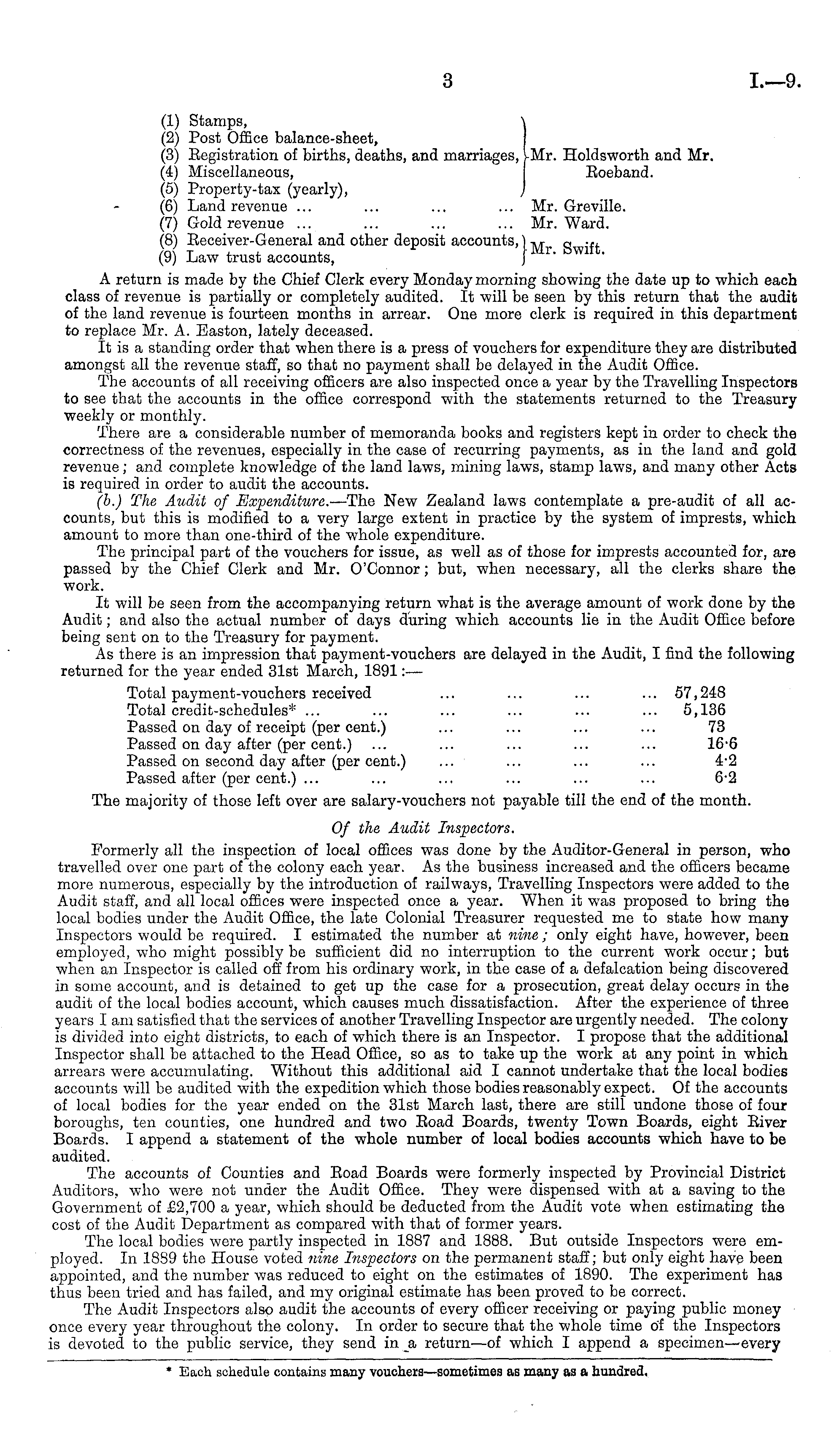 (1) Stamps, \ (2) Post Office balance-sheet, (3) Eegistration of births, deaths, and marriages, vMr. Holdsworth and Mr. (4) Miscellaneous, Eoeband. (5) Property-tax (yearly), J (6) Land revenue ... ... ... ... Mr. Greville. (7) Gold revenue ... ... ... ... Mr. Ward. (8) Eeceiver-General and other deposit accounts,) -y o ~, (9) Law trust accounts, J A return is made by the Chief Clerk every Monday morning showing the date up to which each class of revenue is partially or completely audited. It will be seen by this return that the audit of the land revenue is fourteen months in arrear. One more clerk is required in this department to replace Mr. A. Easton, lately deceased. It is a standing order that when there is a press of vouchers for expenditure they are distributed amongst all the revenue staff, so that no payment shall be delayed in the Audit Office. The accounts of all receiving officers are also inspected once a year by the Travelling Inspectors to see that the accounts in the office correspond with the statements returned to the Treasury weekly or monthly. There are a considerable number of memoranda books and registers kept in order to check the correctness of the revenues, especially in the case of recurring payments, as in the land and gold revenue; and complete knowledge of the land laws, mining laws, stamp laws, and many other Acts is required in order to audit the accounts. (b.) The Audit of Expenditure.- —The New Zealand laws contemplate a pre-audit of all accounts, but this is modified to a very large extent in practice by the system of imprests, which amount to more than one-third of the whole expenditure. The principal part of the vouchers for issue, as well as of those for imprests accounted for, are passed by the Chief Clerk and Mr. O'Connor; but, when necessary, all the clerks share the work. It will be seen from the accompanying return what is the average amount of work done by the Audit; and also the actual number of days during which accounts lie in the Audit Office before being sent on to the Treasury for payment. As there is an impression that payment-vouchers are delayed in the Audit, I find the following returned for the year ended 31st March, 1891:— Total payment-vouchers received ... ... ... ... 57,248 Total credit-schedules* ... ... ... ... ... ... 5,136 Passed on day of receipt (per cent.) ... ... ... ... 73 Passed on day after (per cent.) ... ... ... ... ... 166 Passed on second day after (per cent.) ... ... ... ... 4-2 Passed after (per cent.) ... ... ... ... ... ... 6-2 The majority of those left over are salary-vouchers not payable till the end of the month. Of the Audit Inspectors. Formerly all the inspection of local offices was done by the Auditor-General in person, who travelled over one part of the colony each year. As the business increased and the officers became more numerous, especially by the introduction of railways, Travelling Inspectors were added to the Audit staff, and all local offices were inspected once a year. When it was proposed to bring the local bodies under the Audit Office, the late Colonial Treasurer requested me to state how many Inspectors would be required. I estimated the number at nine ; only eight have, however, been employed, who might possibly be sufficient did no interruption to the current work occur; but when an Inspector is called off from his ordinary work, in the case of a defalcation being discovered in some account, and is detained to get up the case for a prosecution, great delay occurs in the audit of the local bodies account, which causes much dissatisfaction. After the experience of three years lam satisfied that the services of another Travelling Inspector are urgently needed. The colony is divided into eight districts, to each of which there is an Inspector. I propose that the additional Inspector shall be attached to the Head Office, so as to take up the work at any point in which arrears were accumulating. Without this additional aid I cannot undertake that the local bodies accounts will be audited with the expedition which those bodies reasonably expect. Of the accounts of local bodies for the year ended on the 31st March last, there are still undone those of four boroughs, ten counties, one hundred and two Eoad Boards, twenty Town Boards, eight Eiver Boards. I append a statement of the whole number of local bodies accounts which have to be audited. The accounts of Counties and Eoad Boards were formerly inspected by Provincial District Auditors, who were not under the Audit Office. They were dispensed with at a saving to the Government of £2,700 a year, which should be deducted from the Audit vote when estimating the cost of the Audit Department as compared with that of former years. The local bodies were partly inspected in 1887 and 1888. But outside Inspectors were employed. In 1889 the House voted nine Inspectors on the permanent staff; but only eight have been appointed, and the number was reduced to eight on the estimates of 1890. The experiment has thus been tried and has failed, and my original estimate has been proved to be correct. The Audit Inspectors also audit the accounts of every officer receiving or paying public money once every year throughout the colony. In order to secure that the whole time of the Inspectors is devoted to the public service, they send in & return—of which I append a specimen—every