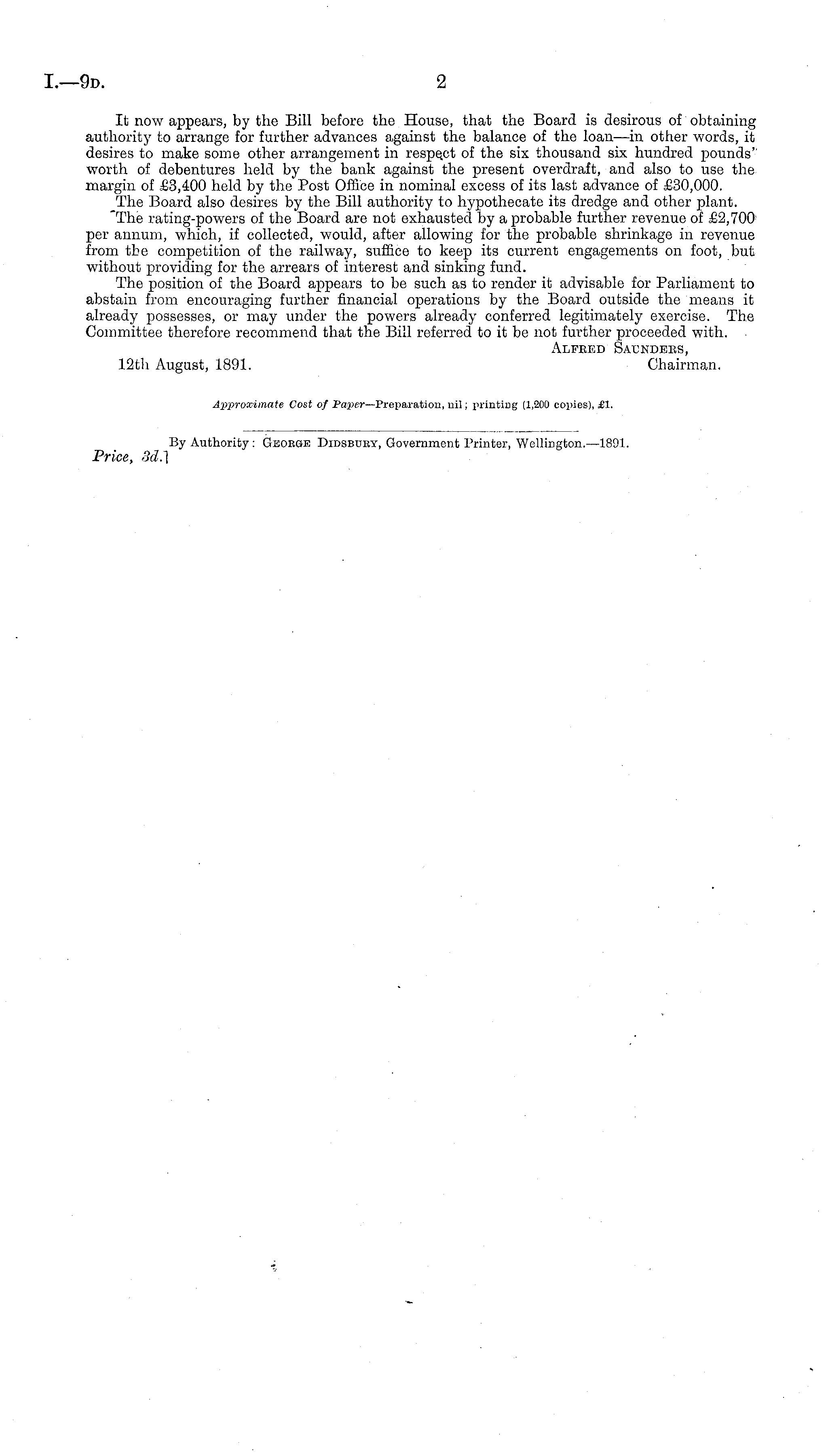 It now appears, by the Bill before the House, that the Board is desirous of obtaining authority to arrange for further advances against the balance of the loan —in other words, it desires to make some other arrangement in respe.ct of the six thousand six hundred pounds" worth of debentures held by the bank against the present overdraft, and also to use the margin of £3,400 held by the Post Office in nominal excess of its last advance of £30,000. The Board also desires by the Bill authority to hypothecate its dredge and other plant. "The rating-powers of the Board are not exhausted by a probable further revenue of £2,700 per annum, which, if collected, would, after allowing for the probable shrinkage in revenue from the competition of the railway, suffice to keep its current engagements on foot, but without providing for the arrears of interest and sinking fund. The position of the Board appears to be such as to render it advisable for Parliament to abstain from encouraging further financial operations by the Board outside the means it already possesses, or may under the powers already conferred legitimately exercise. The Committee therefore recommend that the Bill referred to it be not further proceeded with. Alfbed Sacndees, 12th August, 1891. Chairman. Approximate Cost of Paper— Preparation, nil; printing (1,200 copies), £1.