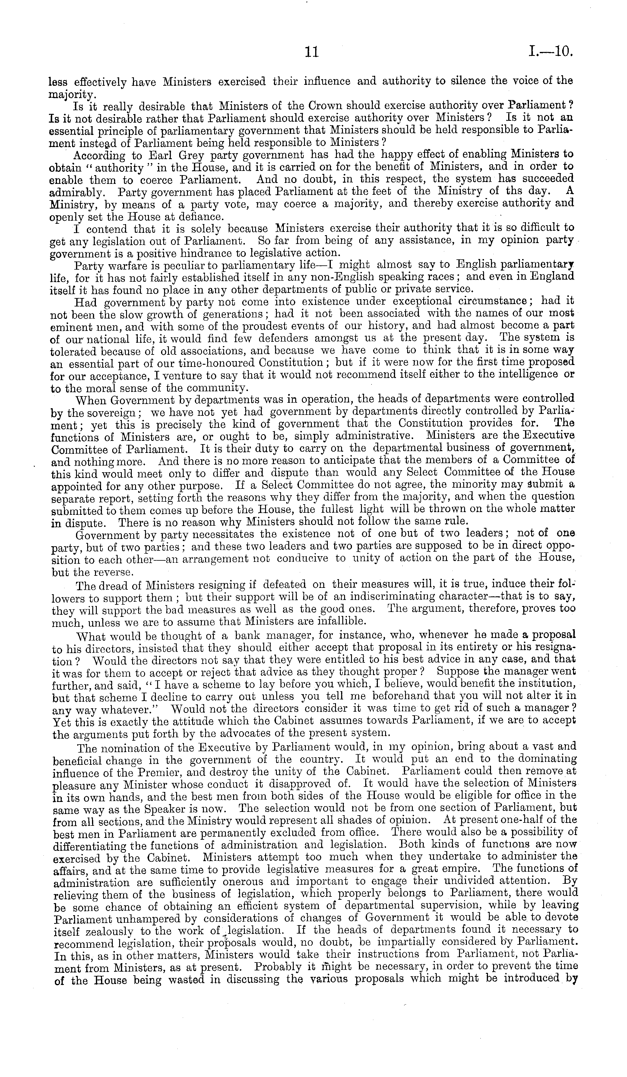 less effectively have Ministers exercised their influence and authority to silence the voice of the majority. Is it really desirable that Ministers of the Crown should exercise authority over Parliament ? Is it not desirable rather that Parliament should exercise authority over Ministers ? Is it not an essential principle of parliamentary government that Ministers should be held responsible to Parliament instead of Parliament being held responsible to Ministers ? According to Earl Grey party government has had the happy effect of enabling Ministers to obtain " authority " in the House, and it is carried on for the benefit of Ministers, and in order to enable them to coerce Parliament. And no doubt, in this respect, the system has succeeded admirably. Party government has placed Parliament at the feet of the Ministry of ths day. A Ministry, by means of a party vote, may coerce a majority, and thereby exercise authority and openly set the House at defiance. I contend that it is solely because Ministers exercise their authority that it is so difficult to get any legislation out of Parliament. So far from being of any assistance, in my opinion party government is a positive hindrance to legislative action. Party warfare is peculiar to parliamentary life —I might almost say to English parliamentary life, for it has not fairly established itself in any non-English speaking races; and even in England itself it has found no place in any other departments of public or private service. Had government by party not come into existence under exceptional circumstance; had it not been the slow growth of generations ; had it not been associated with the names of our most eminent men, and with some of the proudest events of our history, and had almost become a part of our national life, it would find few defenders amongst us at the present day. The system is tolerated because of old associations, and because we have come to think that it is in some way an essential part of our time-honoured Constitution ; but if it were now for the first time proposed for our acceptance, I venture to say that it would not recommend itself either to the intelligence or to the moral sense of the community. When Government by departments was in operation, the heads of departments were controlled by the sovereign; we have not yet had government by departments directly controlled by Parliament ; yet this is precisely the kind of government that the Constitution provides for. The functions of Ministers are, or ought to be, simply administrative. Ministers are the Executive Committee of Parliament. It is their duty to carry on the departmental business of government, and nothing more. And there is no more reason to anticipate that the members of a Committee of this kind would meet only to differ and dispute than would any Select Committee af the House appointed for any other purpose. If a Select Committee do not agree, the minority may Submit a separate report, setting forth the reasons why they differ from the majority, and when the question submitted to them comes up before the House, the fullest light will be thrown on the whole matter in dispute. There is no reason why Ministers should not follow the same rule. Government by party necessitates the existence not of one but of two leaders; not of one party, but of two parties; and these two leaders and two parties are supposed to be in direct opposition'to each other —an arrangement not conducive to unity of action on the part of the House, but the reverse. The dread of Ministers resigning if defeated on their measures will, it is true, induce their followers to support them ; but their support will be of an indiscriminating character—that is to say, they will support the bad measures as well as the good ones. The argument, therefore, proves too much, unless we are to assume that Ministers are infallible. What would be thought of a bank manager, for instance, who, whenever he made a proposal to his directors, insisted that they should either accept that proposal in its entirety or his resignation ? Would the directors not say that they were entitled to his best advice in any case, and that it was for them to accept or reject that advice as they thought proper ? Suppose the manager went further, and said, " I have a scheme to lay before you which, I believe, would benefit the institution, but that scheme I decline to carry out unless you tell me beforehand that you will not alter it in any way whatever." Would not the directors consider it was time to get rid of such a manager? Yet this is exactly the attitude which the Cabinet assumes towards Parliament, if we are to accept the arguments put forth by the advocates of the present system. The nomination of the Executive by Parliament would, in my opinion, bring about a vast and beneficial change in the government of the country. It would put an end to the dominating influence of the Premier, and destroy the unity of the Cabinet. Parliament could then remove at pleasure any Minister whose conduct it disapproved of. It would have the selection of Ministers in its own hands, and the best men from both sides of the House would be eligible for office in the same way as the Speaker is now. The selection would not be from one section of Parliament, but from all sections, and the Ministry would represent all shades of opinion. At present one-half of the best men in Parliament are permanently excluded from office. There would also be a possibility of differentiating the functions of administration and legislation. Both kinds of functions are now exercised by the Cabinet. Ministers attempt too much when they undertake to administer the affairs, and at the same time to provide legislative measures for a great empire. The functions of administration are sufficiently onerous and important to engage their undivided attention. By relieving them of the business of legislation, which properly belongs to Parliament, there would be some cha