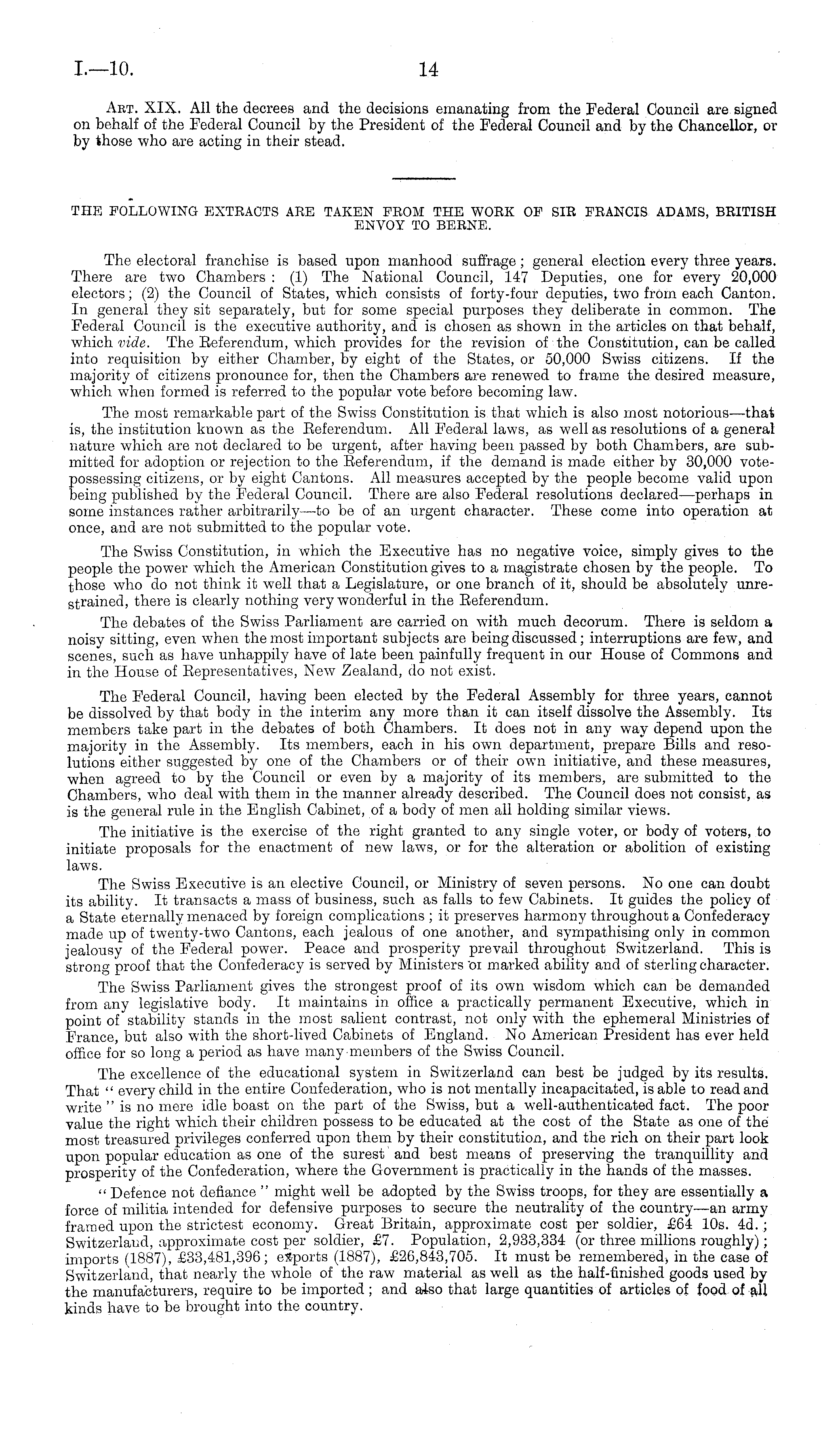 THE FOLLOWING EXTRACTS ARE TAKEN PROM THE WORK OP SIR FRANCIS ADAMS, BRITISH ENVOY TO BERNE. The electoral franchise is based upon manhood suffrage; general election every three years. There are two Chambers : (1) The National Council, 147 Deputies, one for every 20,000 electors; (2) the Council of States, which consists of forty-four deputies, two from each Canton. In general they sit separately, but for some special purposes they deliberate in common. The Federal Council is the executive authority, and is chosen as shown in the articles on that behalf, which vide. The Eeferendum, which provides for the revision of the Constitution, can be called into requisition by either Chamber, by eight of the States, or 50,000 Swiss citizens. If the majority of citizens pronounce for, then the Chambers are renewed to frame the desired measure, which when formed is referred to the popular vote before becoming law. The most remarkable part of the Swiss Constitution is that which is also most notorious—that is, the institution known as the Eeferendum. All Federal laws, as well as resolutions of a general nature which are not declared to be urgent, after having been passed by both Chambers, are submitted for adoption or rejection to the Referendum, if the demand is made either by 30,000 votepossessing citizens, or by eight Cantons. All measures accepted by the people become valid upon being published by the Federal Council. There are also Federal resolutions declared —perhaps in some instances rather arbitrarily—to be of an urgent character. These come into operation at once, and are not submitted to the popular vote. The Swiss Constitution, in which the Executive has no negative voice, simply gives to the people the power which the American Constitution gives to a magistrate chosen by the people. To those who do not think it well that a Legislature, or one branch of it, should be absolutely unrestrained, there is clearly nothing very wonderful in the Eeferendum. The debates of the Swiss Parliament are carried on with much decorum. There is seldom a noisy sitting, even when the most important subjects are being discussed; interruptions are few, and scenes, such as have unhappily have of late been painfully frequent in our House of Commons and in the House of Representatives, New Zealand, do not exist. The Federal Council, having been elected by the Federal Assembly for three years, cannot be dissolved by that body in the interim any more than it can itself dissolve the Assembly. Its' members take part in the debates of both Chambers. It does not in any way depend upon the majority in the Assembly. Its members, each in his own department, prepare Bills and resolutions either suggested by one of the Chambers or of their own initiative, and these measures, when agreed to by the Council or even by a majority of its members, are submitted to the Chambers, who deal with them in the manner already described. The Council does not consist, as is the general rule in the English Cabinet, of a body of men all holding similar views. The initiative is the exercise of the right granted to any single voter, or body of voters, to initiate proposals for the enactment of new laws, or for the alteration or abolition of existing laws. The Swiss Executive is an elective Council, or Ministry of seven persons. No one can doubt its ability. It transacts a mass of business, such as falls to few Cabinets. It guides the policy of a State eternally menaced by foreign complications ; it preserves harmony throughout a Confederacy made up of twenty-two Cantons, each jealous of one another, and sympathising only in common jealousy of the Federal power. Peace and prosperity prevail throughout Switzerland. This is strong proof that the Confederacy is served by Ministers Oi marked ability and of sterling character. The Swiss Parliament gives the strongest proof of its own wisdom which can be demanded from any legislative body. It maintains in office a practically permanent Executive, which in point of stability stands in the most salient contrast, not only with the ephemeral Ministries of France, but also with the short-lived Cabinets of England. No American President has ever held office for so long a period as have many members of the Swiss Council. The excellence of the educational system in Switzerland can best be judged by its results. That " every child in the entire Confederation, who is not mentally incapacitated, is able to read and write "is no mere idle boast on the part of the Swiss, but a well-authenticated fact. The poor value the right which their children possess to be educated at the cost of the State as one of the most treasured privileges conferred upon them by their constitution, and the rich on their part look upon popular education as one of the surest and best means of preserving the tranquillity and prosperity of the Confederation, where the Government is practically in the hands of the masses. " Defence not defiance " might well be adopted by the Swiss troops, for they are essentially a force of militia intended for defensive purposes to secure the neutrality of the country—an army framed upon the strictest economy. Great Britain, approximate cost per soldier, £64 10s. 4d. ; Switzerland, approximate cost per soldier, £7. Population, 2,933,334 (or three millions roughly); imports (1887), £33,481,396; exports (1887), £26,843,705. It must be remembered, in the case of Switzerland, that nearly the whole of the raw material as well as the half-finished goods used by the manufacturers, require to be imported ; and also that large quantities of articles of food of all kinds have to be brought into the country.