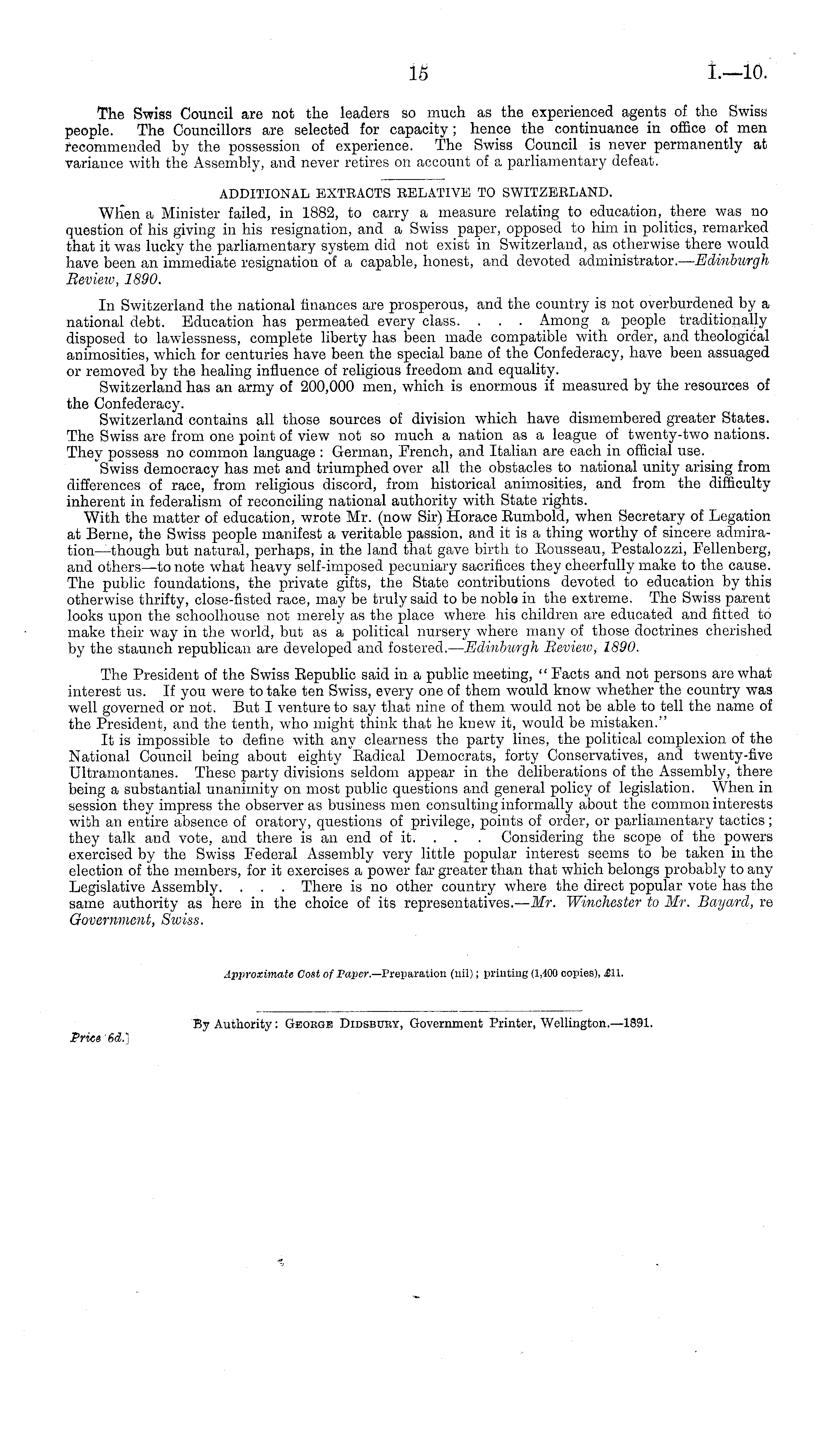 ADDITIONAL EXTRACTS RELATIVE TO SWITZERLAND. Wlien a Minister failed, in 1882, to carry a measure relating to education, there was no question of his giving in his resignation, and a Swiss paper, opposed to him in politics, remarked that it was lucky the parliamentary system did not exist in Switzerland, as otherwise there would have been an immediate resignation of a capable, honest, and devoted administrator. — Edinburgh Bevieio, 1890. In Switzerland the national finances are prosperous, and the country is not overburdened by a national debt. Education has permeated every class. . . . Among a people traditionally disposed to lawlessness, complete liberty has been made compatible with order, and theological animosities, which for centuries have been the special bane of the Confederacy, have been assuaged or removed by the healing influence of religious freedom and equality. Switzerland has an army of 200,000 men, which is enormous if measured by the resources of the Confederacy. Switzerland contains all those sources of division which have dismembered greater States. The Swiss are from one point of view not so much a nation as a league of twenty-two nations. They possess no common language : German, French, and Italian are each in official use. "Swiss democracy has met and triumphed over all the obstacles to national unity arising from differences of race, from religious discord, from historical animosities, and from the difficulty inherent in federalism of reconciling national authority with State rights. With the matter of education, wrote Mr. (now Sir) Horace Eumbold, when Secretary of Legation at Berne, the Swiss people manifest a veritable passion, and it is a thing worthy of sincere admiration—though but natural, perhaps, in the land that gave birth to Eousseau, Pestalozzi, Fellenberg, and others—-to note what heavy self-imposed pecuniary sacrifices they cheerfully make to the cause. The public foundations, the private gifts, the State contributions devoted to education by this otherwise thrifty, close-fisted race, may be truly said to be noble in the extreme. The Swiss parent looks upon the schoolhouse not merely as the place where his children are educated and fitted to make their way in the world, but as a political nursery where many of those doctrines cherished by the staunch republican are developed and fostered. — Edinburgh Bevieiv, 1890. The President of the Swiss Eepublic said in a public meeting, " Facts and not persons are what interest us. If you were to take ten Swiss, every one of them would know whether the country was well governed or not. But I venture to say that nine of them would not be able to tell the name of the President, and the tenth, who might think that he knew it, would be mistaken." It is impossible to define with any clearness the party lines, the political complexion of the National Council being about eighty Eadical Democrats, forty Conservatives, and twenty-five Ultramontanes. These party divisions seldom appear in the deliberations of the Assembly, there being a substantial unanimity on most public questions and general policy of legislation. When in session they impress the observer as business men consulting informally about the common interests with an entire absence of oratory, questions of privilege, points of order, or parliamentary tactics; they talk and vote, and there is an end of it. . . . Considering the scope of the powers exercised by the Swiss Federal Assembly very little popular interest seems to be taken in the election of the members, for it exercises a power far greater than that which belongs probably to any Legislative Assembly. . . . There is no other country where the direct popular vote has the same authority as here in the choice of its representatives.— Mr. Winchester to Mr. Bayard, re Government, Swiss. Approximate Cost of Paper.— Preparation (ail); printing (1,400 copies), ill.