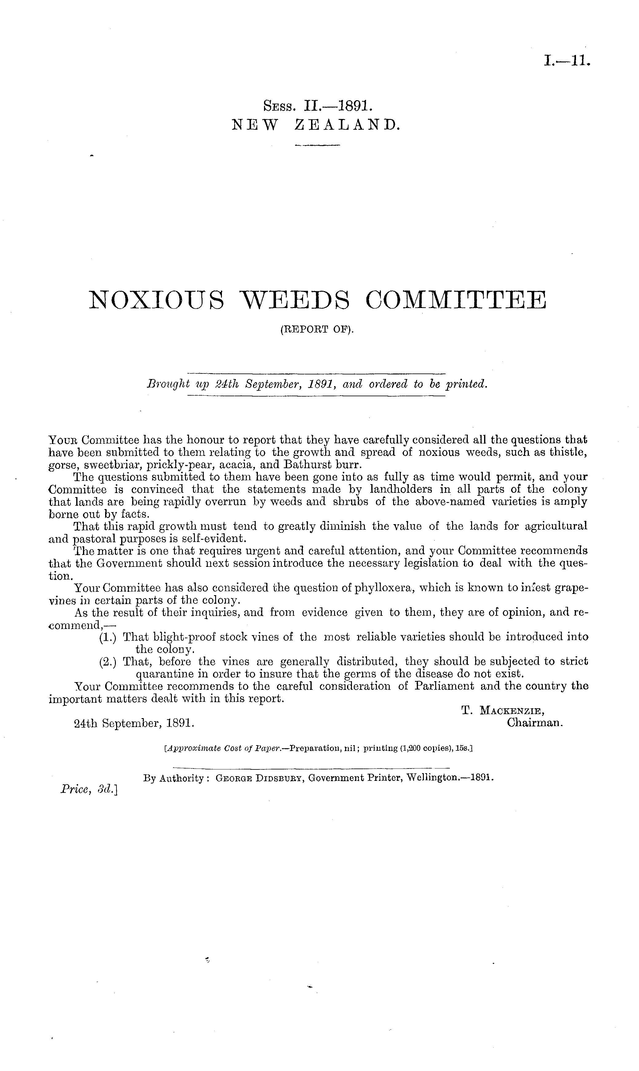 Youe Committee has the honour to report that they have carefully considered all the questions that have been submitted to them relating to the growth and spread of noxious weeds, such as thistle, gorse, sweetbriar, prickly-pear, acacia, and Bathurst burr. The questions submitted to them have been gone into as fully as time would permit, and your Committee is convinced that the statements made by landholders in all parts of the colony that lands are being rapidly overrun by weeds and shrubs of the above-named varieties is amply borne out by facts. That this rapid growth must tend to greatly diminish the value of the lands for agricultural and pastoral purposes is self-evident. The matter is one that requires urgent and careful attention, and your Committee recommends that the Government should next session introduce the necessary legislation to deal with the question. Your Committee has also considered the question of phylloxera, which is known to infest grapevines in certain parts of the colony. As the result of their inquiries, and from evidence given to them, they are of opinion, and recommend, — (1.) That blight-proof stock vines of the most reliable varieties should be introduced into the colony. (2.) That, before the vines are generally distributed, they should be subjected to strict quarantine in order to insure that the germs of the disease do not exist. Your Committee recommends to the careful consideration of Parliament and the country the important matters dealt with in this report. T. Mackenzie, 24th September, 1891. Chairman. {Approximate Cost of Paper.— Preparation, nil; printing (1,200 copies), 15s.]