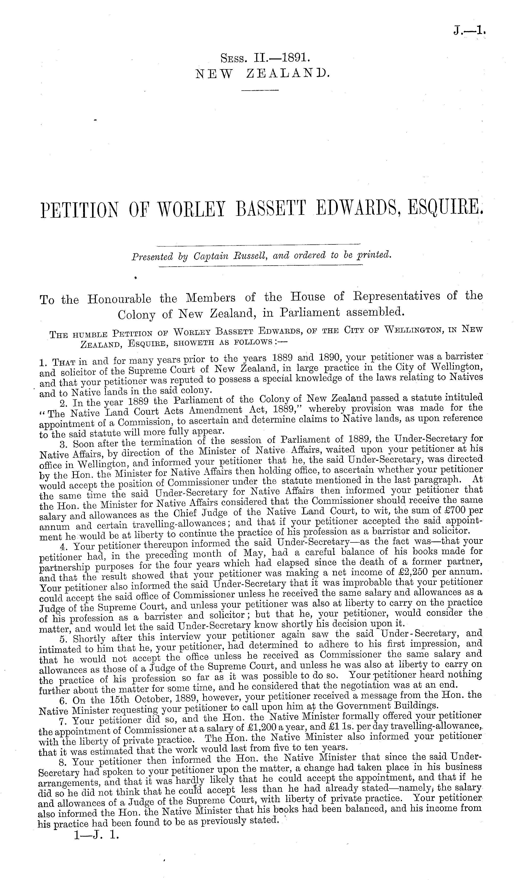 a To the Honourable the Members of the House of Kepresentatives of the Colony of New Zealand, in Parliament assembled. The humble Petition oe Woeley Bassett Edwaeds, oe the City of Wellington, in New Zealand, Esquiee, showeth as follows :— 1 That in and for many years prior to the years 1889 and 1890, your petitioner was a barrister and solicitor of the Supreme Court of New Zealand, in large practice m the City of Wellington, and that your petitioner was reputed to possess a special knowledge of the laws relating to Natives and to Native lands in the said colony. . 2 In the year 1889 the Parliament of the Colony of New Zealand passed a statute intituled " The' Native Land Court Acts Amendment Act, 1889," whereby provision was made for the appointment of a Commission, to ascertain and determine claims to Native lands, as upon reference session of Parliament of 1889, the Under-Secretary for Native Affairs by direction of the Minister of Native Affairs, waited upon your petitioner at his nffipe in Wellington and informed your petitioner that he, the said Under-Secretary, was directed by the Hon the Minister for Native Affairs then holding office, to ascertain whether your petitioner would accent the position of Commissioner under the statute mentioned m the last paragraph. At +L si me time the said Under- Secretary for Native Affairs then informed your petitioner that thl "Hon the Minister for Native Affairs considered that the Commissioner should receive the same salary and allowances as the Chief Judge of the Native Land Court, to wit the sum of £700 per annum and certain travelling-allowances; and that if your petitioner accepted the said appointment he would be at liberty to continue the practice of his profession as a barrister and solicitor. 4 Your petitioner thereupon informed the said Under-Secretary—as the fact was—that your petitioner had, in the preceding month of May had a careful balance of his books made for nurnoses for the four years which had elapsed since the death of a former partner, and that the result showed that your petitioner was making a net income of £2,250 per annum. Your petitioner also informed the said Under-Secretary that it was improbable that your petitioner could accent the said office of Commissioner unless he received the same salary and allowances as a TrXe of the Supreme Court, and unless your petitioner was also at liberty to carry on the practice of his profession as a barrister and solicitor; but that he, your petitioner, would consider the matter, and would let the said Under-Secretary know shortly his decision upon it--5 Shortly after this interview your petitioner again saw the said Under-Secretary, and intimated to him that he, your petitioner, had determined to adhere to his first impression, and that he would not accept the office unless he received as Commissioner the same salary and allowances as those of a Judge of the Supreme Court, and unless he was also at liberty to carry on the practice of his profession so far as it was possible to do so. Your petitioner heard nothing further about the matter for some time, and he considered that the negotiation was at an end. 6 On the 15th October, 1889, however, your petitioner received a message from the Hon. the Native Minister requesting your petitioner to call upon him at the Government Buildings. 7 You?pSnS didy so, and the Hon. the Native Minister formally offered your petitioner the appointment of Commissioner at a salary of £1,200 a year and £1 Is per day travelling-allowance,, with the liberty of private practice. The Hon. the Native Minister also informed your petitioner that it was estimated that the work would last from five to ten years 8 Your petitioner then informed the Hon. the Native Minister that since the said UnderSecretary had spoken to your petitioner upon the matter, a change had taken place m his'business arrangements, and that it was hardly likely that he could accept the appointment, and that if he did so he did iiot think that he could accept less than he had already stated—namely, the salary and allowances of a Judge of the Supreme Court with liberty of private practice. Your petitioner also informed the Hon. the Native Minister that his books had been balanced, and his income from his practice had been found to be as previously stated. I—J. 1.