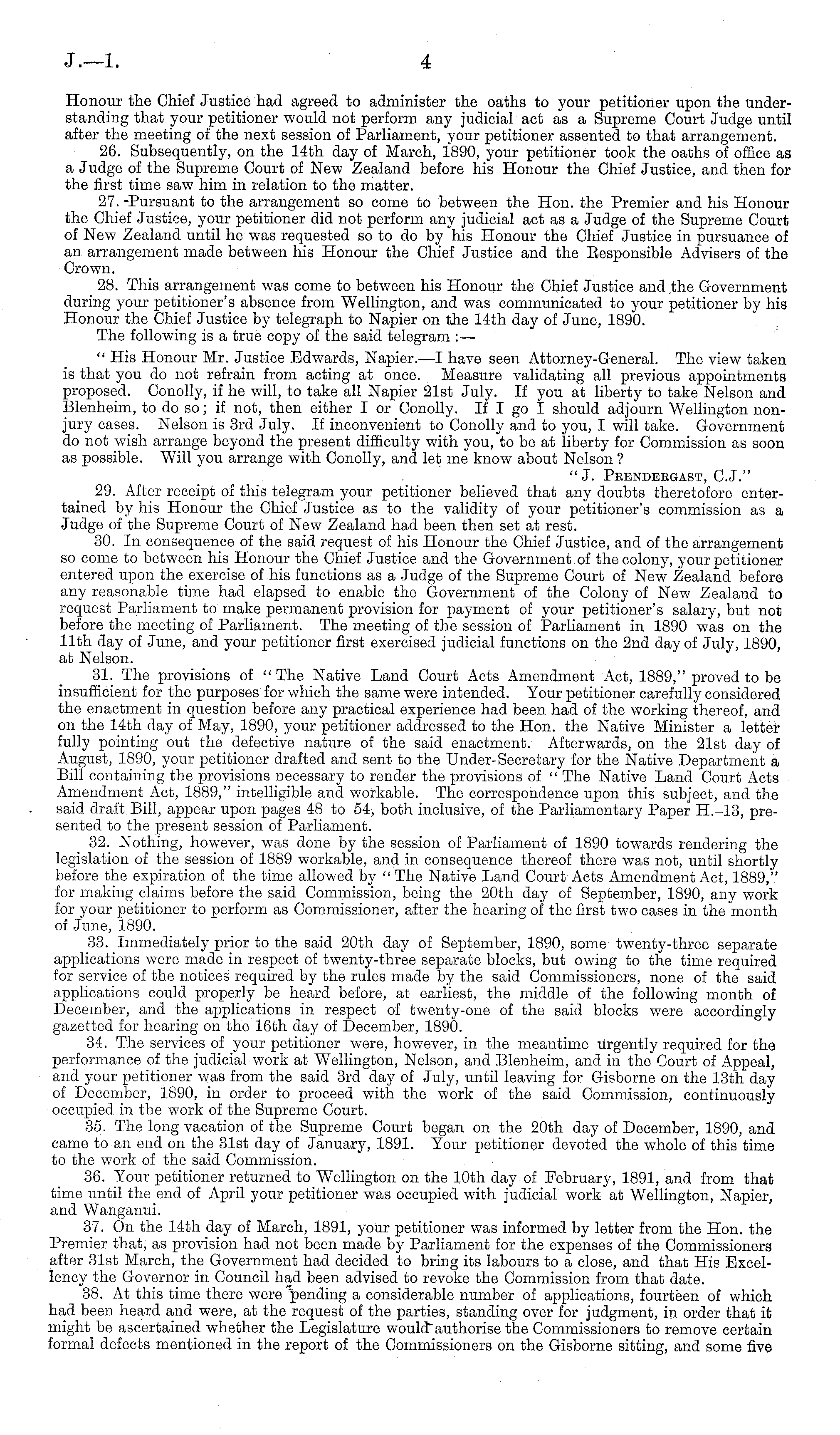 Honour the Chief Justice had agreed to administer the oaths to your petitioner upon the understanding that your petitioner would not perform any judicial act as a Supreme Court Judge until after the meeting of the next session of Parliament, your petitioner assented to that arrangement. 26. Subsequently, on the 14th day of March, 1890, your petitioner took the oaths of office as a Judge of the Supreme Court of New Zealand before his Honour the Chief Justice, and then for the first time saw him in relation to the matter. 27. -Pursuant to the arrangement so come to between the Hon. the Premier and his Honour the Chief Justice, your petitioner did not perform any judicial act as a Judge of the Supreme Court of New Zealand until he was requested so to do by his Honour the Chief Justice in pursuance of an arrangement made between his Honour the Chief Justice and the Eesponsible Advisers of the Crown. 28. This arrangement was come to between his Honour the Chief Justice and the Government during your petitioner's absence from Wellington, and was communicated to your petitioner by his Honour the Chief Justice by telegraph to Napier on the 14th day of June, 1890. The following is a true copy of the said telegram :— " His Honour Mr. Justice Edwards, Napier.—l have seen Attorney-General. The view taken is that you do not refrain from acting at once. Measure validating all previous appointments proposed. Conolly, if he will, to take all Napier 21st July. If you at liberty to take Nelson and Blenheim, to do so; if not, then either I or Conolly. If I go I should adjourn Wellington nonjury cases. Nelson is 3rd July. If inconvenient to Conolly and to you, I will take. Government do not wish arrange beyond the present difficulty with you, to be at liberty for Commission as soon as possible. Will you arrange with Conolly, and let me know about Nelson ? "J. Peendeegast, C.J." 29. After receipt of this telegram your petitioner believed that any doubts theretofore entertained by his Honour the Chief Justice as to the validity of your petitioner's commission as a •Judge of the Supreme Court of New Zealand had been then set at rest. 30. In consequence of the said request of his Honour the Chief Justice, and of the arrangement so come to between his Honour the Chief Justice and the Government of the colony, your petitioner entered upon the exercise of his functions as a Judge of the Supreme Court of New Zealand before any reasonable time had elapsed to enable the Government of the Colony of New Zealand to request Parliament to make permanent provision for payment of your petitioner's salary, but not before the meeting of Parliament. The meeting of the session of Parliament in 1890 was on the 11th day of June, and your petitioner first exercised judicial functions on the 2nd day of July, 1890, at Nelson. 31. The provisions of "The Native Land Court Acts Amendment Act, 1889," proved to be insufficient for the purposes for which the same were intended. Your petitioner carefully considered the enactment in question before any practical experience had been had of the working thereof, and on the 14th day of May, 1890, your petitioner addressed to the Hon. the Native Minister a letter fully pointing out the defective nature of the said enactment. Afterwards, on the 21st day of August, 1890, your petitioner drafted and sent to the Under-Secretary for the Native Department a Bill containing the provisions necessary to render the provisions of " The Native Land Court Acts Amendment Act, 1889," intelligible and workable. The correspondence upon this subject, and the said draft Bill, appear upon pages 48 to 54, both inclusive, of the Parliamentary Paper H.-13, presented to the present session of Parliament. 32. Nothing, however, was done by the session of Parliament of 1890 towards rendering the legislation of the session of 1889 workable, and in consequence thereof there was not, until shortly before the expiration of the time allowed by " The Native Land Court Acts Amendment Act, 1889," for making claims before the said Commission, being the 20th day of September, 1890, any work for your petitioner to perform as Commissioner, after the hearing of the first two cases in the month of June, 1890. 33. Immediately prior to the said 20th day of September, 1890, some twenty-three separate applications were made in respect of twenty-three separate blocks, but owing to the time required for service of the notices required by the rules made by the said Commissioners, none of the said applications could properly be heard before, at earliest, the middle of the following month of December, and the applications in respect of twenty-one of the said blocks were accordingly gazetted for hearing on the 16th day of December, 1890. 34. The services of your petitioner were, however, in the meantime urgently required for the performance of the judicial work at Wellington, Nelson, and Blenheim, and in the Court of Appeal, and your petitioner was from the said 3rd day of July, until leaving for Gisborne on the 13th day of December, 1890, in order to proceed with the work of the said Commission, continuously occupied in the work of the Supreme Court. 35. The long vacation of the Supreme Court began on the 20th day of December, 1890, and came to an end on the 31st day of January, 1891. Your petitioner devoted the whole of this time to the work of the said Commission. 36. Your petitioner returned to Wellington on the 10th day of February, 1891, and from that time until the end of April your petitioner was occupied with judicial work at Wellington, Napier, and Wanganui. 37. On the 14th day of March, 1891, your petitioner was informed by letter from the Hon. the Premier that, as provision had not been made by Parliament for the expenses of the Commissioners after 31st March, the Government had decided to bring its labours to a close, and that His Excellency the Governor in Council had been advised to revoke the Commission from that date. 38. 