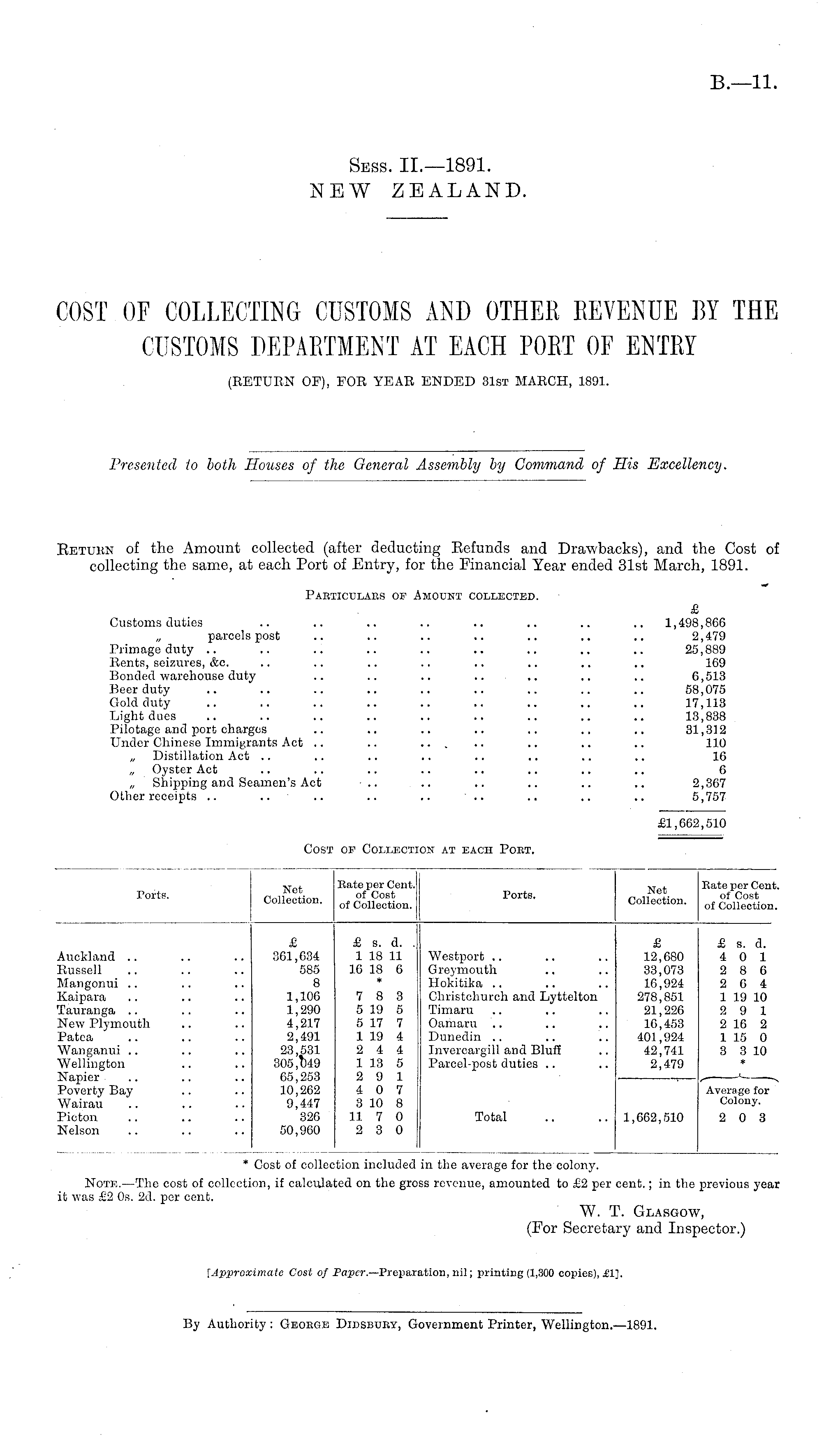 Eetukn of the Amount collected (after deducting Eefunds and Drawbacks), and the Cost of collecting the same, at each Port of Entry, for the Financial Year ended 31st March, 1891. Pabtictjlaks of Amount collected. £ Customs duties .. .. .. .. .. .. .. .. 1,498,866 parcels post .. .. .. .. .. .. .. 2,479 Primage duty .. .. .. .. .. .. .. .. .. 25,889 Rents, seizures, &c. .. .. .. .. .. .. .. .. 169 Bonded warehouse duty .. .. .. .... .. .. 6,513 Beer duty .. .. .. .. .. .. .. .. .. 58,075 Gold duty .. .. .. .. .. .. .. .. .. 17,113 Light does .. .. .. .. .. .. .. .. .. 13,838 Pilotage and port charges .. .. .. .. .. .. .. 31,312 Under Chinese Immigrants Act .. .. ... .. .. .. .. 110 „ Distillation Act .. .. .. .. .. .. .. .. 16 Oyster Act .. .. .. .. .. .. .. .. 6 Snipping and Seamen's Act .. .. .. .. .. .. 2,367 Other receipts .. .. .. .. .. • .. .. .. .. 5,757 £1,662,510