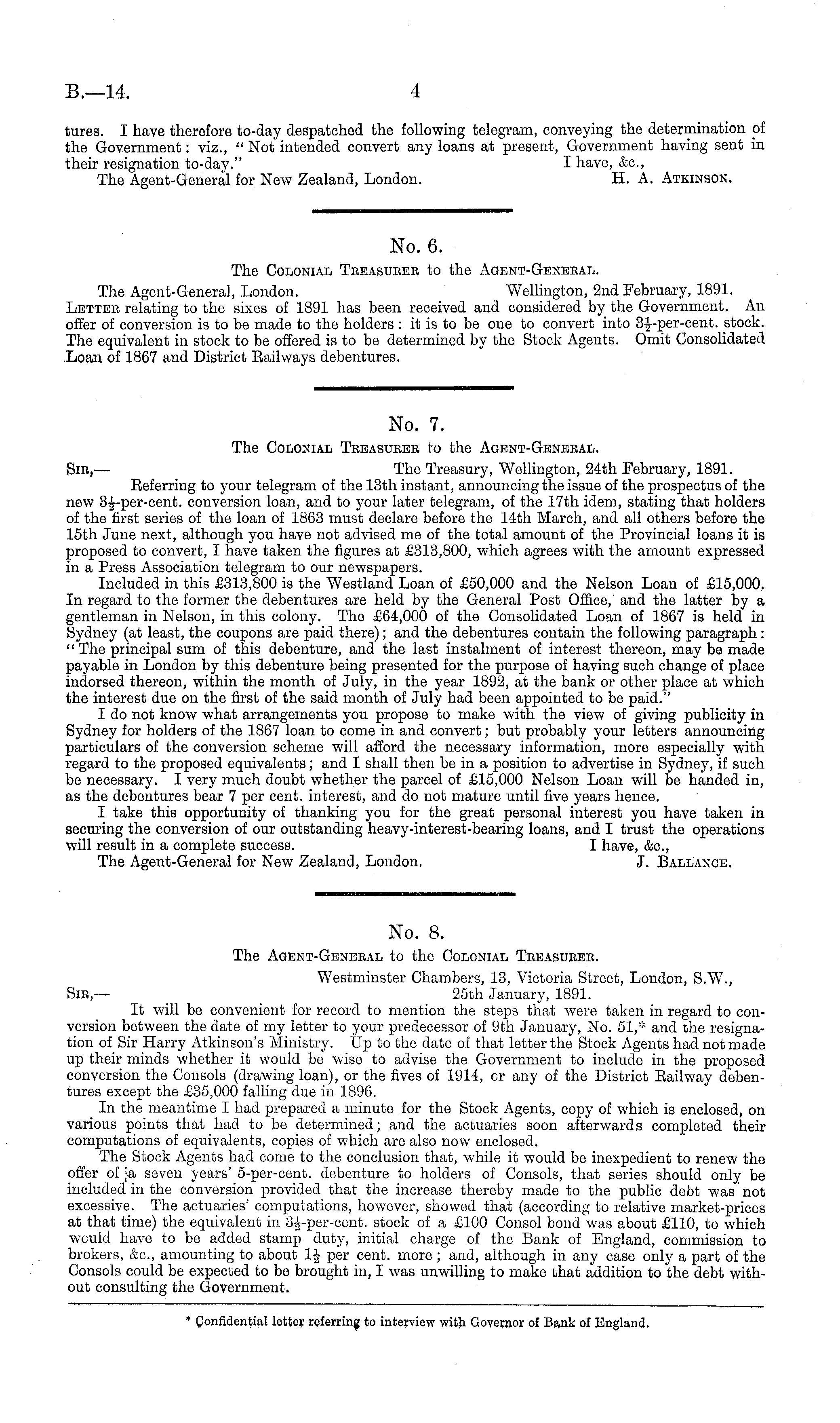 No. 7. The Colonial Treasurer to the Agent-General. Sib,— The Treasury, Wellington, 24th February, 1891. Beferring to your telegram of the 13th instant, announcing the issue of the prospectus of the new 3-J-per-cent. conversion loan, and to your later telegram, of the 17th idem, stating that holders of the first series of the loan of 1863 must declare before the 14th March, and all others before the 15th June next, although you have not advised me of the total amount of the Provincial loans it is proposed to convert, I have taken the figures at £313,800, which agrees with the amount expressed in a Press Association telegram to our newspapers. Included in this £313,800 is the Westland Loan of £50,000 and the Nelson Loan of £15,000. In regard to the former the debentures are held by the General Post Office, and the latter by a gentleman in Nelson, in this colony. The £64,000 of the Consolidated Loan of 1867 is held in Sydney (at least, the coupons are paid there); and the debentures contain the following paragraph: " The principal sum of this debenture, and the last instalment of interest thereon, may be made payable in London by this debenture being presented for the purpose of having such change of place indorsed thereon, within the month of July, in the year 1892, at the bank or other place at which the interest due on the first of the said month of July had been appointed to be paid." I do not know what arrangements you propose to make with the view of giving publicity in Sydney for holders of the 1867 loan to come in and convert; but probably your letters announcing particulars of the conversion scheme will afford the necessary information, more especially with regard to the proposed equivalents; and I shall then be in a position to advertise in Sydney, if such be necessary. I very much doubt whether the parcel of £15,000 Nelson Loan will be handed in, as the debentures bear 7 per cent, interest, and do not mature until five years hence. I take this opportunity of thanking you for the great personal interest you have taken in securing the conversion of our outstanding heavy-interest-bearing loans, and I trust the operations will result in a complete success. I have, &c, The Agent-General for New Zealand, London. J. Ballance.