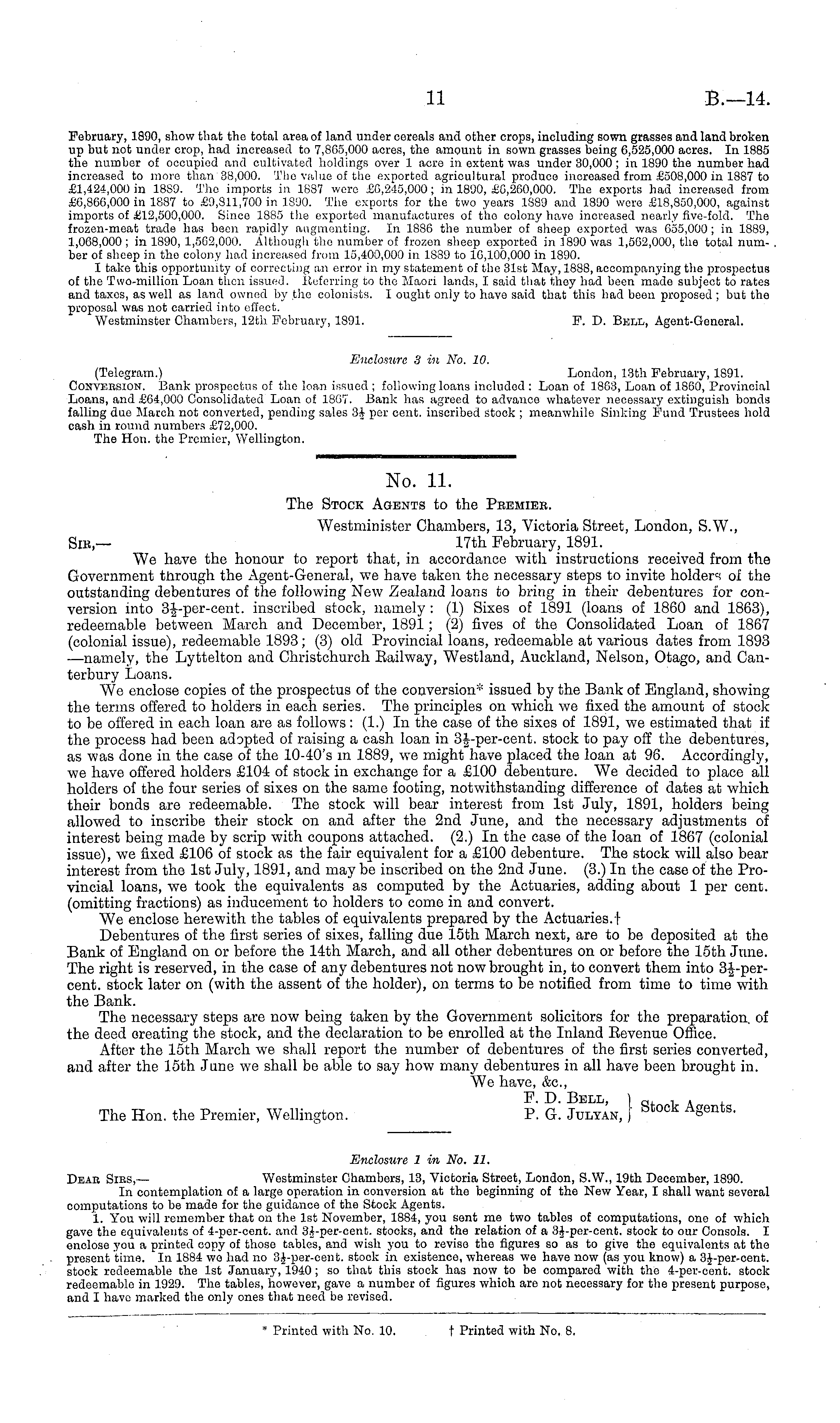 Enclosure 3 in No. 10. (Telegram.) London, 13th February, 1891. Conversion. Bank prospectus of the loan issued ; following loans included : Loan of 1803, Loan of 1860, Provincial Loans, and £64,000 Consolidated Loan of 1867. Bank has agreed to advance whatever necessary extinguish bonds falling duo March not converted, pending sales 34 per cent, inscribed stock ; meanwhile Sinking Fund Trustees hold cash in round numbers £72,000. The Hon. the Premier, Wellington.