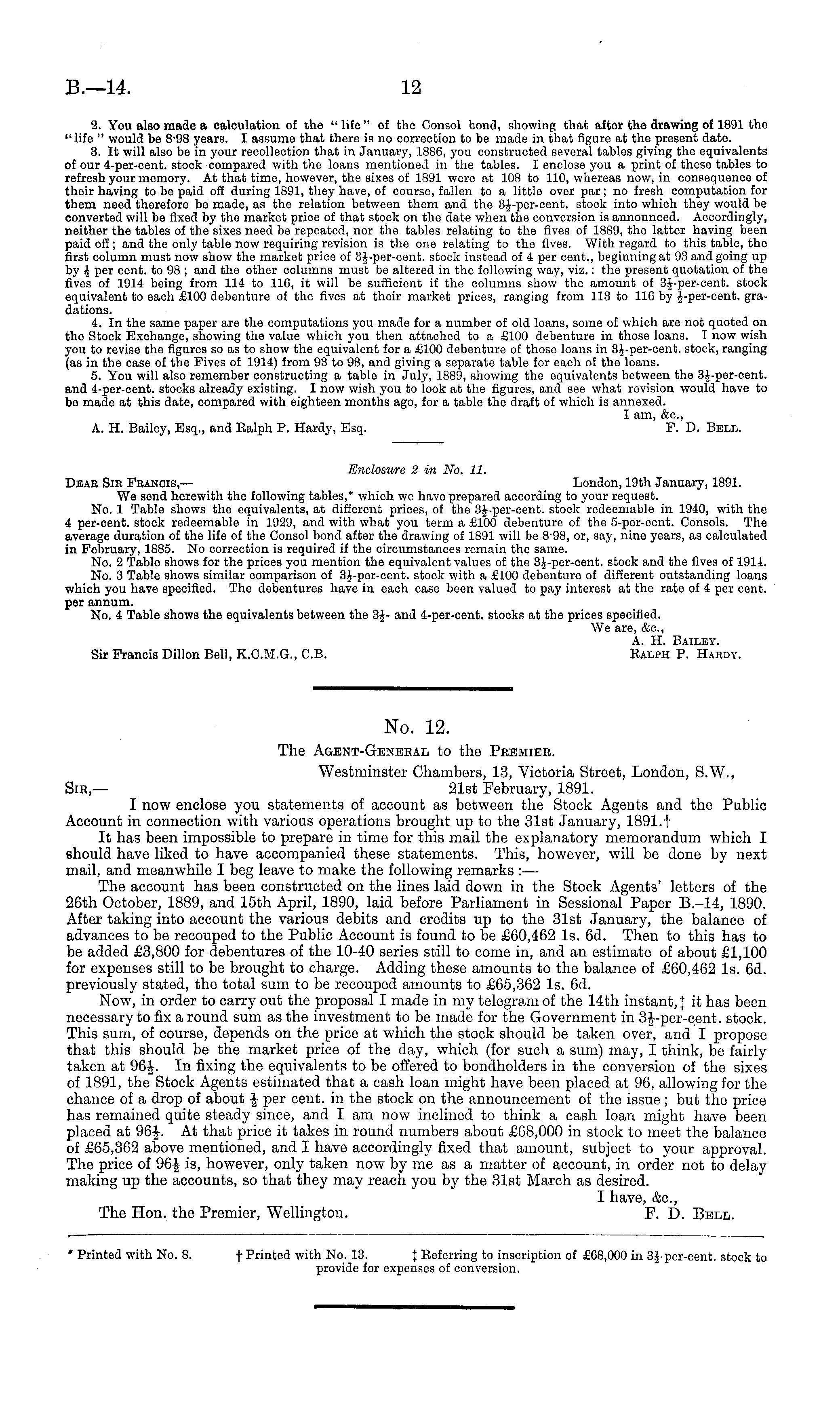 Enclosure 2 in No. 11. Dear Sir Francis, — London, 19th January, 1891. We send herewith the following tables,* which we have prepared according to your request. No. 1 Table shows the equivalents, at different prices, of the 34-per-cent. stock redeemable in 1940, with tho 4 per-cent. stock redeemable in 1929, and with what you term a £100 debenture of the 5-per-cent. Consols. The average duration of the life of the Consol bond after the drawing of 1891 will be 8-98, or, say, nine years, as calculated in February, 1885. No correction is required if the circumstances remain tho same. No. 2 Table shows for the prices you mention the equivalent values of the 34-per-cent. stock and the fives of 1911. No. 3 Table shows similar comparison of 34-per-cent. stock with a £100 debenture of different outstanding loans which you have specified. The debentures have in each case been valued to pay interest at the rate of 4 per cent. per annum. No. 4 Table shows the equivalents between the 34- and 4-per-cent. stocks at the prices specified. We are, &c, A. H. Bailey. Sir Francis Dillon Bell, K.C.M.G., C.B. Ralph P. Hardy.