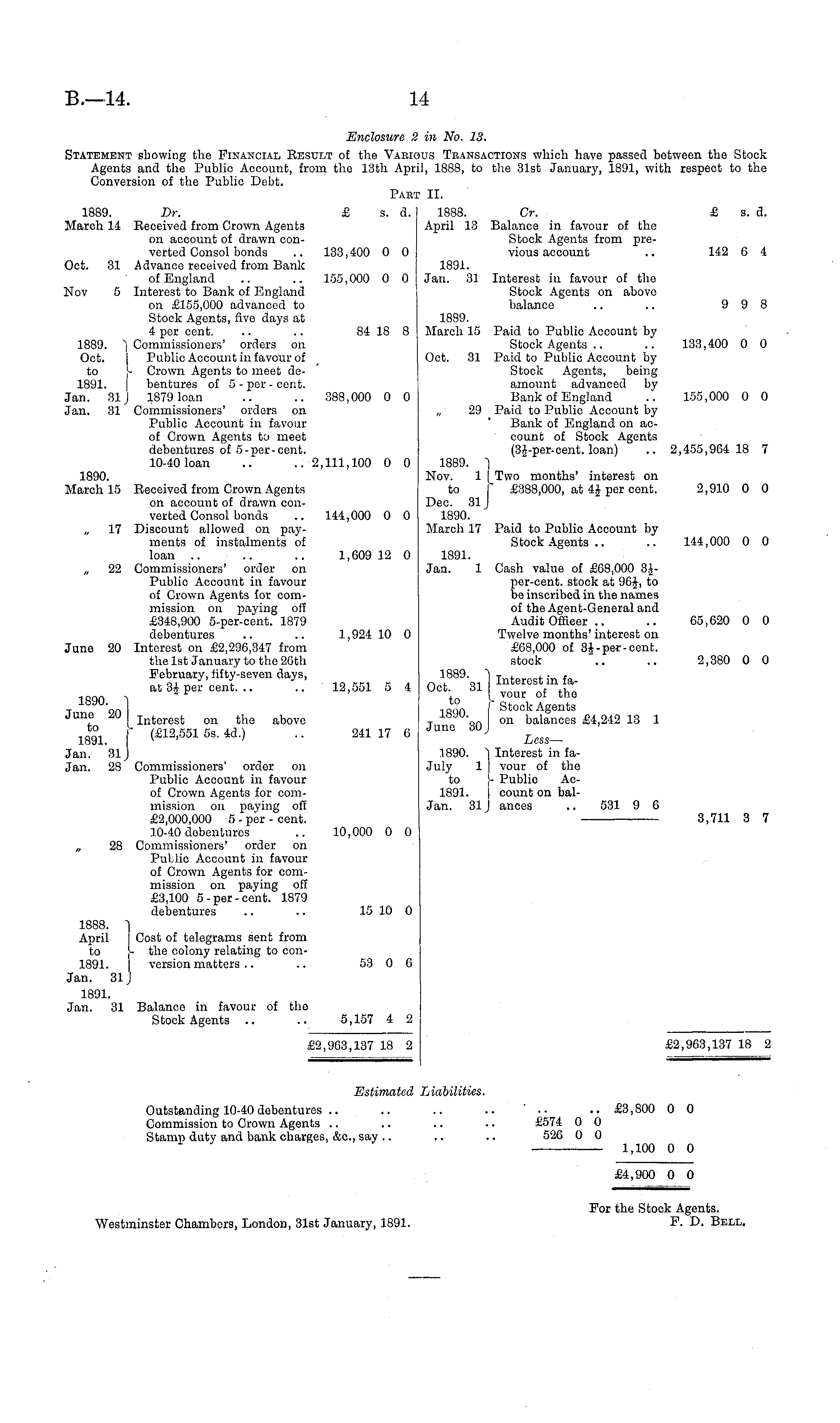 Enclosure 2 in No. 13. Statement showing the Financial Result of the Various Transactions which have passed between the Stock Agents and the Public Account, from the 13th April, 1888, to the 31st January, 1891, with respect to the Conversion of the Public Debt. Part 11. 1889. Dr. £ s. d. 1888. Cr. £ s. d. March 14 Received from Crown Agent 3 April 13 Balance in favour of the on account of drawn con- Stock Agents from preverted Consol bonds .. 133,400 0 0 vious account .. 142 6 4 Oct. 31 Advance received from Bank 1891. of England .. .. 155,000 0 0 Jan. 31 Interest in favour of the Nov 5 Interest to Bank of England Stock Agents on above on £155,000 advanced to balance .. .. 9 9 8 Stock Agents, five days at 1889. 4 per cent. .. .. 84 18 8 March 15 Paid to Public Account by 1889. ] Commissioners' orders on Stock Agents .. .. 133,400 0 0 Oct. Public Account in favour of Oct. 31 Paid to Public Account by to [- Crown Agents to meet de- Stock Agents, being 1891. bentures of 5 - per - cent. amount advanced by Jan. 31J 1879 loan .. .. 388,000 0 0 Bank of England .. 155,000 0 0 Jan. 31 Commissioners' orders on „ 29 Paid to Public Account by Public Account in favour ' Bank of England on acof Crown Agents to meet count of Stock Agents debentures of 5-per-cent. (34-per-cent. loan) .. 2,455,964 18 7 10-40 loan .. ..2,111,100 0 0 1889. 1 1890. Nov. 1 [ Two months' interest on March 15 Received from Crown Agents to £388,000, at 44 per cent. 2,910 0 0 on account of drawn con- Deo. 31J verted Consol bonds .. 144,000 0 0 1890. 17 Discount allowed on pay- March 17 Paid to Public Account by ments of instalments of Stock Agents .. .. 144,000 0 0 loan .. .. .. 1,009 12 0 1891. „ 22 Commissioners' order on Jan. 1 Cash value of £68,000 3-J-Public Account in favour per-cent. stock at 964, *° of Crown Agents for com- be inscribed in the names mission on paying off of the Agent-General and £348,900 5-per-cent. 1879 Audit Officer .. .. 65,620 0 0 debentures .. .. 1,924 10 0 Twelve months'interest on June 20 Interest on £2,296,347 from £68,000 of 34-per-cent. the Ist January to the 26th stock .. .. 2,380 0 0 February, fifty-seven days, 1889 } j . f IQnn , 34 per cent 12,551 5 4 Oct 31 I vollr of the t on iHc?n ["Stock Agents Juno ju j Interegfc on the above oo on balances £4,242 13 1 r (£12,551 ss. 4d.) .. 24117 6 June dU J Lgss _ Jan. .31J 1890. ] Interest in faJan. 28 Commissioners' order on July 1 j your of the Public Account in favour to j- Public Acof Crown Agents for com- 1891. | count on balmission on paying off Jan. 31J ances .. 531 9 6 £2,000,000 5-per-cent. 3,711 3 7 10-40 debentures .. 10,000 0 0 „ 28 Commissioners' order on Public Account in favour of Crown Agents for commission on paying off £3,100 5-per-cent. 1879 debentures .. .. 15 10 0 1888. 1 April Cost of telegrams sent from to - the colony relating to con--1891. version matters .. .. 53 0 0 Jan. 31J 1891. Jan. 31 Balance in favour of the Stock Agents .. .. 5,157 4 2 £2,963,137 18 2 £2,903,137 18 2 Estimated Liabilities. Outstanding 10-40 debentures .. .. .. .. ' .. .. £3,800 0 0 Commission to Crown Agents .. .. .. .. £374 0 O Stamp duty and bank charges, &c, say .. .. .. 520 0 0 1,100 0 0 £4,900 0 0 For the Stock Agents. Westminster Chambers, London, 31st January, 1891. F. D. Bell.