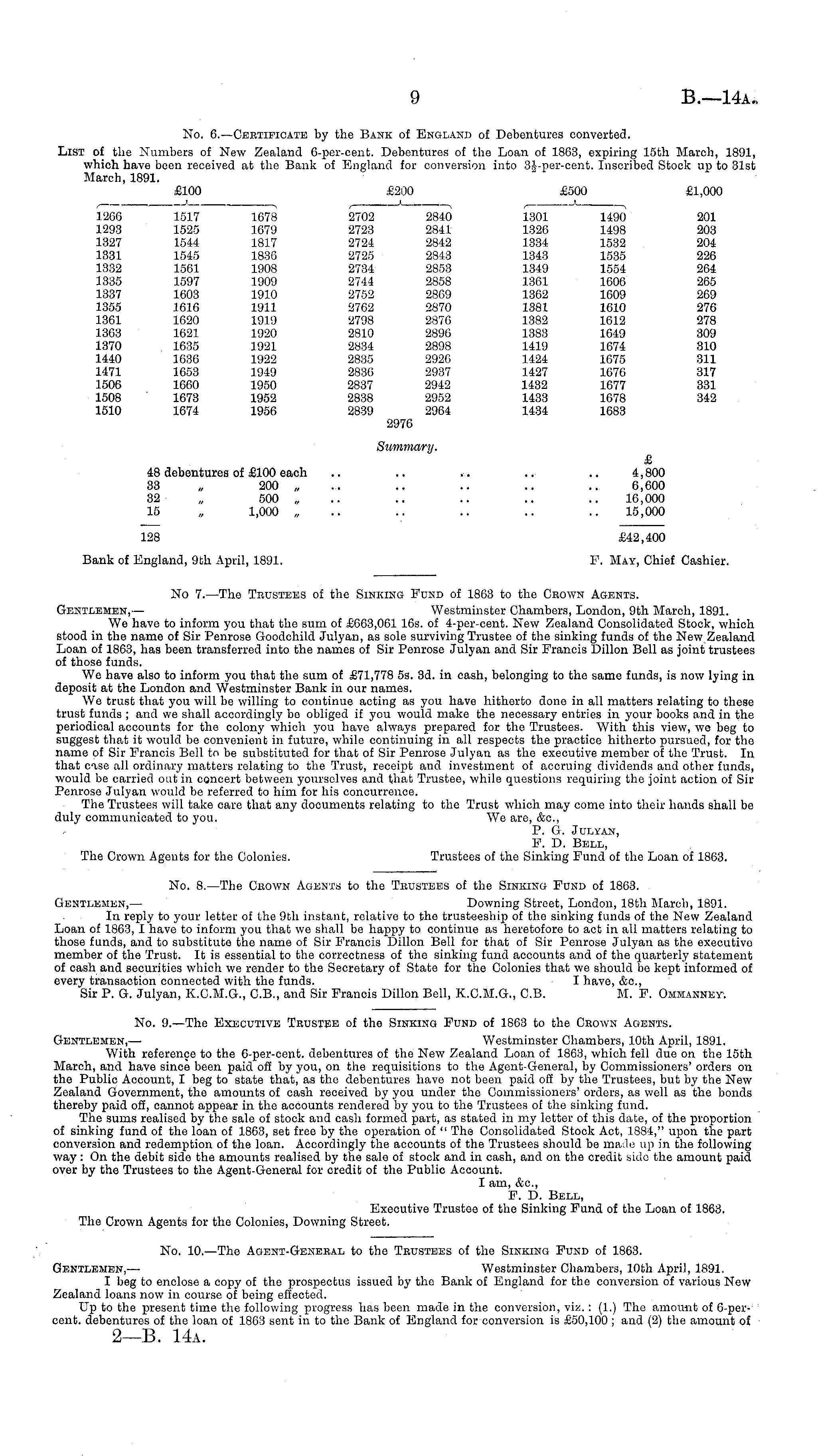 No. B.—The Cbown Agents to the Trustees of the Sinking Fund of 1863. Gentlemen, — Downing Street, London, 18th March, 1891. In reply to your letter of the 9th instant, relative to the trusteeship of the sinking funds of the New Zealand Loan of 1863, I have to inform you that wo shall be happy to continue as heretofore to act in all matters relating to those funds, and to substitute the name of Sir Francis Dillon Bell for that of Sir Penrose Julyan as the executive member of the Trust. It is essential to the correctness of the sinking fund accounts and of the quarterly statement of cash and securities which wo render to the Secretary of State for the Colonies that we should be kept informed of every transaction connected with the funds. I have, &c, Sir P. G. Julyan, K.C.M.G., C.8., and Sir Francis Dillon Bell, K.C.M.G., C.B. M. F. Omhanney.