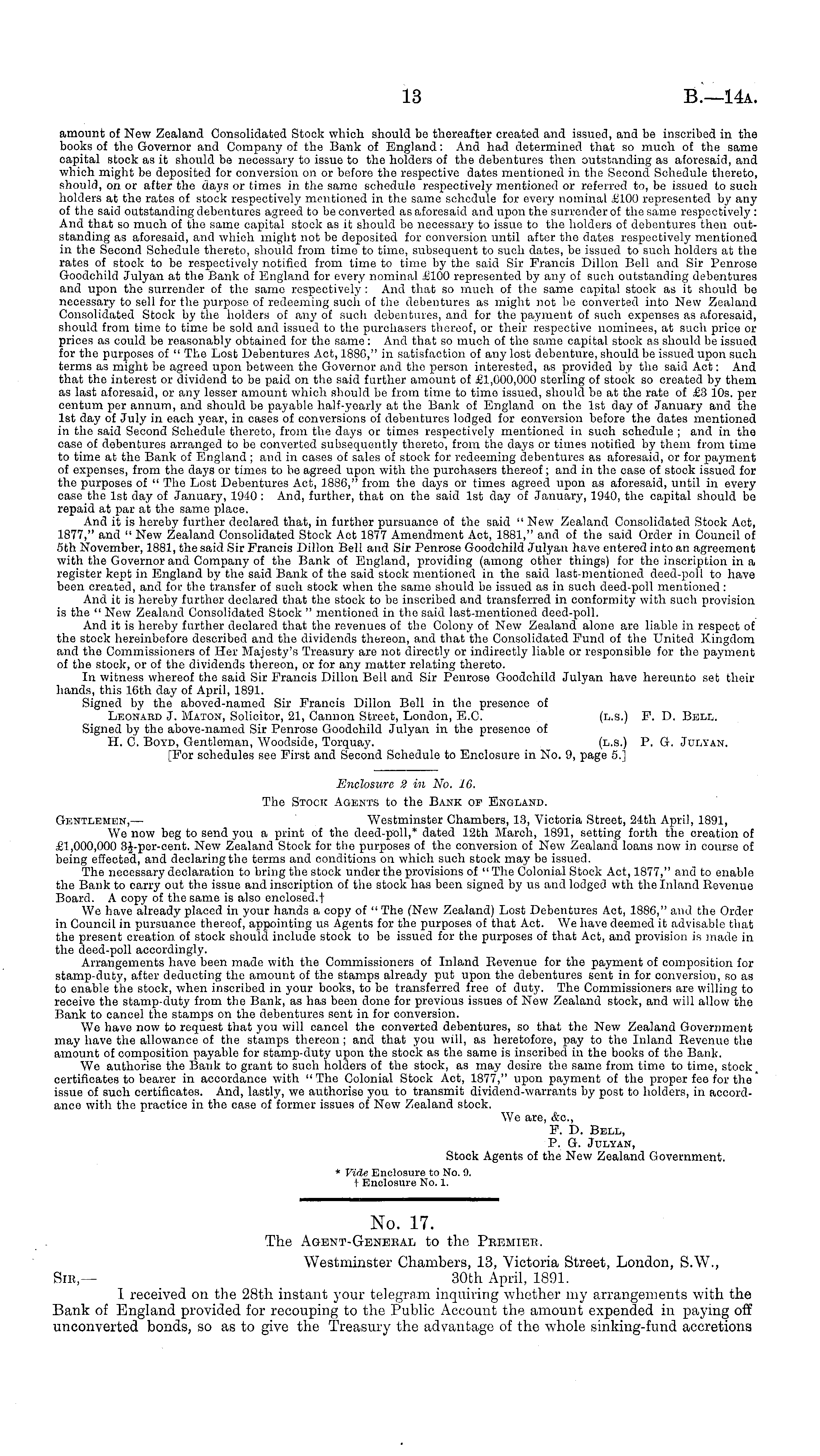 No. 17. The Agent-Genekal to the Premier. Westminster Chambers, 13, Victoria Street, London, S.W., Sir,— 30th April, 1891. 1 received on the 28th instant your telegram inquiring whether my arrangements with the Bank of England provided for recouping to the Public Account the amount expended in paying off unconverted bonds, so as to give the Treasury the advantage of the whole sinking-fund accretions