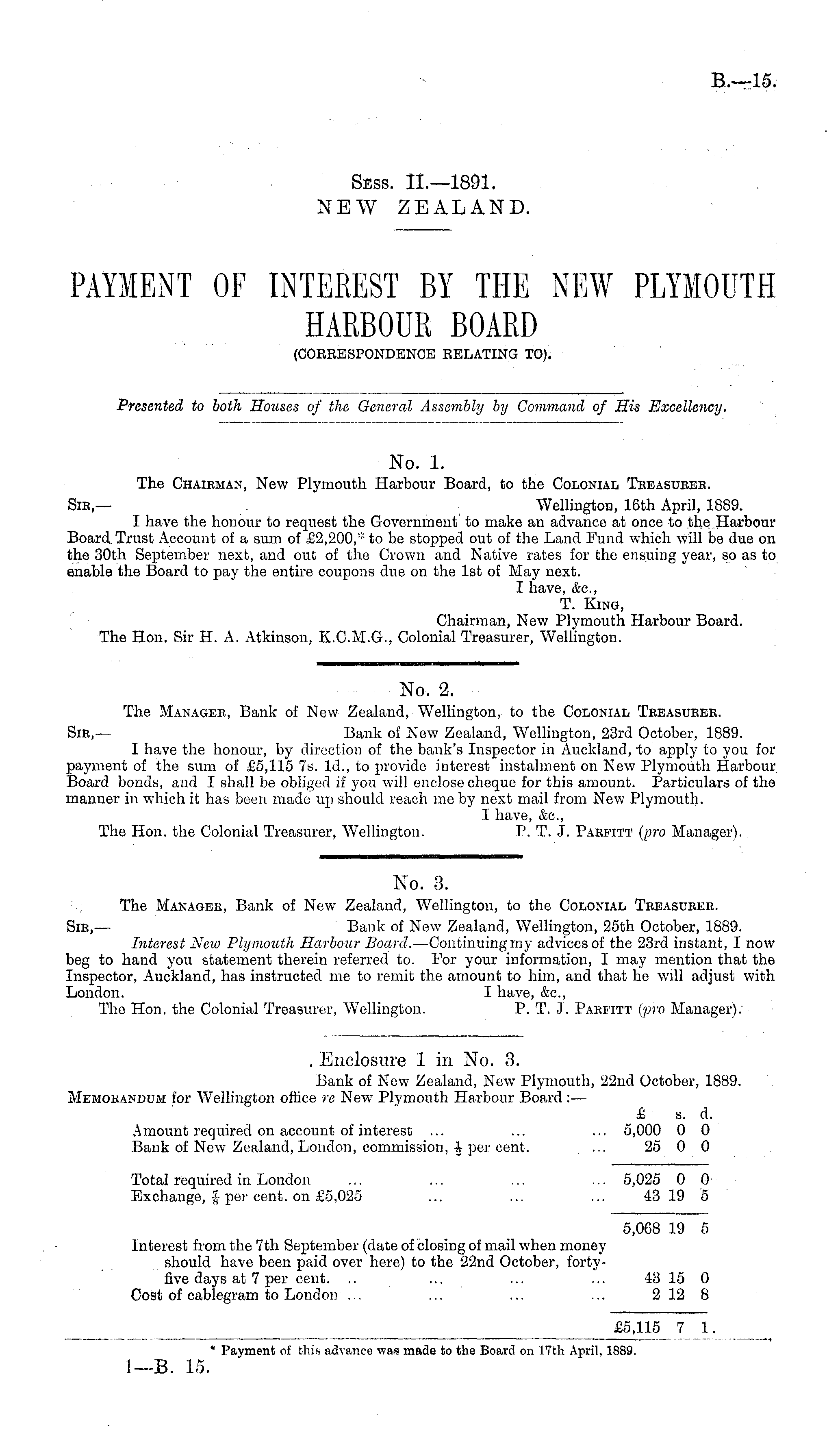 No. 2. The Manages, Bank of New Zealand, Wellington, to the Colonial Teeasueee. Sib,— Bank of New Zealand, Wellington, 23rd October, 1889. I have the honour, by direction of the bank's Inspector in Auckland, to apply to you for payment of the sum of £5,115 7s. Id., to provide interest instalment on New Plymouth Harbour Board bonds, and I shall be obliged if you will enclose cheque for this amount. Particulars of the manner in which it has been made up should reach me by next mail from New Plymouth. I have, &c, The Hon. the Colonial Treasurer, Wellington. P. T. J. Paefitt (pro Manager).