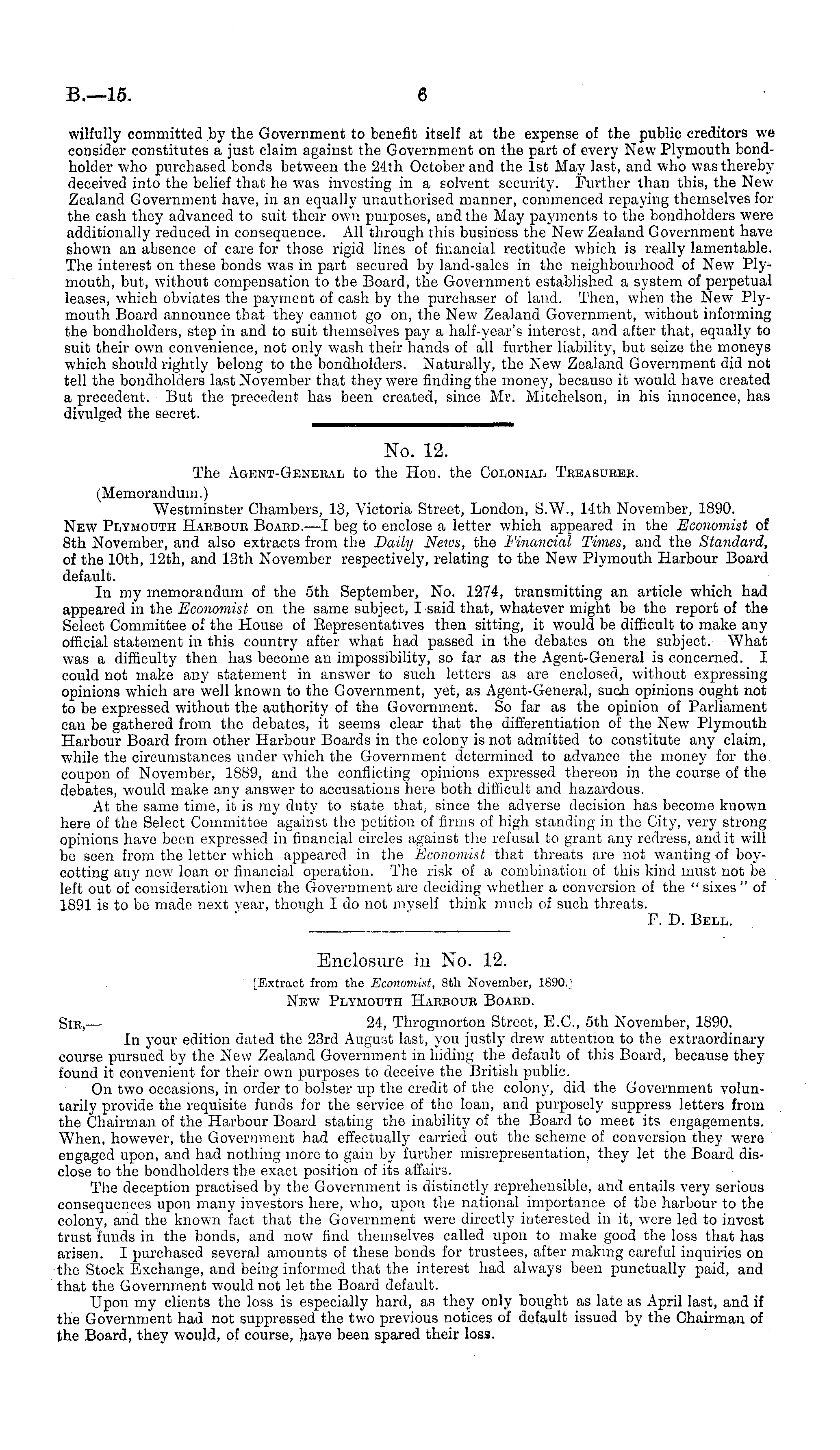 Enclosure in No. 12. [Extract from the Economist, Bth November, 1890.; New Plymouth Haeboub Boaed. Sic,— 24, Throgmorton Street, E.G., sth November, 1890. In your edition dated the 23rd August last, you justly drew attention to the extraordinary course pursued by the New Zealand Government in biding the default of this Board, because they found it convenient for their own purposes to deceive the British public. On two occasions, in order to bolster up the credit of the colony, did the Government voluntarily provide the requisite funds for the service of the loan, and purposely suppress letters from the Chairman of the Harbour Board stating the inability of the Board to meet its engagements. When, however, the Government had effectually carried out the scheme of conversion they were engaged upon, and had nothing more to gain by further misrepresentation, they let the Board disclose to the bondholders the exact position of its affairs. The deception practised by the Government is distinctly reprehensible, and entails very serious consequences upon many investors here, who, upon the national importance of the harbour to the colony, and the known fact that the Government were directly interested in it, were led to invest trust funds in the bonds, and now find themselves called upon to make good the loss that has arisen. I purchased several amounts of these bonds for trustees, after making careful inquiries on the Stock Exchange, and being informed that the interest had always been punctually paid, and that the Government would not let the Board default. Upon my clients the loss is especially hard, as they only bought as late as April last, and if the Government had not suppressed the two previous notices of default issued by the Chairman of the Board, they would, of course, have been spared their loss.