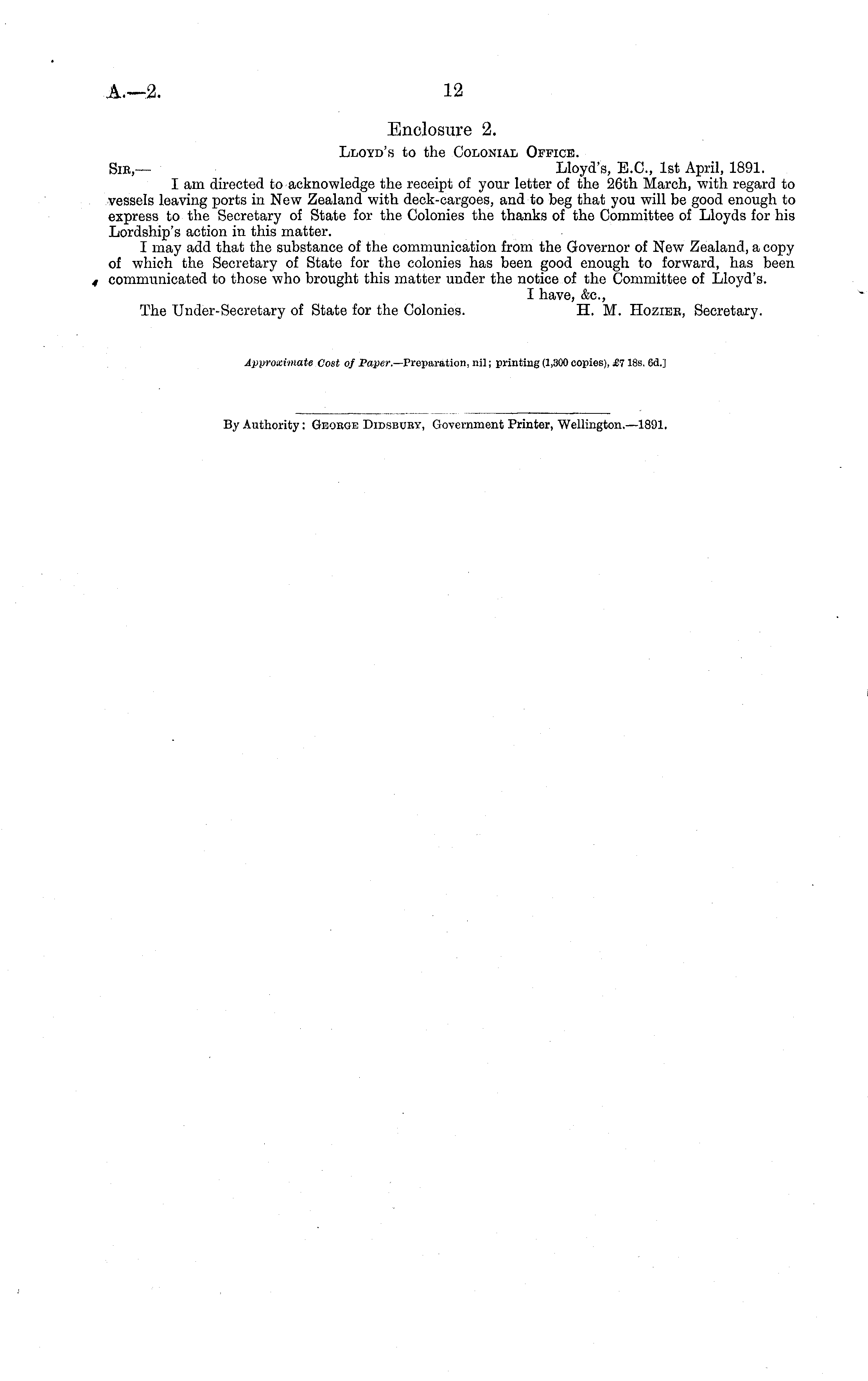 Enclosure 2. Lloyd's to the Colonial Office. Sib— Lloyd's, 8.C., Ist April, 1891. I am directed to acknowledge the receipt of your letter of the 26th March, with regard to vessels leaving ports in New Zealand with deck-cargoes, and to beg that you will be good enough to express to the Secretary of State for the Colonies the thanks of the Committee of Lloyds for his Lordship's action in this matter. I may add that the substance of the communication from the Governor of New Zealand, a copy of which the Secretary of State for the colonies has been good enough to forward, has been 4 communicated to those who brought this matter under the notice of the Committee of Lloyd's. I have, &c, The Under-Secretary of State for the Colonies. H. M. Hoziee, Secretary. Approximate Cost of Paper.— Preparation, nil; printing (1,300 copies), £1 18s. 6d.]