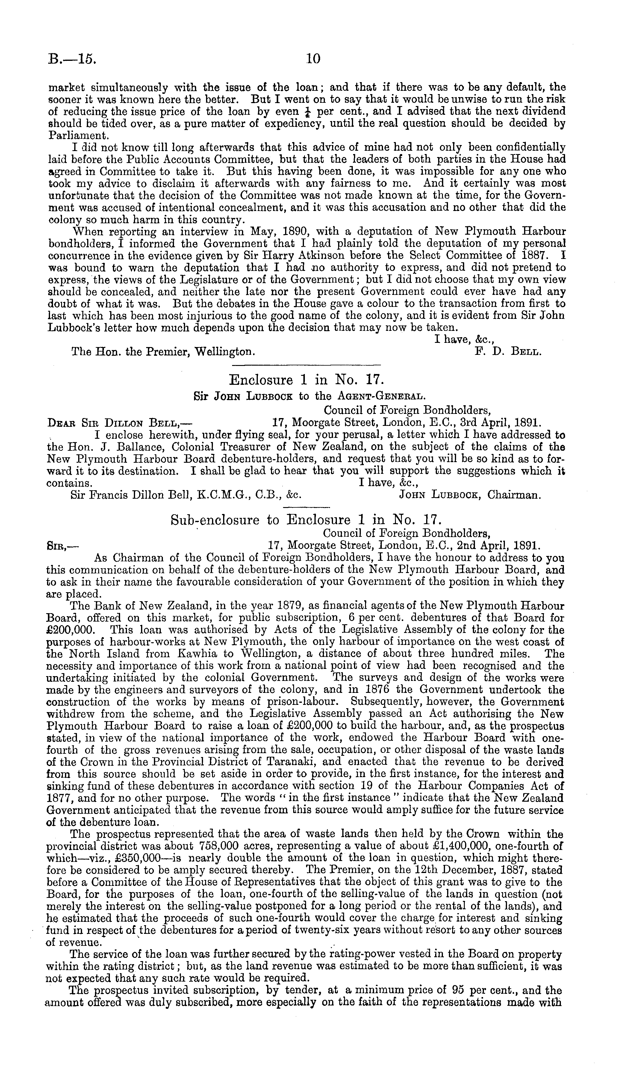 Sub-enclosure to Enclosure 1 in No. 17. Council of Foreign Bondholders, Sib, — 17, Moorgate Street, London, E.C., 2nd April, 1891. As Chairman of the Council of Foreign Bondholders, I have the honour to address to you this communication on behalf of the debenture-holders of the New Plymouth Harbour Board, and to ask in their name the favourable consideration of your Government of the position in which they are placed. The Bank of New Zealand, in the year 1879, as financial agents of the New Plymouth Harbour Board, offered on this market, for public subscription, 6 per cent, debentures of that Board for £200,000. This loan was authorised by Acts of the Legislative Assembly of the colony for the purposes of harbour-works at New Plymouth, the only harbour of importance on the west coast of the North Island from Kawhia to Wellington, a distance of about three hundred miles. The necessity and importance of this work from a national point of view had been recognised and the undertaking initiated by the colonial Government. The surveys and design of the works were made by the engineers and surveyors of the colony, and in 1876 the Government undertook the construction of the works by means of prison-labour. Subsequently, however, the Government withdrew from the scheme, and the Legislative Assembly passed an Act authorising the New Plymouth Harbour Board to raise a loan of £200,000 to build the harbour, and, as the prospectus stated, in view of the national importance of the work, endowed the Harbour Board with onefourth of the gross revenues arising from the sale, occupation, or other disposal of the waste lands of the Crown in the Provincial District of Taranaki, and enacted that the revenue to be derived from this source should be set aside in order to provide, in the first instance, for the interest and sinking fund of these debentures in accordance with section 19 of the Harbour Companies Act of 1877, and for no other purpose. The words "in the first instance " indicate that the New Zealand Government anticipated that the revenue from this source would amply suffice for the future service of the debenture loan. The prospectus represented that the area of waste lands then held by the Crown within the provincial district was about 758,000 acres, representing a value of about £1,400,000, one-fourth of which—viz., £350,000 —is nearly double the amount of the loan in question, which might therefore be considered to be amply secured thereby. The Premier, on the 12th December, 1887, stated before a Committee of the House of Representatives that the object of this grant was to give to the Board, for the purposes of the loan, one-fourth of the selling-value of the lands in question (not merely the interest on the selling-value postponed for a long period or the rental of the lands), and he estimated that the proceeds of such one-fourth would cover the charge for interest and sinking fund in respect of the debentures for a period of twenty-six years without resort to any other sources of revenue. The service of the loan was further secured by the rating-power vested in the Board on property within the rating district; but, as the land revenue was estimated to be more than sufficient, it was not expected that any such rate would be required. The prospectus invited subscription, by tender, at a minimum price of 95 per cent., and the amount offered was duly subscribed, more especially on the faith of the representations made with