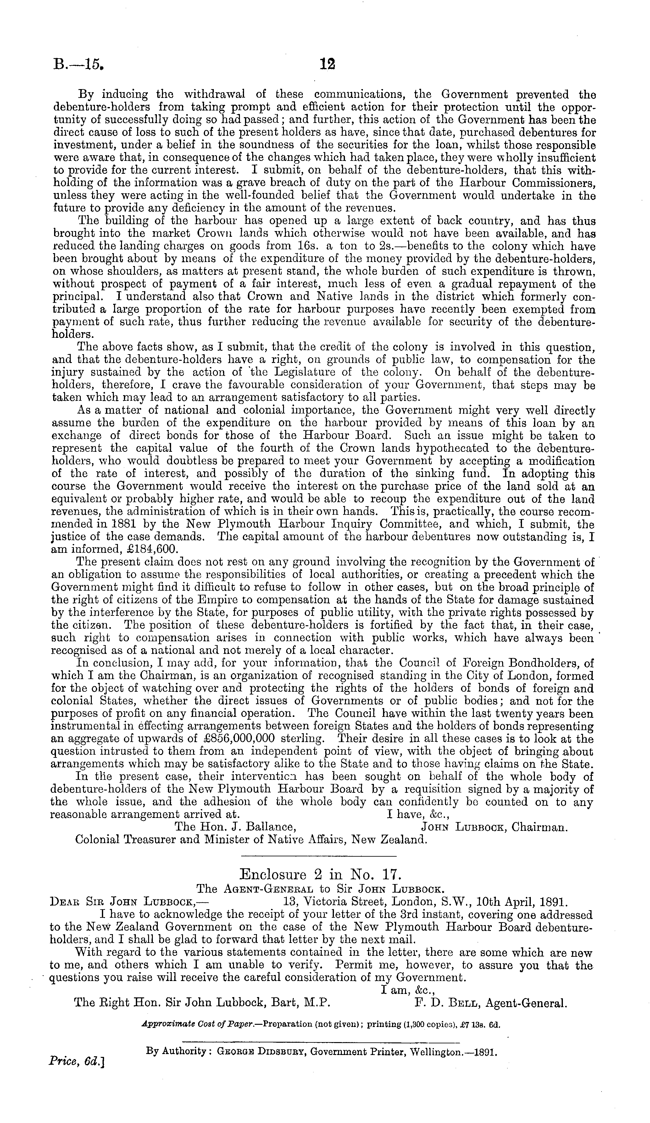 By inducing the withdrawal of these communications, the Government prevented the debenture-holders from taking prompt and efficient action for their protection until the opportunity of successfully doing so had passed; and further, this action of the Government has been the direct cause of loss to such of the present holders as have, since that date, purchased debentures for investment, under a belief in the soundness of the securities for the loan, whilst those responsible were aware that, in consequence of the changes which had taken place, they were wholly insufficient to provide for the current interest. I submit, on behalf of the debenture-holders, that this withholding of the information was a grave breach of duty on the part of the Harbour Commissioners, unless they were acting in the well-founded belief that the Government would undertake in the future, to provide any deficiency in the amount of the revenues. The building of the harbour has opened up a large extent of back country, and has thus brought into the market Crown lands which otherwise would not have been available, and has reduced the landing charges on goods from 16s. a ton to 2s.—benefits to the colony which have been brought about by means of the expenditure of the money provided by the debenture-holders, on whose shoulders, as matters at present stand, the whole burden of such expenditure is thrown, without prospect of payment of a fair interest, much less of even a gradual repayment of the principal. I understand also that Crown and Native lands in the district which formerly contributed a large proportion of the rate for harbour purposes have recently been exempted from payment of such rate, thus further reducing the revenue available for security of the debentureholders. The above facts show, as I submit, that the credit of the colony is involved in this question, and that the debenture-holders have a right, on grounds of public law, to compensation for the injury sustained by the action of 'the Legislature of the colony. On behalf of the debentureholders, therefore, I crave the favourable consideration of your Government, that steps may be taken which may lead to an arrangement satisfactory to all parties. As a matter of national and colonial importance, the Government might very well directly assume the burden of the expenditure on the harbour provided by means of this loan by an exchange of direct bonds for those of the Harbour Board. Such an issue might be taken to represent the capital value of the fourth of the Crown lands hypothecated to the debentureholders, who would doubtless be prepared to meet your Government by accepting a modification of the rate of interest, and possibly of the duration of the sinking fund. In adopting this course the Government would receive the interest on the purchase price of the land sold at an equivalent or probably higher rate, and would be able to recoup the expenditure out of the land revenues, the administration of which is in their own hands. This is, practically, the course recommended in 1881 by the New Plymouth Harbour Inquiry Committee, and which, I submit, the justice of the case demands. The capital amount of the harbour debentures now outstanding is, I am informed, £184,600. The present claim does not rest on any ground involving the recognition by the Government of an obligation to assume the responsibilities of local authorities, or creating a precedent which the Government might find it difficult to refuse to follow in other cases, but on the broad principle of the right of citizens of the Empire to compensation at the hands of the State for damage sustained by the interference by the State, for purposes of public utility, with the private rights possessed by the citizen. The position of these debenture-holders is fortified by the fact that, in their case, such right to compensation arises in connection with public works, which have always been recognised as of a national and not merely of a local character. In conclusion, I may add, for your information, that the Council of Foreign Bondholders, of which I am the Chairman, is an organization of recognised standing in the City of London, formed for the object of watching over and protecting the rights of the holders of bonds of foreign and colonial States, whether the direct issues of Governments or of public bodies; and not for the purposes of profit on any financial operation. The Council have within the last twenty years been instrumental in effecting arrangements between foreign States and the holders of bonds representing an aggregate of upwards of £856,000,000 sterling. Their desire in all these cases is to look at the question intrusted to them from an independent point of view, with the object of bringing about arrangements which may be satisfactory alike to the State and to those having claims on the State. In tlie present case, their intervention has been sought on behalf of the whole body of debenture-holders of the New Plymouth Harbour Board by a requisition signed by a majority of the whole issue, and the adhesion of the whole body can confidently be counted on to any reasonable arrangement arrived at. I have, &c, The Hon. J. Ballance, John Lubbock, Chairman. Colonial Treasurer and Minister of Native Affairs, New Zealand.