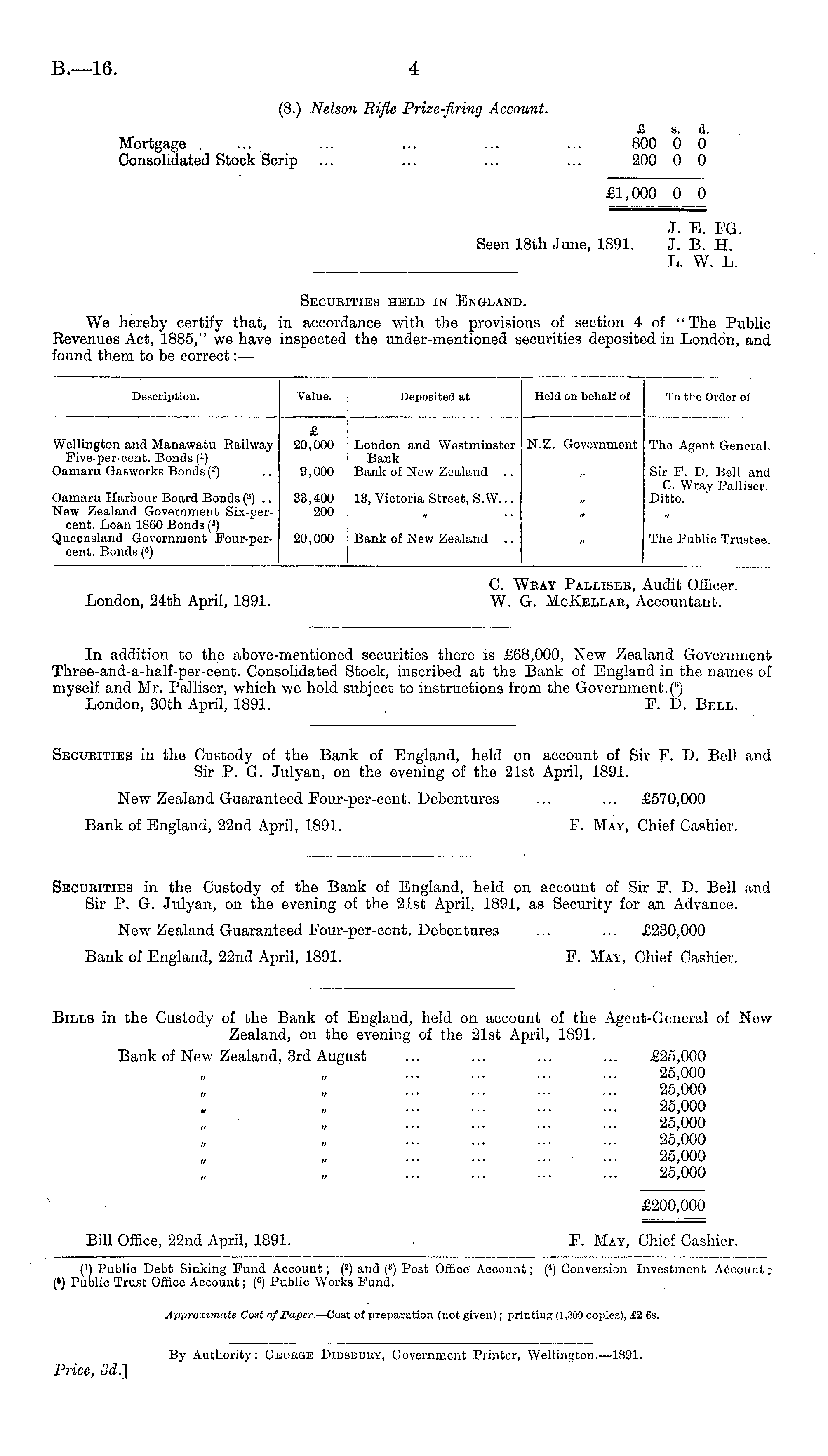 In addition to the above-mentioned securities there is £68,000, New Zealand Government Three-and-a-half-per-cent. Consolidated Stock, inscribed at the Bank of England in the names of myself and Mr. Palliser, which we hold subject to instructions from the Government. ( G ) London, 30th April, 1891. F. D. Bell.