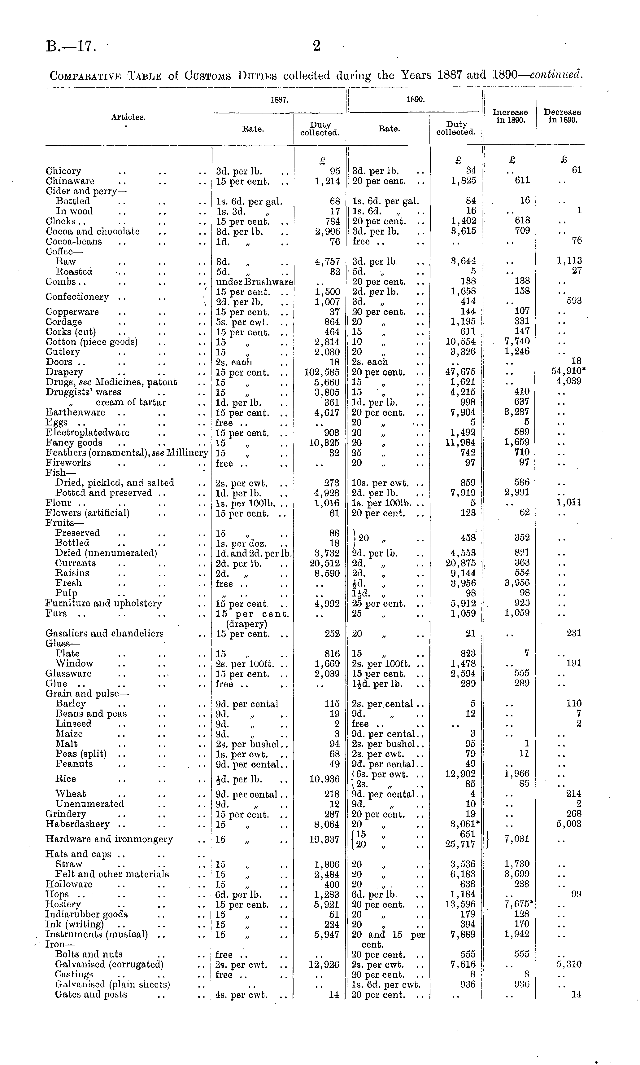 Articles. Rate. 1887. Duty collected. 181 Rate. 1890. 390. 1 Increase Duty inl830 ' collected. Decreaso in 1890. £ £ £ £ Chicory Ckinaware Cider and perry— Bottled In wood Clocks Cocoa and chocolate Cocoa-beans Coffee— Raw Roasted Combs Confectionery 3d. per lb. 15 per cent. Is. Gd. per gal. Is. 3d. 15 per cent. .. 3d. per lb. Id. „ 95 1,214 68 17 784 2,906 76 3d. per lb. 20 per cent. .. Is. 6d. per gal. Is. 6d. „ 20 per cent. .. 3d. per lb. free 34 1,825 84 16 1,402 3,615 "on 16 "618 709 61 1 76 3d. „ 5d under Brushware 15 per cent. 2d. per lb. 15 per cent. 5s. per cwt. 15 per cent. .. 15 15 2s. each 15 per cent. .. 15 15 Id. per lb. 15 per cent. .. free .. .. j 15 per cent. .. 15 „ .. j 15 free 4,757 32 3d. per lb. 5d. „ 20 per cent. .. 2d. per lb. 3d. , 20 per cent. .. 20 15 10 20 2s. each 20 per cent. .. 15 15 Id. per lb. 20 per cent. .. 20 20 20 25 20 3,644 5 138 1,658 414 144 1,195 611 10,554 3,326 1,113 27 1,500 1,007 37 804 464 2,814 2,080 18 102,585 5,660 3,805 361 4,617 "l88 158 593 Copperware Cordage Corks (cut) Cotton (piece-goods) Cutlery 107 331 147 7,740 1,246 Doors Drapery Drugs, see Medicines, patent Druggists' wares „ cream of tartar Earthenware Eggs .. E lectroplatedwaro Fan cy goods Feathers (ornamental), see Millinery Fireworks FishDried, pickled, and salted Potted and preserved Flour Flowers (artificial) Fruits— Preserved Bottled Dried (unenumerated) Currants Raisins Fresh Pulp Furniture and upholstery Furs .. 47,675 1,621 4,215 998 7,904 5 1,492 11,984 742 97 18 54,910' 4,039 903 10,325 32 410 637 3,287 5 589 1,659 710 97 2s. per cwt. Id. per lb. Is. per 1001b. .. 15 per cent. .. 273 4,928 1,016 61 10s. per cwt. .. 2d. per lb. Is. per 1001b. .. 20 per cent. .. 859 7,919 5 123 580 2,991 1^011 02 15 Is. per doz. Id. and 2d. per lb. 2d. per lb. 2d. „ free 88 18 3,732 20,512 8,590 }» . .. 2d. per lb. 2d. „ 2d. „ Id lid. „ 25 per cent. .. 25 458 4,553 20,875 9,144 3,956 98 5,912 1,059 352 821 303 554 3,950 98 920 1,059 15 per cent. 15 per cent. (drapery) 15 per cent. .. 4^992 C-asaliers and chandeliers Glass — Plate Window Glassware Glue .. Grain and pulse - BarleyBeans and peas Linseed Maize Malt Peas (split) Peanuts .. .. ... 15 2s. per 100ft. .. 15 per cent, free 9d. per cental 9d 9d. 9d 2s. per bushel.. Is. per cwt. 9d. per cental.. 252 816 1,669 2,039 115 19 2 3 94 68 49 20 15 2s. per 100ft. .. 15 per cent. 1-W. per lb. 2s. per cental .. 9d. free .. 9d. per cental.. 2s. per bushel.. 2s. per ewt. 9d. per cental.. (6s. per cwt. .. (2s. 9d. per cental.. 9d. 20 per cent. .. 20 (15 „ (20 „ 21 823 1,478 2,594 289 5 12 7 "555 289 231 '' 191 110 7 2 3 95 79 49 12,902 85 4 10 19 3,061* 651 25,717 j 1 11 1,900 85 Rice per lb. 10,936 Wheat Unenumerated Grindery Haberdashery 9d. per cental.. 9d. 15 per cent. .. 15 218 12 287 8,064 I 1 7,031 "214 2 268 5,003 Hardware and ironmongery 15 19,337 Hats and caps Straw Felt and other materials Uolloware Hops Hosiery [ndiarubber goods Ink (writing) Instruments (musical) .. [ron— Bolts and nuts Galvanised (corrugated) Castings Galvanised (plain sheets) Gates and posts 15 15 15 Od. per lb. 15 per cent. .. 15 15 15 1,806 2,484 400 1,283 5,921 51 224 5,947 20 20 20 Od. per lb. 20 per cent. .. 20 20 20 and 15 per cent. 20 per cent. .. 2s. per cwt. 20 per cent. Is. 6d. per cwt. 20 per cent. .. 3,536 6,183 638 1,184 13,596 179 394 7,889 1,730 3,099 238 7,675* 128 170 1,942 99 free 2s. per cwt. free .. 12^926 555 7,616 8 936 555 5,310 8 930 4s. per cwt. 14 14