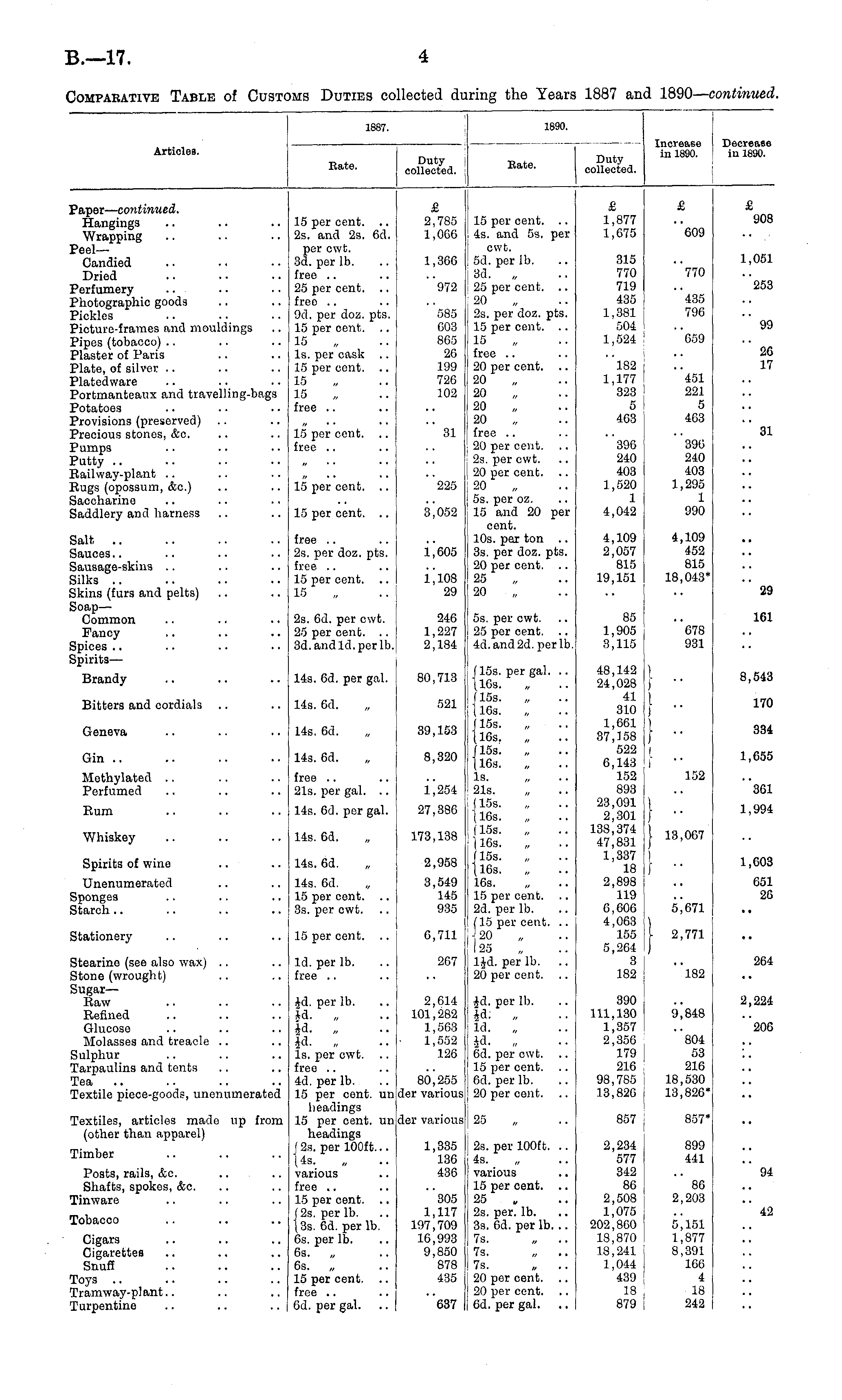 Comparative Table of Customs Duties collected during the Years 1887 and 1890— continued.