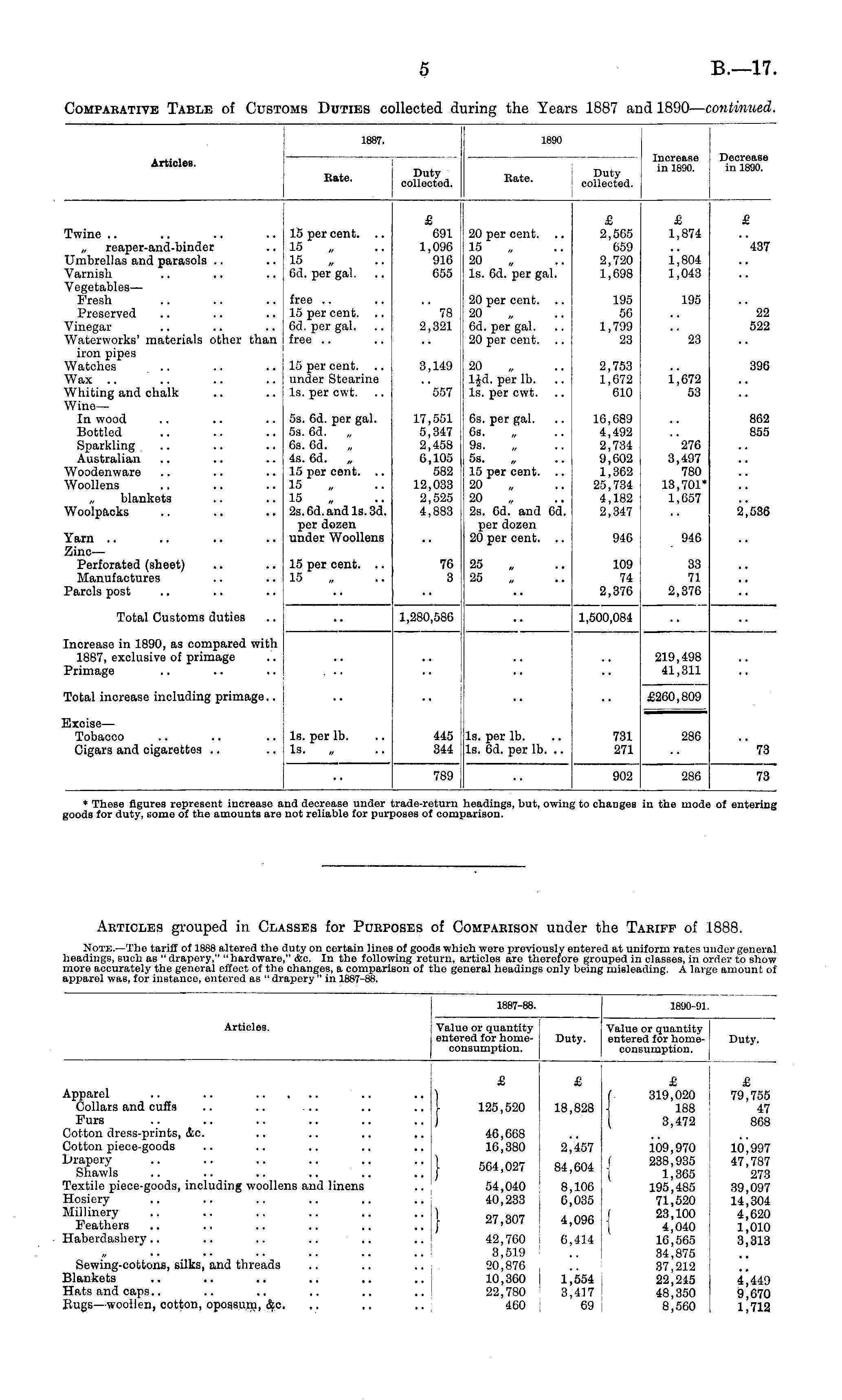 1887. 1890 Articles. Increase in 1890. Decrease in 1890. Rate. Duty collected. Rate. Duty collected. Twine .. „ reaper-and-binder Umbrellas and parasols Varnish Vegetables— Fresh Preserved Vinegar Waterworks' materials other than iron pipes Watches Wax .. Whiting and chalk Wine — In wood Bottled Sparkling Australian Woodenware Woollens „ blankets Woolpacks 15 per cent. .. 15 15 Gd. per gal. I £ 691 1,096 916 655 20 per cent. 15 20 Is. 6d. per gal. £ 2,565 659 2,720 1,098 £ 1,874 L804 1,043 £ "437 free 15 per cont. Gd. per gal. free 78 2,321 20 per cent. 20 6d. per gal. 20 per cent. 195 56 1,799 23 195 22 522 23 15 per cent, under Stearine Is. per cwt. 3,149 20 lid. per lb. Is. per cwt. 2,753 1,672 610 L672 53 396 "557 5s. 6d. per gal. 5s. 6d. „ 6s. 6d. „ 4s. Gd. „ 15 per cent. 15 15 2s. 6d. and Is. 3d. per dozen under Woollens 17,551 5,347 2,458 6,105 582 12,033 2,525 j 4,883 6s. per gal. 6s. 9s. 5s. 15 per cent. .. 20 20 2s. Gd. and Gd. per dozen 20 per cent. .. 16,689 4,492 2,734 9,602 1,362 25,734 4,182 2,347 276 3,497 780 13,701* 1,657 862 855 2^536 Yarn Zinc— Perforated (sheet) Manufactures Parcls post 946 946 15 per cent. .. 15 76 3 25 25 109 74 2,376 33 71 2,376 Total Customs duties 1,280,586 1,500,084 Increase in 1890, as compared with 1887, exclusive of primage Primage 219,498 41,311 Total increase including primage.. £260,809 Exoise— Tobacco Cigars and cigarettes Is. per lb. Is. 445 344 Is. per lb. Is. 6d. per lb. .. 731 271 286 73 789 902 286 73 * These figures represent increase joods for duty, some of the amounts an ,nd decrease under trade-return not reliable for purposes of com] headings, but, owiiii parison. to changes in the mod< of entering