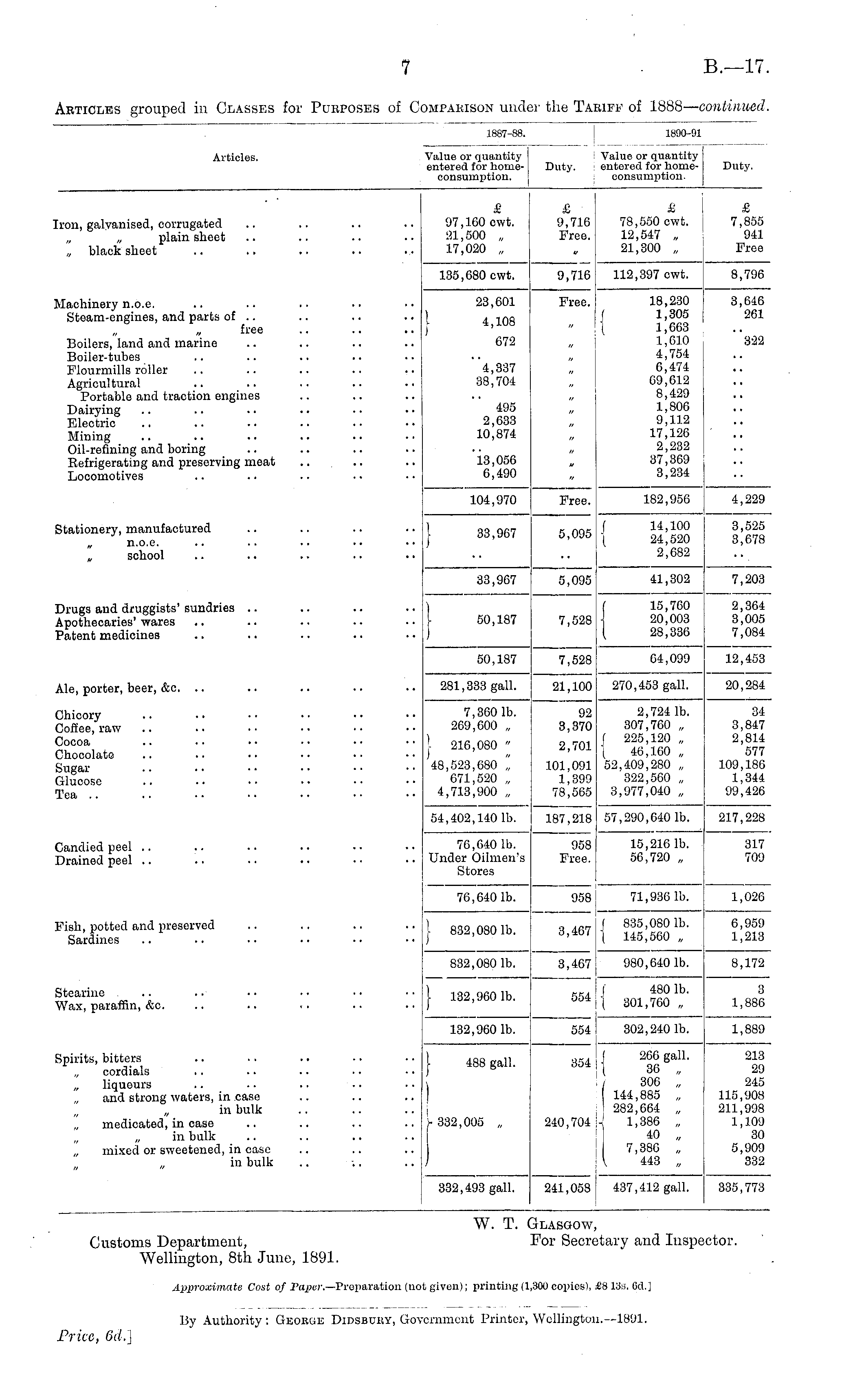 W. T. Glasgow, Customs Department, For Secretary and Inspector. Wellington, Bth June, 1891. Approximate Cost of Paper> —Preparation (not given); printing (1,300 copies), £$ 13s. 6d.]