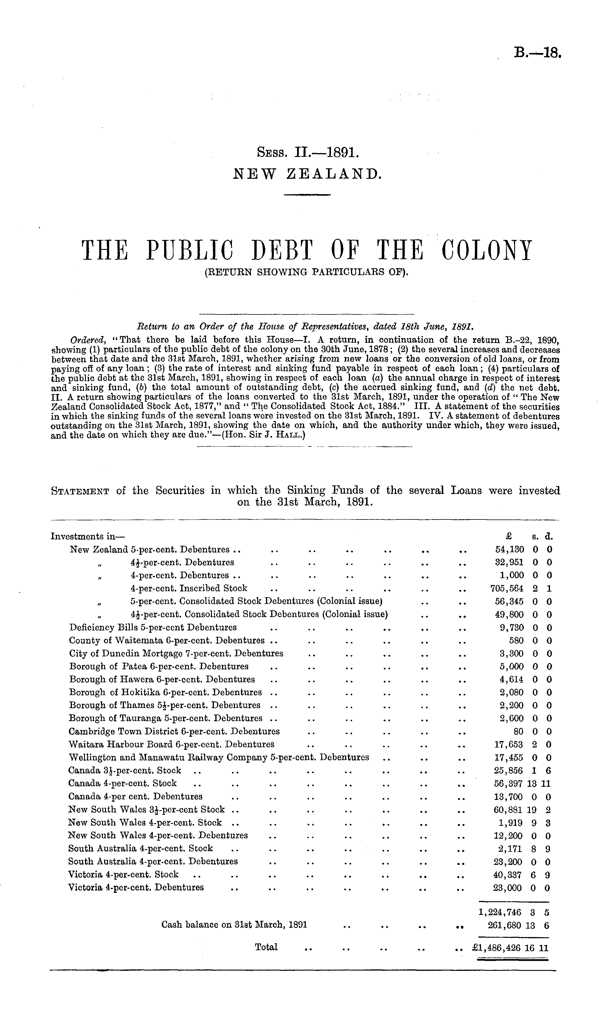 Return to an Order of the House of Representatives, dated 18th June, 1891. Ordered, "That there be laid before this House—l. A return, in continuation of the return 8.-22, 1890, showing (1) particulars of the public debt of the colony on the 30th June, 1878; (2) the several increases and decreases between that date and the 31st March, 1891, whether arising from new loans or the conversion of old loans, or from paying off of any loan ; (3) the rate of interest and sinking fund payable in respect of each loan; (4) particulars of the public debt at the 31st March, 1891, showing in respect of each loan (a) the annual charge in respect of interest and sinking fund, (6) the total amount of outstanding debt, (c) the accrued sinking fund, and (d) the net debt. 11. A return showing particulars of the loans converted to the 31st March, 1891, under the operation of " The New Zealand Consolidated Stock Act, 1877," and " The Consolidated Stock Act, 1884." 111. A statement of tho securities in which the sinking funds ot tho several loans were invested on the 31st March, 1891. IV. A statement of debentures outstanding on the 31st March, 1891, showing the date on which, and the authority under which, they were issued, and the date on which they are due." —(Hon. Sir J. Hall.)