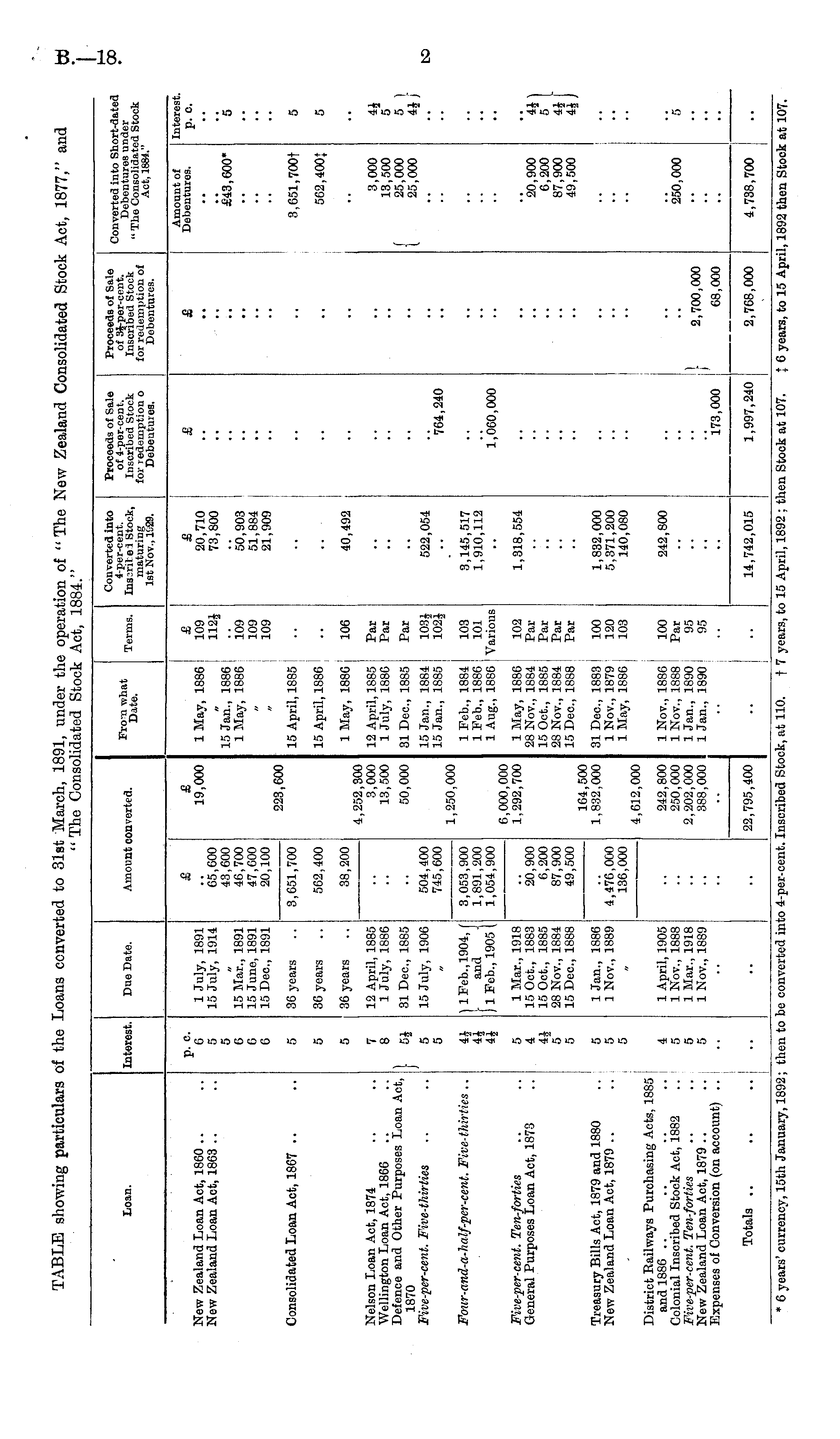 Loan. Interest. Due Date. Amount converted. Fro-n what Date. Terms. Converted into 4-per-cent. Inasril el Stock, maturing 1st Nov., 1029. Proceeds ol Sale of 4-per-ceut. Inscribed Stock for redemption o Debeutures. Proceeds of Sale of 3^-per-cent. Inscribed Stock for redemption of Debentures. Converted into Short-dated Debentures under " The Consolidated Stock Act, 1884." New Zealand Loan Act, 1860 New Zealand Loan Act, 1863 p.c. 5 5 6 G G £ £ 19,000 1 May, 1886 : 15 Jan., 1886 j 1 May, 1886 £ 109 112J 109 109 109 £ 20,710 73,800 £ £ Amount of Debentures. Interest, p. c. 1 July, 1891 15 July, 1914 15 Mar., 1891 15 June, 1891 15 Dec, 1891 65,600 43,600 46,700 47,000 20,100 3,651,700 223,600 50,903 51,884 21,909 £43,600* *5 Consolidated Loan Act, 1867 .. 5 36 years 15 April, 1885 j 3,651,700t 5 5 3G years 562,400 15 April, 1886 j 562, 400 J 5 5 36 years 38,200 I 4,252,300 3,000 13,500 1 May, 1886 106 40,492 Nelson Loan Act, 1874 Wellington Loan Act, 1866 Defence and Other Purposes Loan Act, 1870 Five-per-cent. Five-thirties .. .. I 7 8 5 5 12 April, 1885 1 July, 1886 31 Dec, 1885 50,000 12 April, 1885 1 July, 1886 31 Dec, 1885 Par Par Par I 3,000 13,500 25,000 25,000 5 5 ) 15 July, 1906 504,400 745,600 1,250,000 15 Jan., 1884 15 Jan., 1885 103J 102i 522,054 '764,240 Four-and-a-half-per-cent. Five-thirties .. 44 ) 1 Feb., 1904, f and J ) 1 Feb., 1905 3,053,900 1,891,200 1,054,900 1 Feb., 1884 1 Feb., 1886 1 Aug., 1886 103 101 Various 3,145,517 1,910,112 Five-per-cent. Ten-forties General Purposes Loan Act, 1873 5 4 G 5 1 Mar., 1918 15 Oct., 1883 15 Oct., 1885 28 Nov., 1884 15 Dec, 1888 20,900 6,200 87,900 49,500 6,000,000 1,292,700 1 May, 1886 28 Nov., 1884 15 Oct., 1885 28 Nov., 1884 15 Dec, 1888 102 Par Par Par Par 1,318,554 l|060,000 20,900 6,200 87,900 49,500 91 Treasury Bills Act, 1879 and 1880 .. j New Zealand Loan Act, 1879 .. 5 5 5 104,500 1,832,000 1 Jan., 1886 1 Nov., 1889 4,476,000 136,000 31 Dec, 1883 1 Nov., 1879 1 May, 1886 100 120 103 1,832,000 5,371,200 140,080 4,612,000 District Eailways Purchasing Acts, 1885 ; and 1886 Colonial Inscribed Stock Act, 1882 .. ! Five-per-cent. Ten-forties New Zealand Loan Act, 1879 Expenses of Conversion (on account) .. 4 5 5 1 April, 1905 1 Nov., 1888 1 Mar., 1918 1 Nov., 1889 242,800 250,000 2,202,000 388,000 1 Nov., 1886 1 Nov., 1888 1 Jan., 1890 1 Jan., 1890 100 Par 95 95 242,800 250,000 5 f 2,700,000 173,000 68,000 Totals .. .. .. 22,795,400 14,742,015 1,997,240 2,768,000 4,738,700 * 6 years' currency, 15th January, 1892; then to be converted into 4-per-cent. Inscribed Stock, at 110. t 7 years, to 15 April, 1892 ; then Stock at 107. { 6 years, to 15 April, 1892 then Stock at 107.