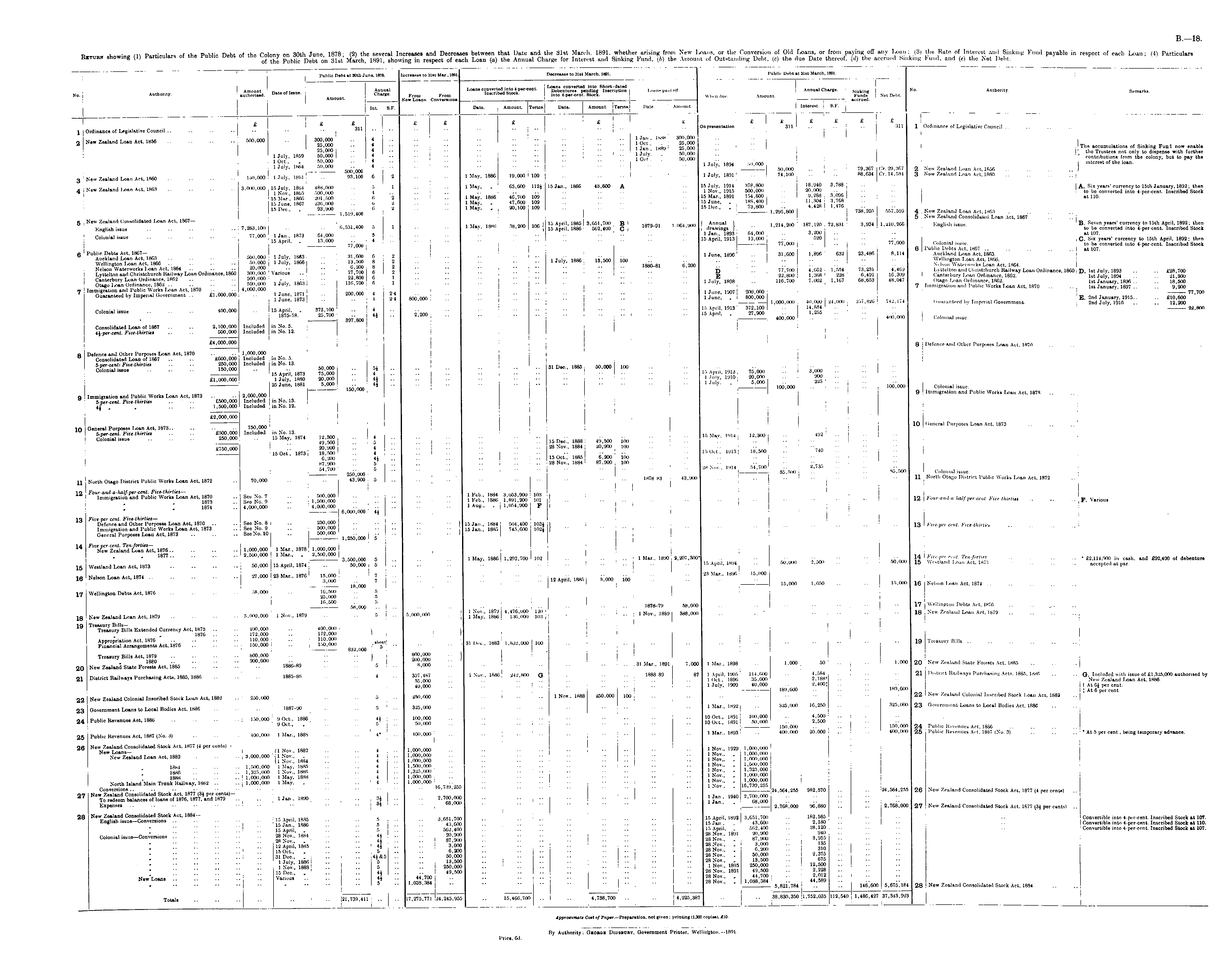 Return showing (1) Particulars of the Public Debt of the Colony on 30th June 1878; (2) the several Increases and Decreases between that Date and the Slst March, 1891, whether arising from New Loans, or the Conversion of Old Loans, or from paying off any Loan; (3) the Rate of Interest and Sinking Fund payable in respect of each Loan; (4) Particulars of the Public Debt on 31st March, 1891, showing in respect of each Loan (a) the Annual Charge for Interest and Sinking Fund, (b) the Amount of Outstanding Debt, (c) the due Date thereof, (d) the accrued Sinking Fund, and (e) the Net Debt.