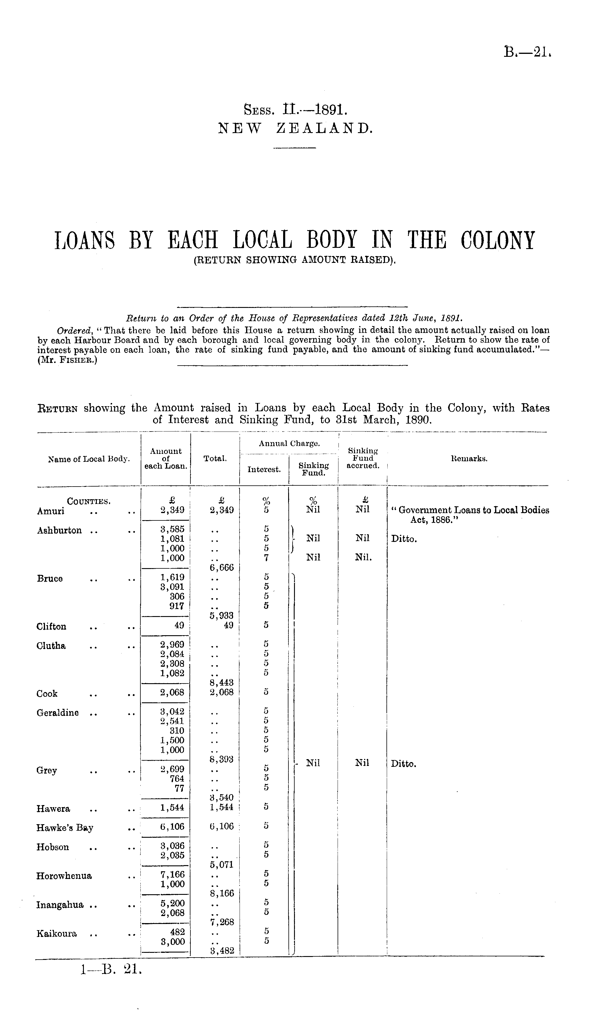Return to an Order of the House of Representatives dated 12th June, 1891. Ordered, " That there be laid before this House a return showing in detail the amount actually raised on loan by each Harbour Board and by each borough and local governing body in the colony. Return to show the rate of interest payable on each loan, the rate of sinking fund payable, and the amount of sinking fund accumulated." — (Mr. Fisher.)