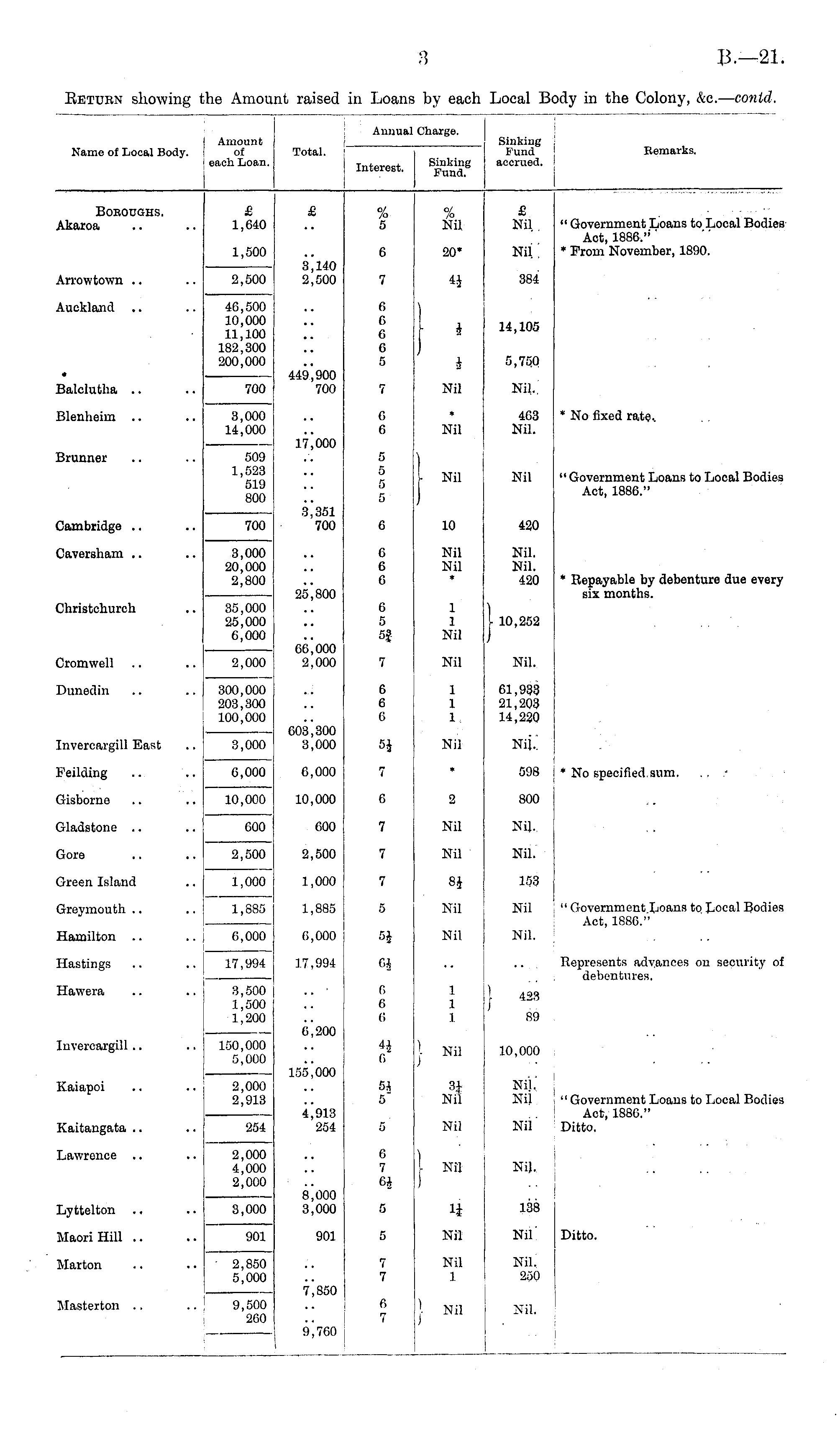 Annual Charge. Name of Local Body. Amount of each Loan. Total. Interest. | ***$ Sinking Fund accrued. Remarks. Boroughs. Akaroa £ 1,640 £ % 5 % Nil £ Nil , Nil " Government Loans to Local Bodies Act, 1886." ' * Prom November, 1890. 1,500 2,500 3*140 2,500 6 20* Arrowtown .. 7 4* 384 Auckland 46,500 10,000 11,100 182,300 200,000 6 G 6 6 5 ) I h. | 14,105 • 449,900 700 i 5,750 Balclutha .. 700 7 Nil Nil. Blenheim Brunner 1 3,000 14,000 509 1,523 519 800 17*000 6 6 5 5 5 5 ) * Nil Nil 463 Nil. Nil * No fixed rate.. " Government Loans to Local Bodies Act, 1886." Cambridge .. 700 31351 700 6 10 420 Caversham .. Christchurch 3,000 20,000 2,800 35,000 25,000 6,000 2,000 25*800 6 6 G 6 5 si Nil Nil * 1 1 Nil Nil. Nil. 420 I 10,252 * Repayable by debenture due every six months. Cromwell 66*000 2,000 7 Nil Nil. Dunedin 300,000 203,300 100,000 i 3,000 003,300 3,000 6 6 6 1 1 1 61,933 21,203 14,220 Invercargill East Bj Nil Nij. Feilding 6,000 6,000 7 * 598 ! * No specified sum. . , - Gisborne 10,000 600 10,000 G 2 800 .. Gladstone .. 600 7 Nil Nil. Gore 2,500 2,500 7 Nil Nil. Green Island 1,(100 1,885 1,000 7 8J 153 Greymouth .. 1,885 5 Nil Nil " Government Loans to Local Bodies Act, 1886." Hamilton 6,000 6,000 *i Nil Nil. Hastings 17,994 17,994 c>l Represents advances on security of debentures. Hawera 3,500 I 1,500 1,200 6 6 6 1 1 1 1 423 Invercargill .. G\200 89 I 150,000 5,000 4J G 1 ) Nil 10,000 Kaiapoi 2,000 2,913 155*000 4*913 254 5 Nil Nil. Nil Nil "Government Loans to Local Bodies Act, 1886." Ditto. Kaitangata .. 254 5 Nil Lawrence .. 2,000 4,000 2,000 3,000 6 7 64 \ i Nil Nil. Lyttelton 8,000 3,000 8 li 138 Maori Hill .. 901 901 5 Nil Nil Ditto. Marton 2,850 5,000 7 7 Nil 1 Nil. 250 Masterton .. 7*850 9,500 260 6 7 I j Nil Nil. 9*760