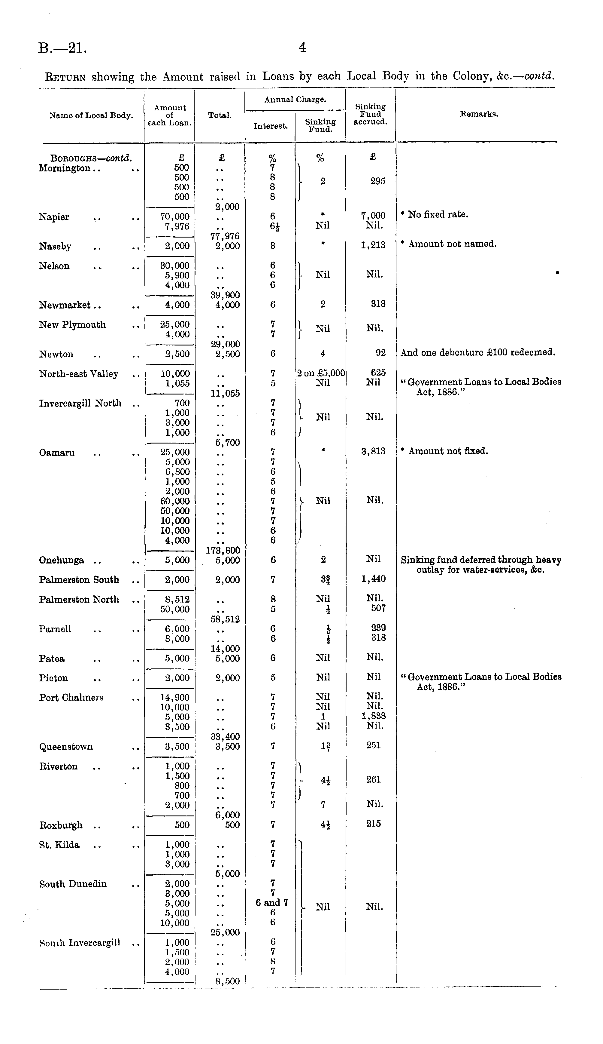 Name of Local Body. Amount of each Loan. ! Total. Interest. **ff Annual Charge. Sinking Fund accrued. Remarks, Boroughs— contd. ilornington.. £ 500 500 500 500 £ % 7 8 8 8 % £ 1 2 295 Napier 70,000 7,976 2,000 30,000 5,900 4,000 2*000 7,000 Nil. 6 * * No fixed rate. 77*976 2,000 Nil STaseby 8 * 1,213 * Amount not named. Sfelson 6 6 6 I Nil Nil. • Newmarket.. 4,000 39*900 4,000 G 2 318 Slew Plymouth 25,000 4,000 7 7 I I Nil Nil. And one debenture £100 redeemed. Sfewton 2,500 10,000 1,055 29|000 2,500 6 4 92 STorth-east Valley 7 5 2 on £5,001 Nil 625 Nil " Government Loans to Local Bodies Act, 1886." [nvercargill North .. 11*055 700 1,000 3,000 1,000 7 7 7 6 ■ Nil Nil. 3amaru 25,000 5,000 6,800 1,000 2,000 60,000 50,000 10,000 10,000 4,000 5,000 5*700 7 7 6 5 6 7 7 7 6 G * 3,813 * Amount not fixed. Nil. Nil Onehunga .. 173*800 5,000 6 2 Nil Sinking fund deferred through heavy outlay for water-services, &e. Palmerston South 2,000 2,000 7 3J 1,440 Palmerston North 8,512 50,000 8 5 Nil i Nil. 507 Parnell 6,000 8,000 58*512 6 6 i i 239 318 " Government Loans to Local Bodies Act, 188G." Patea 5,000 ' 2,000 i 14*000 5,000 6 Nil Nil. Picton 2,000 5 Nil Nil Port Chalmers 14,900 I 10,000 5,000 8,500 3,500 7 7 7 G Nil Nil 1 Nil Nil. Nil. 1,838 Nil. Queenstown 33|400 3,500 7 x ? 251 Riverton 1,000 1,500 j 800 I 700 2,000 7 7 7 7 7 | 4i 261 7 Nil. Roxburgh .. 500 6*000 500 7 H 215 St. Kilda .. South Dunedin 1,000 1,000 3,000 2,000 3,000 5,000 5,000 10,000 1,000 1,500 2,000 4.000 5*000 7 7 7 7 7 6 and 7 6 G - Nil Nil. South Invercargill 25,000 G 7 8 7 8*500