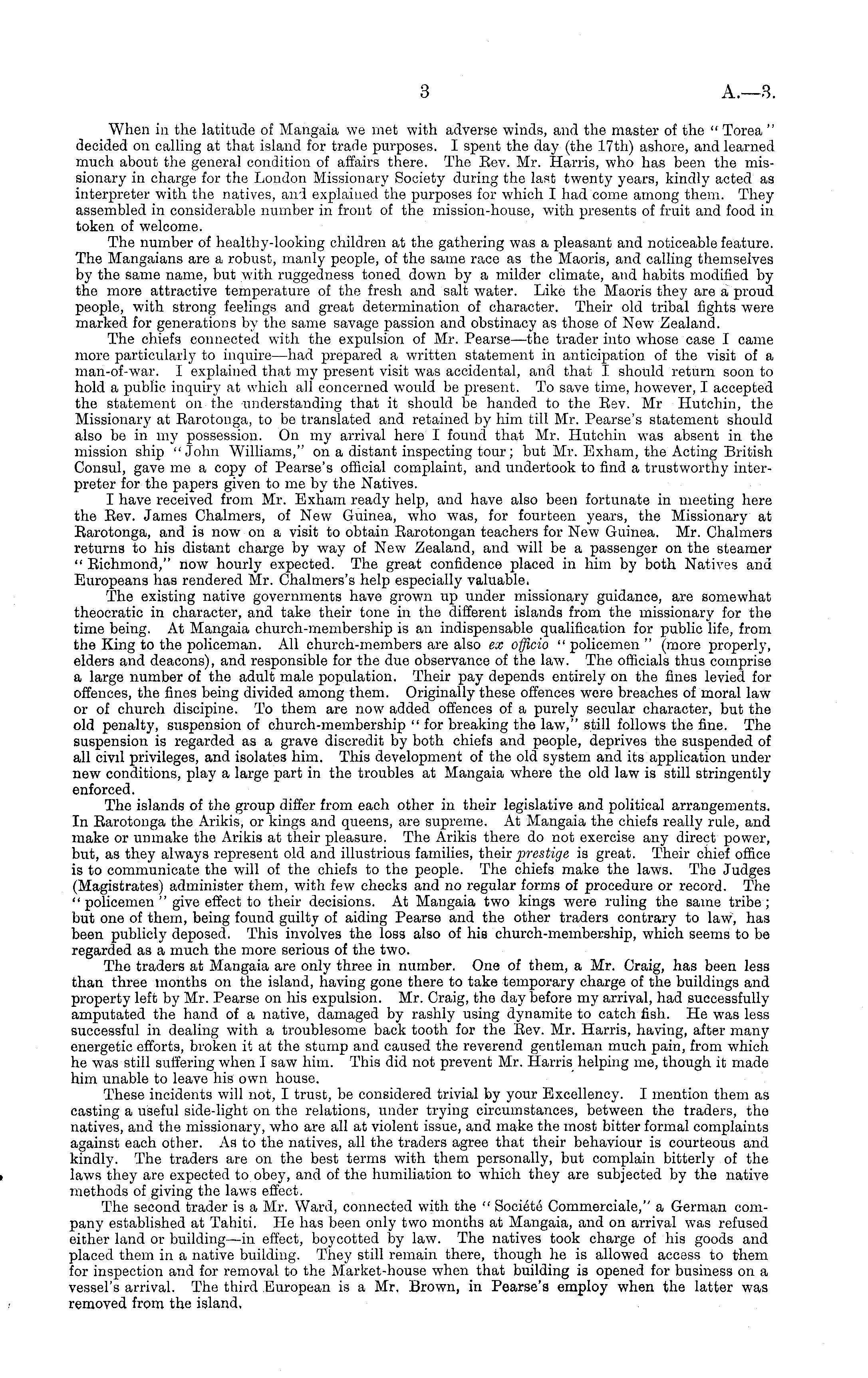 When in the latitude of Mangaia we met with adverse winds, and the master of the " Torea " decided on calling at that island for trade purposes. I spent the day (the 17th) ashore, and learned much about the general condition of affairs there. The Eev. Mr. Harris, who has been the missionary in charge for the London Missionary Society during the last twenty years, kindly acted as interpreter with the natives, ani explained the purposes for which I had come among them. They assembled in considerable number in front of the mission-house, with presents of fruit and food in token of welcome. The number of healthy-looking children at the gathering was a pleasant and noticeable feature. The Mangaians are a robust, manly people, of the same race as the Maoris, and calling themselves by the same name, but with ruggedness toned down by a milder climate, and habits modified by the more attractive temperature of the fresh and salt water. Like the Maoris they are a proud people, with strong feelings and great determination of character. Their old tribal fights were marked for generations by the same savage passion and obstinacy as those of New Zealand. The chiefs connected with the expulsion of Mr. Pearse—the trader into whose case I came more particularly to inquire—had prepared a written statement in anticipation of the visit of a man-of-war. I explained that my present visit was accidental, and that I should return soon to hold a public inquiry at which all concerned would be present. To save time, however, I accepted the statement on-the understanding that it should be handed to the Esv. Mr Hutchin, the Missionary at Barotonga, to be translated and retained by him till Mr. Pearse's statement should also be in my possession. On my arrival here I found that Mr. Hutchin was absent in the mission ship "John Williams," on a distant inspecting tour; but Mr. Exham, the Acting British Consul, gave me a copy of Pearse's official complaint, and undertook to find a trustworthy interpreter for the papers given to me by the Natives. I have received from Mr. Exham ready help, and have also been fortunate in meeting here the Eev. James Chalmers, of New Guinea, who was, for fourteen years, the Missionary at Earotonga, and is now on a visit to obtain Earotongan teachers for New Guinea. Mr. Chalmers returns to his distant charge by way of New Zealand, and will be a passenger on the steamer " Eichmond," now hourly expected. The great confidence placed in him by both Natives and Europeans has rendered Mr. Chalmers's help especially valuable. The existing native governments have grown up under missionary guidance, are somewhat theocratic in character, and take their tone in the different islands from the missionary for the time being. At Mangaia church-membership is an indispensable qualification for public life, from the King to the policeman. All church-members are also ex offlcio "policemen" (more properly, elders and deacons), and responsible for the due observance of the law. The officials thus comprise a large number of the adult male population. Their pay depends entirely on the fines levied for offences, the fines being divided among them. Originally these offences were breaches of moral law or of church discipine. To them are now added offences of a purely secular character, but the old penalty, suspension of church-membership " for breaking the law," still follows the fine. The suspension is regarded as a grave discredit by both chiefs and people, deprives the suspended of all civil privileges, and isolates him. This development of the old system and its application under new conditions, play a large part in the troubles at Mangaia where the old law is still stringently enforced. The islands of the group differ from each other in their legislative and political arrangements. In Earotonga the Arikis, or kings and queens, are supreme. At Mangaia the chiefs really rule, and make or unmake the Arikis at their pleasure. The Arikis there do not exercise any direct power, but, as they always represent old and illustrious families, their prestige is great. Their chief office is to communicate the will of the chiefs to the people. The chiefs make the laws. The Judges (Magistrates) administer them, with few checks and no regular forms of procedure or record. The " policemen " give effect to their decisions. At Mangaia two kings were ruling the same tribe; but one of them, being found guilty of aiding Pearse and the other traders contrary to law, has been publicly deposed. This involves the loss also of his church-membership, which seems to be regarded as a much the more serious of the two. The traders at Mangaia are only three in number. One of them, a Mr. Craig, has been less than three months on the island, having gone there to take temporary charge of the buildings and property left by Mr. Pearse on his expulsion. Mr. Craig, the day before my arrival, had successfully amputated the hand of a native, damaged by rashly using dynamite to catch fish. He was less successful in dealing with a troublesome back tooth for the Eev. Mr. Harris, having, after many energetic efforts, broken it at the stump and caused the reverend gentleman much pain, from which he was still suffering when I saw him. This did not prevent Mr. Harris helping me, though it made him unable to leave his own. house. These incidents will not, I trust, be considered trivial by your Excellency. I mention them as casting a useful side-light on the relations, under trying circumstances, between the traders, the natives, and the missionary, who are all at violent issue, and make the most bitter formal complaints against each other. As to the natives, all the traders agree that their behaviour is courteous and kindly. The traders are on the best terms with them personally, but complain bitterly of the laws they are expected to obey, and of the humiliation to which they are subjected by the native methods of giving the laws effect. The second trader is a