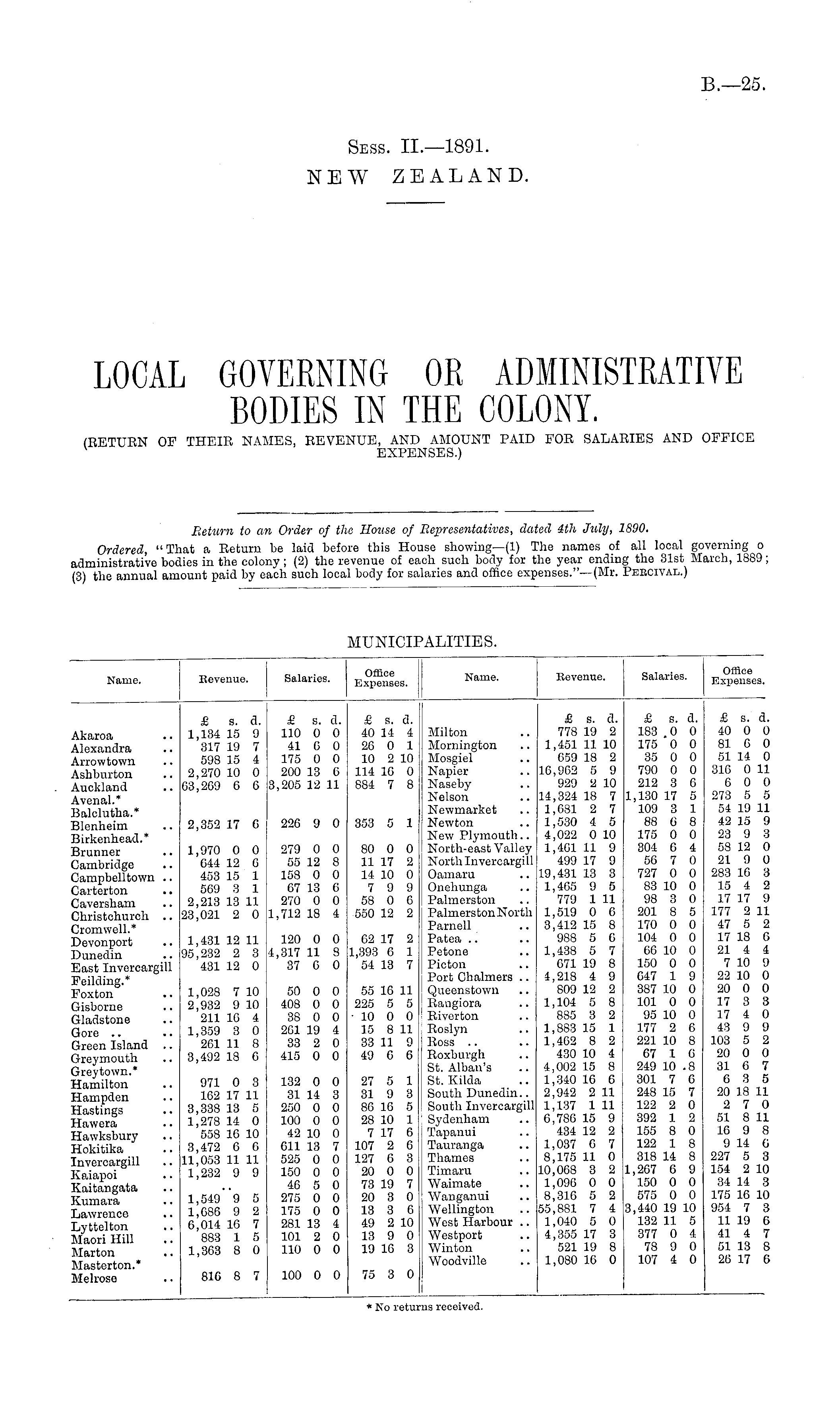 Return to an Order of the House of Representatives, dated 4th July, 1890. Ordered, "That a Return be laid before this House showing—(l) The names of all local governing o administrative bodies in the colony; (2) the revenue of each such body for the year ending the 31st March, 1889; (3) the annual amount paid by each such local body for salaries and office expenses."—(Mr. Pebcival.)