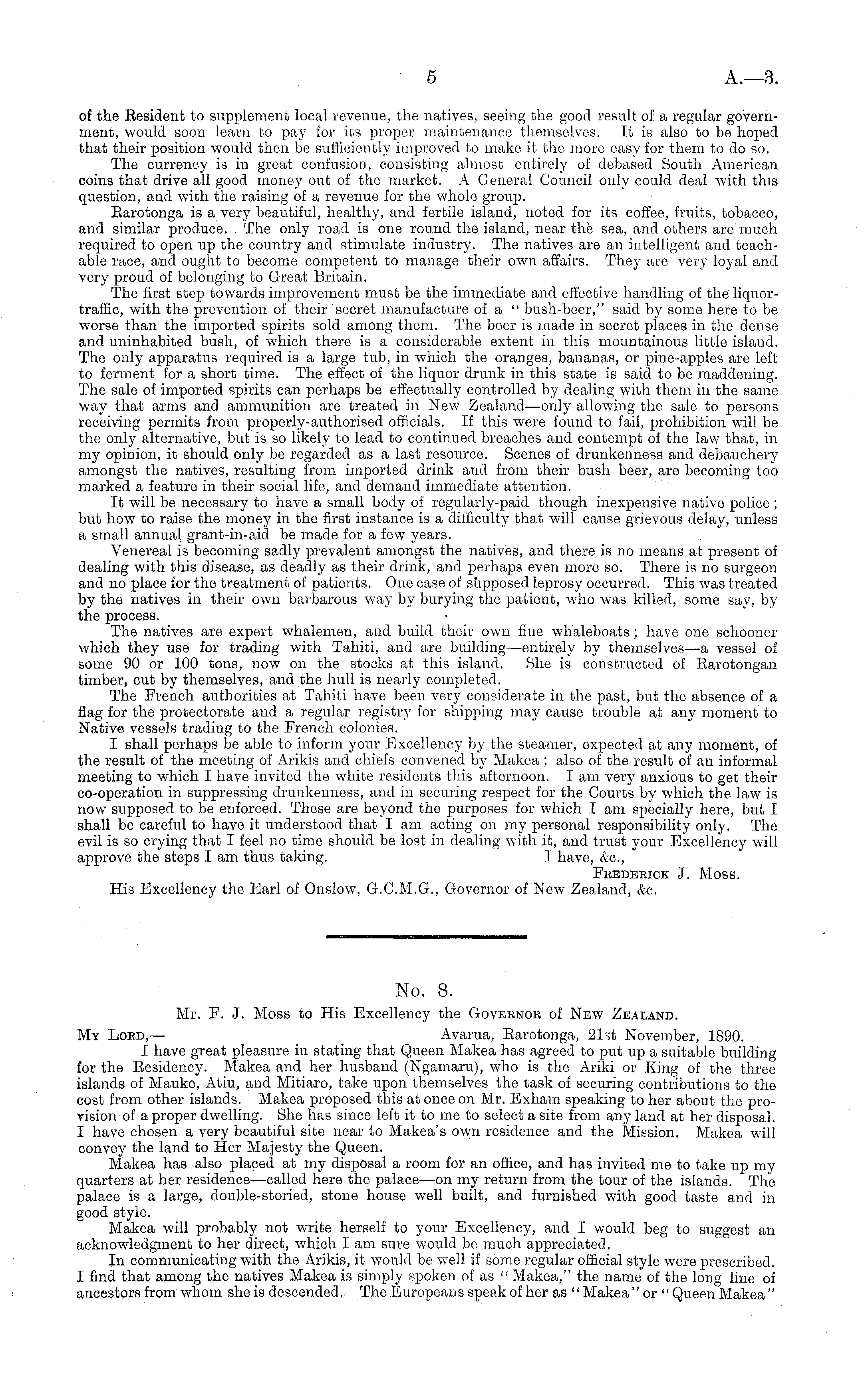 No. 8. Mr. F. J. Moss to His Excellency the Governor of New Zealand. My Loed, — Avarua, Earotonga, 21st November, 1890. 1 have great pleasure in stating that Queen Makea has agreed to put up a suitable building for the Eesidency. Makea and her husband (Ngamaru), who is the Ariki or King of the three islands of Mauke, Atiu, and Mitiaro, take upon themselves the task of securing contributions to the cost from other islands. Makea proposed this at once on Mr. Exham speaking to her about the provision of a proper dwelling. She has since left it to me to select a site from any land at her disposal. I have chosen a very beautiful site near to Makea's own residence and the Mission. Makea will convey the land to Her Majesty the Queen. Makea has also placed at my disposal a room for an office, and has invited me to take up my quarters at her residence—called here the palace—on my return from the tour of the islands. The palace is a large, double-storied, stone house well built, and furnished with good taste and in good style. Makea will probably not write herself to your Excellency, and I would beg to suggest an acknowledgment to her direct, which I am sure would be much appreciated. In communicating with the Arikis, it would be well if some regular official style were prescribed. I find that among the natives Makea is simply spoken of as " Makea," the name of the long line of ancestors from whom she is descended. The Europeans speak of her as "Makea "or "Queen Makea"