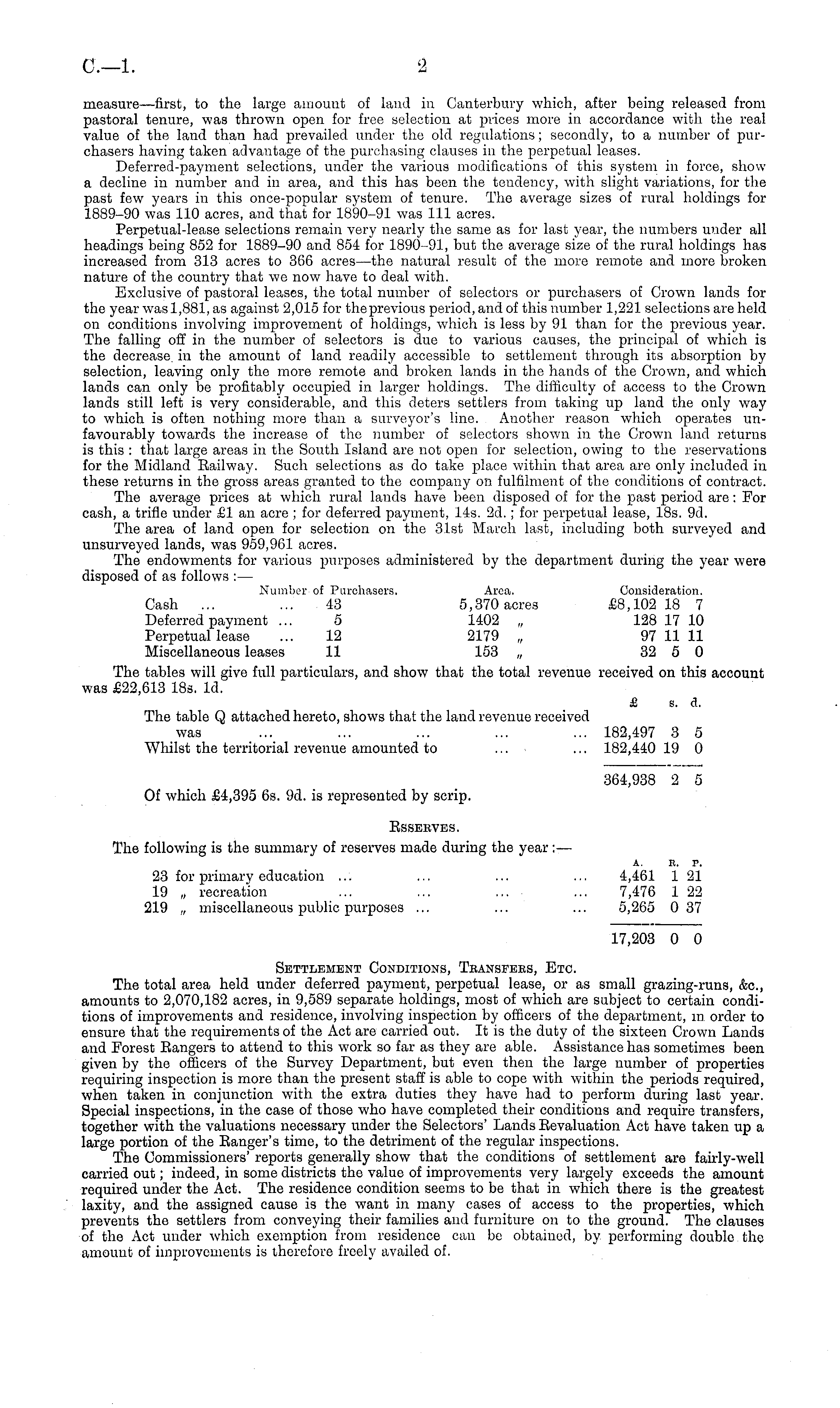 measure—first, to the large amount of laud in Canterbury which, after being released from pastoral tenure, was thrown open for free selection at prices more in accordance with the real value of the land than had prevailed under the old regulations; secondly, to a number of purchasers having taken advantage of the purchasing clauses in the perpetual leases. Deferred-payment selections, under the various modifications of this system in force, show a decline in number and in area, and this has been the tendency, with slight variations, for the past few years in this once-popular system of tenure. The average sizes of rural holdings for 1889-90 was 110 acres, and that for 1890-91 was 111 acres. Perpetual-lease selections remain very nearly the same as for last year, the numbers under all headings being 852 for 1889-90 and 854 for 1890-91, but the average size of the rural holdings has increased from 313 acres to 366 acres —the natural result of the more remote and more broken nature of the country that we now have to deal with. Exclusive of pastoral leases, the total number of selectors or purchasers of Crown lands for the year was 1,881, as against 2,015 for the previous period, and of this number 1,221 selections are held on conditions involving improvement of holdings, which is less by 91 than for the previous year. The falling off in the number of selectors is due to various causes, the principal of which is the decrease in the amount of land readily accessible to settlement through its absorption by selection, leaving only the more remote and broken lands in the hands of the Crown, and which lands can only be profitably occupied in larger holdings. The difficulty of access to the Crown lands still left is very considerable, and this deters settlers from taking up land the only way to which is often nothing more than a surveyor's line. Another reason which operates unfavourably towards the increase of the number of selectors shown in the Crown land returns is this : that large areas in the South Island are not open for selection, owing to the reservations for the Midland Railway. Such selections as do take place within that area are only included in these returns in the gross areas granted to the company on fulfilment of the conditions of contract. The average prices at which rural lands have been disposed of for the past period are: For cash, a trifle under £1 an acre ; for deferred payment, 14s. 2d.; for perpetual lease, 18s. 9d. The area of land open for selection on the 31st March last, including both surveyed and unsurveyed lands, was 959,961 acres. The endowments for various purposes administered by the department during the year were disposed of as follows : — Number of Purchasers. Area. Consideration. Cash ... ... 43 5,370 acres £8,102 18 7 Deferred payment ... 5 1402 „ 128 17 10 Perpetual lease ... 12 2179 „ 97 1111 Miscellaneous leases 11 153 „ 32 5 0 The tables will give full particulars, and show that the total revenue received on this account was £22,613 18s. Id. £ s. d. The table Q attached hereto, shows that the land revenue received was ... ... ... ... ... 182,497 3 5 Whilst the territorial revenue amounted to ... ... 182,440 19 0 364,938 2 5 Of which £4,395 6s. 9d. is represented by scrip. Essebves. The following is the summary of reserves made during the year:— A. H. P. 23 for primary education ... ... ... ... 4,461 1 21 19 „ recreation ... ... ... - ... 7,476 1 22 219 „ miscellaneous public purposes ... ... ... 5,265 0 37 17,203 0 0 Settlement Conditions, Teanspees, Etc. The total area held under deferred payment, perpetual lease, or as small grazing-runs, &c, amounts to 2,070,182 acres, in 9,589 separate holdings, most of which are subject to certain conditions of improvements and residence, involving inspection by officers of the department, in order to ensure that the requirements of the Act are carried out. It is the duty of the sixteen Crown Lands and Forest Eangers to attend to this work so far as they are able. Assistance has sometimes been given by the officers of the Survey Department, but even then the large number of properties requiring inspection is more than the present staff is able to cope with within the periods required, when taken in conjunction with the extra duties they have had to perform during last year. Special inspections, in the case of those who have completed their conditions and require transfers, together with the valuations necessary under the Selectors' Lands Revaluation Act have taken up a large portion of the Ranger's time, to the detriment of the regular inspections. The Commissioners' reports generally show that the conditions of settlement are fairly-well carried out; indeed, in some districts the value of improvements very largely exceeds the amount required under the Act. The residence condition seems to be that in which there is the greatest laxity, and the assigned cause is the want in many cases of access to the properties, which prevents the settlers from conveying their families and furniture on to the ground. The clauses of the Act under which exemption from residence can be obtained, by performing double the amount of improvements is therefore freely availed of.