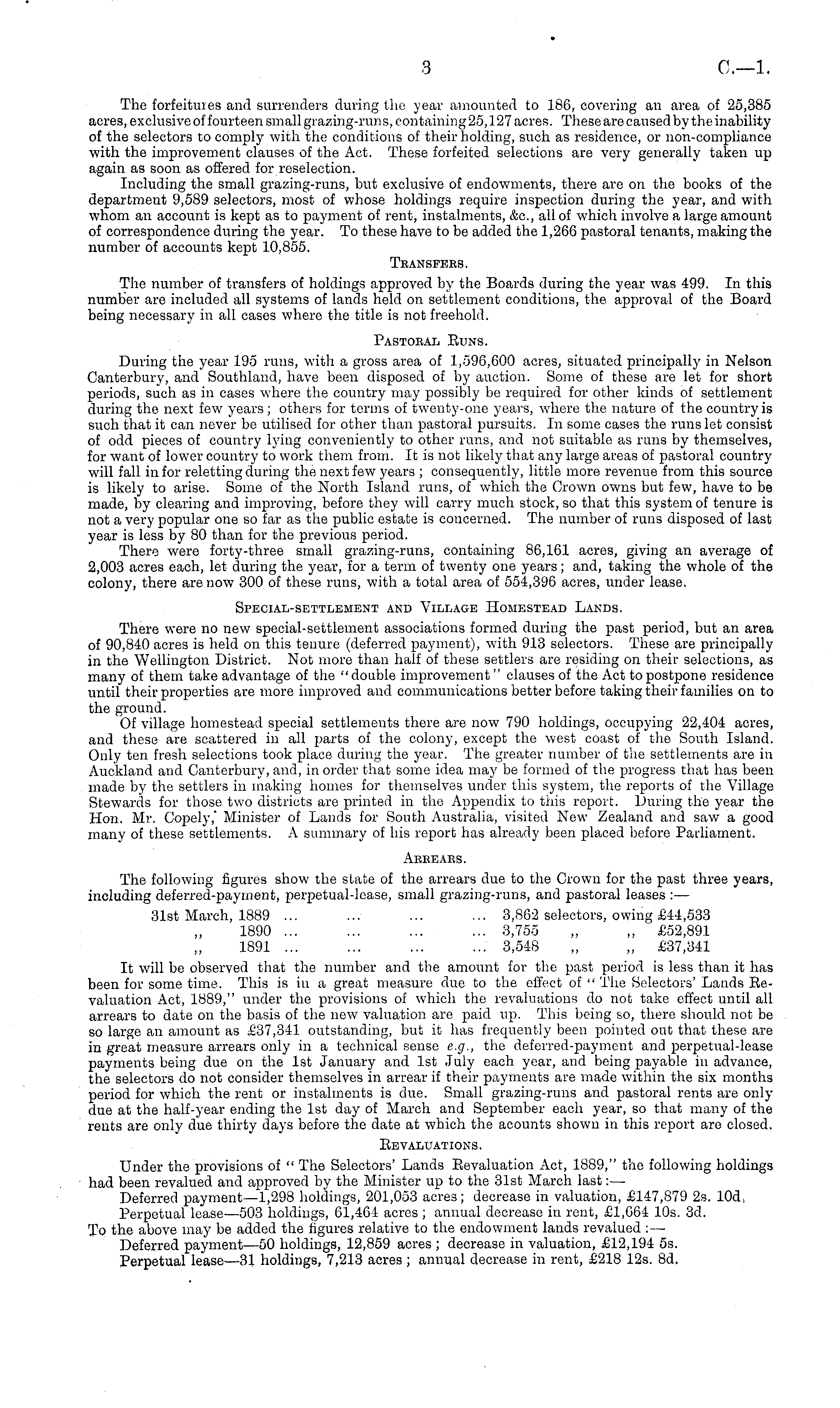 The forfeituies and surrenders during the year amounted to 186, covering an area of 25,385 acres, exclusive of fourteen small grazing-runs, containing 25,127 acres. These are caused by the inability of the selectors to comply with the conditions of their holding, such as residence, or non-compliance with the improvement clauses of the Act. These forfeited selections are very generally taken up again as soon as offered for reselection. Including the small grazing-runs, but exclusive of endowments, there are on the books of the department 9,589 selectors, most of whose holdings require inspection during the year, and with whom an account is kept as to payment of rent, instalments, &c, all of which involve a large amount of correspondence during the year. To these have to be added the 1,266 pastoral tenants, making the number of accounts kept 10,855. Teansfebs. The number of transfers of holdings approved by the Boards during the year was 499. In this number are included all systems of lands held on settlement conditions, the approval of the Board being necessary in all cases where the title is nob freehold. Pastoeal Euns. During the year 195 runs, with a gross area of 1,596,600 acres, situated principally in Nelson Canterbury, and Southland, have been disposed of by auction. Some of these are let for short periods, such as in cases where the country may possibly be required for other kinds of settlement during the next few years; others for terms of twenty-one years, where the nature of the country is such that it can never be utilised for other than pastoral pursuits. In some eases the runs let consist of odd pieces of country lying conveniently to other runs, and not suitable as runs by themselves, for want of lower country to work them from. It is not likely that any large areas of pastoral country will fall in for reletting during the next few years ; consequently, little more revenue from this source is likely to arise. Some of the North Island runs, of which the Crown owns but few, have to be made, by clearing and improving, before they will carry much stock, so that this system of tenure is not a very popular one so far as the public estate is concerned. The number of runs disposed of last year is less by 80 than for the previous period. There were forty-three small grazing-runs, containing 86,161 acres, giving an average of 2,003 acres each, let during the year, for a term of twenty one years; and, taking the whole of the colony, there are now 300 of these runs, with a total area of 554,396 acres, under lease. Special-settlement and Village Homestead Lands. There were no new special-settlement associations formed during the past period, but an area of 90,840 acres is held on this tenure (deferred payment), with 913 selectors. These are principally in the Wellington District. Not more than half of these settlers are residing on their selections, as many of them take advantage of the "double improvement" clauses of the Act to postpone residence until their properties are more improved and communications better before taking their families on to the ground. Of village homestead special settlements there are now 790 holdings, occupying 22,404 acres, and these are scattered in all parts of the colony, except the west coast of the South Island. Only ten fresh selections took place during the year. The greater number of the settlements are in Auckland and Canterbury, and, in order that some idea may be formed of the progress that has been made by the settlers in making homes for themselves under this system, the reports of the Village Stewards for those two districts are printed in the Appendix to this report. During the year the Hon. Mr. Copely," Minister of Lands for South Australia, visited New Zealand and saw a good many of these settlements. A summary of his report has already been placed before Parliament. Aeeeabs. The following figures show the state of the arrears due to the Crown for the past three years, including deferred-payment, perpetual-lease, small grazing-runs, and pastoral leases : — 31st March, 1889 ... ... ... ... 3,862 selectors, owing £44,533 1890 ... ... ... ... 3,755 „ „ £52,891 1891 ... ... ... ... 3,548 „ „ £37,341 It will be observed that the number and the amount for the past period is less than it has been for some timo. This is in a great measure due to the effect of " The Selectors' Lands Bevaluation Act, 1889," under the provisions of which the revaluations do not take effect until all arrears to date on the basis of the new valuation are paid up. This being so, there should not be so large an amount as £37,341 outstanding, but it has frequently been pointed out that these are in great measure arrears only in a technical sense e.g., the deferred-payment and perpetual-lease payments being due on the Ist January and Ist July each year, and being payable in advance, the selectors do not consider themselves in arrear if their payments are made within the six months period for which the rent or instalments is due. Small grazing-runs and pastoral rents are onlydue at the half-year ending the Ist day of March and September each year, so that many of the rents are only due thirty days before the date at which the acounts shown in this report are closed. Be valuations. Under the provisions of " The Selectors' Lands Eevaluation Act, 1889," the following holdings had been revalued and approved by the Minister up to the 31st March last: — Deferred payment —1,298 holdings, 201,053 acres; decrease in valuation, £147,879 2s. 10d, Perpetual lease—so 3 holdings, 61,464 acres ; annual decrease in rent, £1,664 10s. 3d. To the above may be added the figures relative to the endowment lands revalued : — Deferred payment —50 holdings, 12,859 acres ; decrease in valuation, £12,194 ss. Perpetual lease —31 holdings, 7,213 acres ; annual decrease in rent, £218 12s. Bd.