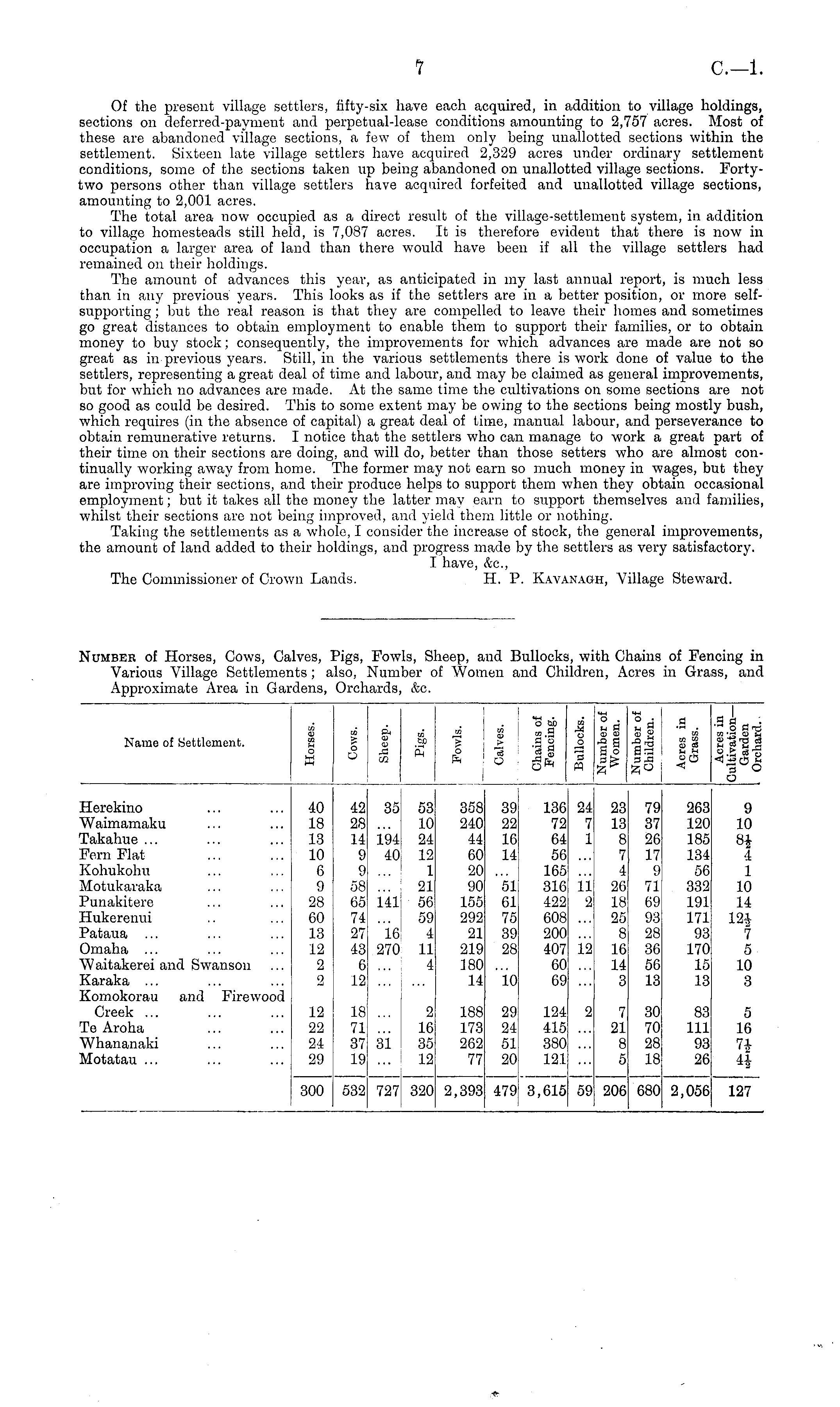 Of the present village settlers, fifty-six have each acquired, in addition to village holdings, sections on deferred-payment and perpetual-lease conditions amounting to 2,757 acres. Most of these are abandoned village sections, a few of them only being unallotted sections within the settlement. Sixteen late village settlers have acquired 2,329 acres under ordinary settlement conditions, some of the sections taken up being abandoned on unallotted village sections. Fortytwo persons other than village settlers have acquired forfeited and unallotted village sections, amounting to 2,001 acres. The total area now occupied as a direct result of the village-settlement system, in addition to village homesteads still held, is 7,087 acres. It is therefore evident that there is now in occupation a larger area of land than there would have been if all the village settlers had remained on their holdings. The amount of advances this year, as anticipated in my last annual report, is much less than in any previous years. This looks as if the settlers are in a better position, or more selfsupporting ; but the real reason is that they are compelled to leave their homes and sometimes go great distances to obtain employment to enable them to support their families, or to obtain money to buy stock; consequently, the improvements for which advances are made are not so great as in previous years. Still, in the various settlements there is work done of value to the settlers, representing a great deal of time and labour, and may be claimed as general improvements, but for which no advances are made. At the same time the cultivations on some sections are not so good as could be desired. This to some extent may be owing to the sections being mostly bush, which requires (in the absence of capital) a great deal of time, manual labour, and perseverance to obtain remunerative returns. I notice that the settlers who can manage to work a great part of their time on their sections are doing, and will do, better than those setters who are almost continually working away from home. The former may not earn so much money in wages, but they are improving their sections, and their produce helps to support them when they obtain occasional employment; but it takes all the money the latter may earn to support themselves and families, whilst their sections are not being improved, and yield them little or nothing. Taking the settlements as a whole, I consider the increase of stock, the general improvements, the amount of land added to their holdings, and progress made by the settlers as very satisfactory. I have, &c, The Commissioner of Crown Lands. H. P. Kavanagh, Village Steward.