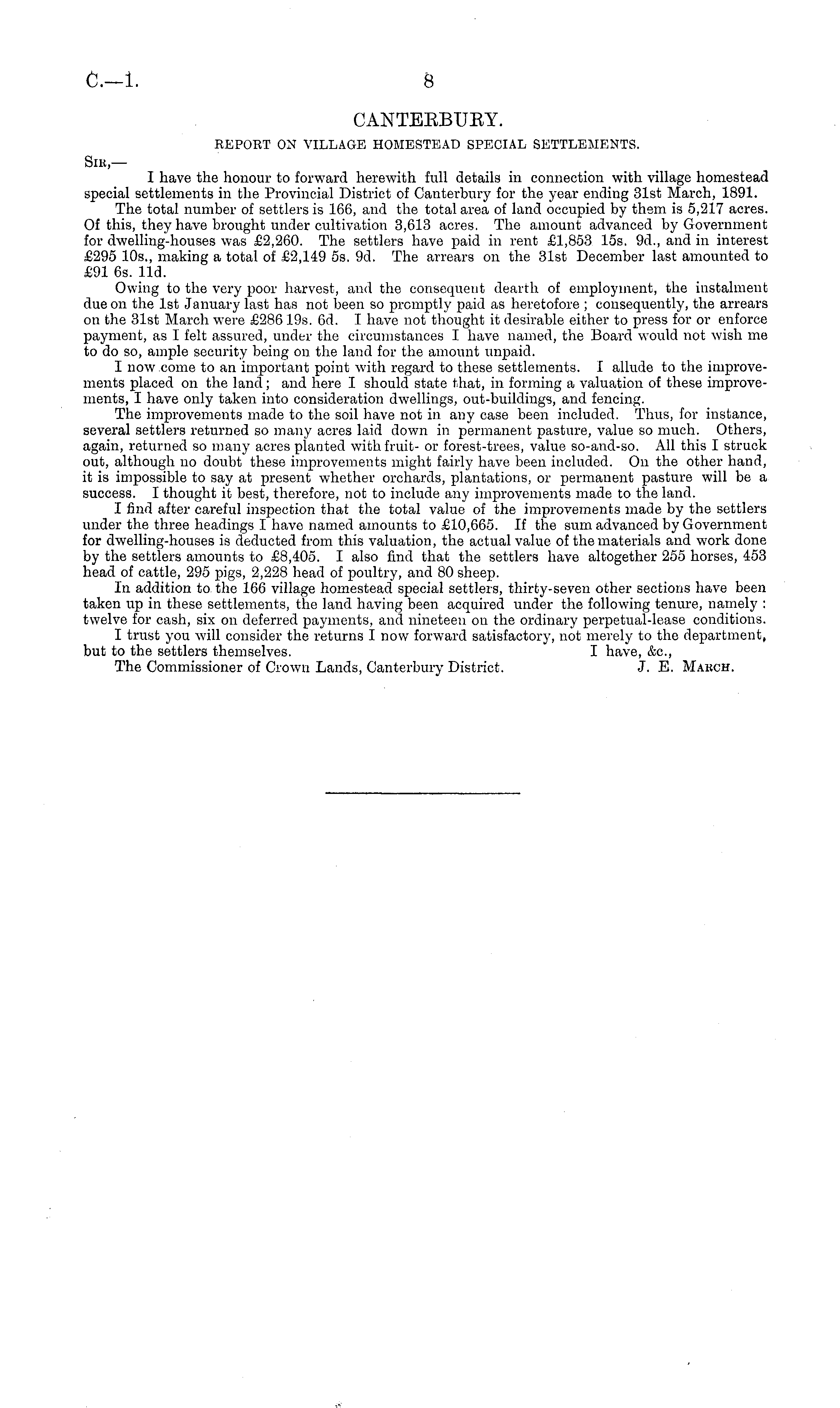 CANTEEBUEY. REPORT ON VILLAGE HOMESTEAD SPECIAL SETTLEMENTS. SlH,— I have the honour to forward herewith full details in connection with village homestead special settlements in the Provincial District of Canterbury for the year ending 31st March, 1891. The total number of settlers is 166, and the total area of land occupied by them is 5,217 acres. Of this, they have brought under cultivation 3,613 acres. The amount advanced by Government for dwelling-houses was £2,260. The settlers have paid in rent £1,853 15s. 9d., and in interest £295 10s., making a total of £2,149 ss. 9d. The arrears on the 31st December last amounted to £91 6s. lid. Owing to the very poor harvest, and the consequent dearth of employment, the instalment due on the Ist January last has not been so promptly paid as heretofore ; consequently, the arrears on the 31st March were £286195. 6d. I have not thought it desirable either to press for or enforce payment, as I felt assured, under the circumstances I have named, the Board would not wish me to do so, ample security being on the land for the amount unpaid. I now come to an important point with regard to these settlements. I allude to the improvements placed on the land; and here I should state that, in forming a valuation of these improvements, I have only taken into consideration dwellings, out-buildings, and fencing. The improvements made to the soil have not in any case been included. Thus, for instance, several settlers returned so many acres laid down in permanent pasture, value so much. Others, again, returned so many acres planted with fruit- or forest-trees, value so-and-so. All this I struck out, although no doubt these improvements might fairly have been included. On the other hand, it is impossible to say at present whether orchards, plantations, or permanent pasture will be a success. I thought it best, therefore, not to include any improvements made to the land. I find after careful inspection that the total value of the improvements made by the settlers under the three headings I have named amounts to £10,665. If the sum advanced by Government for dwelling-houses is deducted from this valuation, the actual value of the materials and work done by the settlers amounts to £8,405. I also find that the settlers have altogether 255 horses, 453 head of cattle, 295 pigs, 2,228 head of poultry, and 80 sheep. In addition to the 166 village homestead special settlers, thirty-seven other sections have been taken up in these settlements, the land having been acquired under the following tenure, namely : twelve for cash, six on deferred payments, and nineteen on the ordinary perpetual-lease conditions. I trust you will consider the returns I now forward satisfactory, not merely to the department, but to the settlers themselves. I have, &c, The Commissioner of Crown Lands, Canterbury District. J. E. Makch.