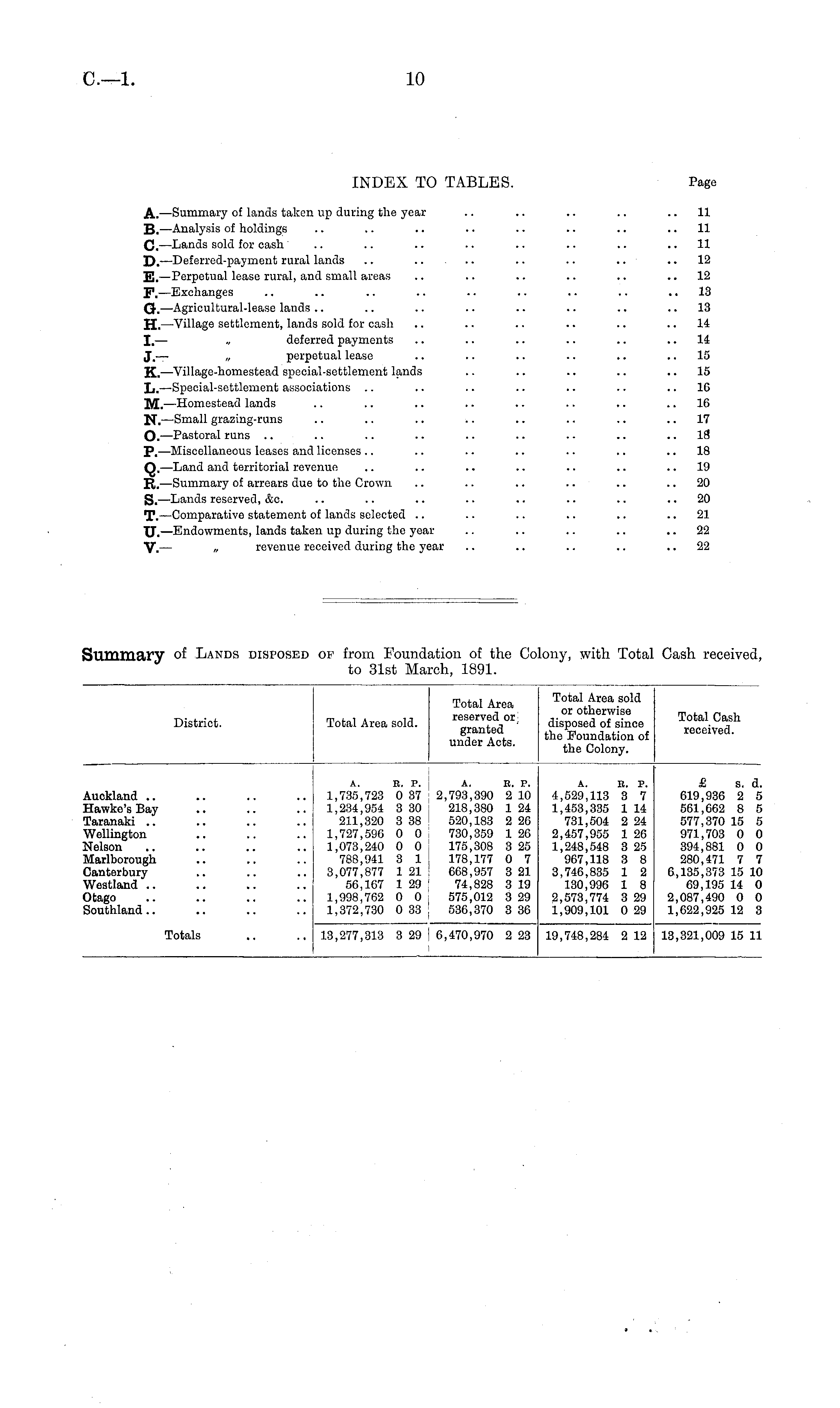 District. Total Area sold. Total Area reserved or granted under Acts. Total Area sold or otherwise disposed of since the Foundation of the Colony. Total Cash received. Luckland .. lawko's Bay 'aranaki .. Vellington Telson larlborough ianterbury Vestland .. )tago louthland.. A. E. P. 1,735,723 0 37 1,234,954 3 30 211,320 3 38 1,727,590 0 0 1,073,240 0 0 788,941 3 1 3,077,877 1 21 56,167 1 29 1,998,762 0 0 1,372,730 0 33 A. B. P. 2,793,390 2 10 218,380 1 24 520,183 2 26 730,359 1 26 175,308 3 25 178,177 0 7 668,957 3 21 74,828 3 19 575,012 3 29 536,370 3 36 A. e. p. 4,529,113 3 7 1,453,335 1 14 731,504 2 24 2,457,955 1 26 1,248,548 3 25 967,118 3 8 3,746,835 1 2 130,996 1 8 2,573,774 3 29 1,909,101 0 29 £ s. a. 619,936 2 5 561,662 8 5 577,370 15 5 971,703 0 0 394,881 0 0 280,471 7 7 6,135,373 15 10 69,195 14 0 2,087,490 0 0 1,622,925 12 3 Totals 13,277,313 3 29 6,470,970 2 23 19,748,284 2 12 13,321,009 15 11