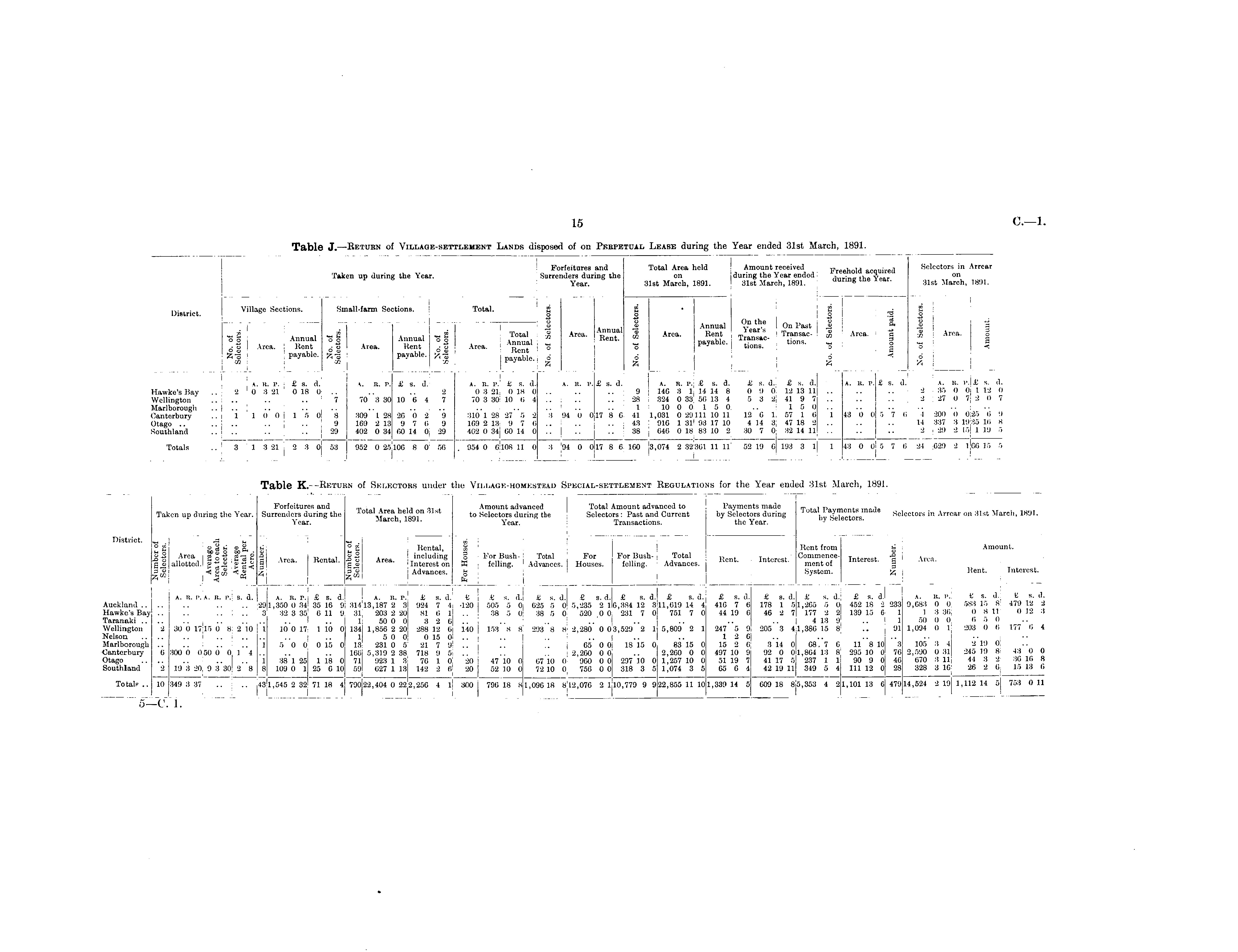 Taken up during the Year. F01 Surrer irfeitures ndors dur Year. rfeitures idors duri Year. and Total Area held ing the on 31st March, 1891. and ing the Total Area held on 31st March, 1891. Amount received n___.v._i_. „„„„;..„,. v . ,, v , , ; Freehold acquired during the Year ended ,„. ... ft„. 31st March, 1891. during the Year. uircd 'ear. Selectors in Arrear on 31st March, 1891. District. Village Sections. "o o Annual _: o Area. Rent A _ payable. . _? i Small-farm Sections. -0 Cfl "o o Annual "S o ■ o Area. Rent ■ o I o a. ,, o <_. , Atl. payable, y _ co 06 1 l_ I I Total . Annual Area - Rent payable. Total. r Area. i Total Annua! Rent payable 1 _. o - 1 _/_ O e - I Area. Area. Annual Rent. o a i £ Annual Annual | Rent Rent - J payable. 0 A £ s. d. a. e. p. £ s. d. 9 146 3 1 14 14 8 28 324 0 33 50 13 4 1 10 0 0 1 5 0, 17 8 6 41 1,031 0 29111 10 11 43 916 1 31 93 17 10, 38 646 0 18 83 10 2 Annual Rent payable. U _J 0? th , e On Past I & years Transac . « Area . 1 -g T ' ansa °- tions. I Z tions. o ■=■ 6 ' I ] L * £ s. d. £ s. d. A. e. p. £ s. 0 9 0 12 13 11 5 3 2 41 9 7 .. 15 0.. 12 6 1 57 1 6 1 43 0 0 5 7 4 14 3 47 18 2 .. 30 7 0 32 14 11 .. .2 '3 Oa ___ a 3 o -Tj d. 6 _ o ■+_> o __. £ a t_j Area. _-, 3 o < 6 •A i Hawke's Bay Wellington Marlborough Canterbury Otago .. Southland A. B. P. £ s. d. 2 ' 0 3 21 1 0 18 0 _ 1 6" 0 15 0 A. B. P. £ s. dJ 2 7 70' 8 30 10 6 4 7 8 309' 1 28 20 0 2 '6 9 109 2 13 9 7 0 9 29 402 0 34 60 14 0 29 ... B. p. £ s. d. 0 3 21 0 18 0 70 3 30 10 6 4 A. B. P. 0 8 21 70 3 30 310 1 28 1 109 2 13! 402 0 34 £ s. < 0 18 10 6 27".5 9 7 60 14 d. 0 ' .. 1 4.-1 2 8 6 .. 0 .. j A. B. P. i 94 0 0 .. I •• £ s. d. A. E. P. £ S. d. 2 85 0 0 1 12 0 2 27 0 7 2 0 7 7 8 9 29 310 1 2® 27 5 2 109 2 13! 9 7 6 402 0 34 00 14 0 i 5 k 6 4 200 0 025 6 9 11 337 8 19J35 16 8 2 29 2 15 1 19 5 Totals .. 8 I 1 821 2 3 0 53 952 0 25106 8 0 56 954 0 0108 11 0 3 '94 0 017 8 6 160 3,074 2 32 301 I . L_ 17 8 6 160 3,074 2 32 301 11 11; 52 19 6 193 3 1 1 43 0 0 5 7 6 24 J629 2 166 15 5 ! i L Table K. —Return of Selectors under i ;he Village-homestead Special-settlement Regulatioi .-settlement Regulations for the Year ended 31st March, 1891. Ta Tal Forfeitures and m , . . . ,_ _., . _kcn up during the Year. Surrenders during the a otal Area_ held on 31st Year. Marcn, lsyi. Amount advanced Total Amount advanced to to Selectors during the Selectors : Past and Current Year. Transactions. otal Amount advanced to Payments made Tntal P_._mm__-_!• lectors : Past and Current by Selectors during d Selectors Selectors in Arrear on 31st March, 1891. Transactions. the Year. "' 1,1 Auckland Hawke's Bay Taranaki Wellington 2 30 0 17 U Nelson, Marlborough Canterbury 6 300 0 0 5C Otago Southland 2 19 8 20 £ District. M O _-- s •a I ■ "o go Si •2 " S-2 __ v A w 5 go .. _ s ° 2 9 3 __. 3 "^ '2 6 "_ I „ I _ -h . » I o) § ri ! (_. 2 _ ° _ Rental, i Area 1 g _ _ g_2_ .. Ttentil J- "§ Area including i allotted.I $ :» 3 Alea " cental. |§ Area. Interest on 2 =_ Advances. A. B. P. A. B. P. S. d. A. B. P. £ S. d. A. B. P. £ S. d. .. 291,350 0 34 35 16 9 31413,187 2 3 924 7 4 3 32 3 35 6 11 9 31 203 2 20 81 0 1 .. 1 50 00 326 1 30 0 1715 0 8 2 10 1 10 0 17 1 10 0 134 1,856 2 20 288 12 6 .. 1 500 0 15 0 1 5 0 0 0 15 0 13 231 0 5 21 7 9 i 300 0 0 50 0 0 1 4 .. .. .. 166 5,319 2 38 718 9 5 1 38 1 25 1 18 0 71 923 1 3 76 1 0 ! 19 3 20 9 3 30 2 8 8 109 0 1 25 6 10 59 627 1 13 142 2 6 1 51 0 ( 9 8 0 6 a 1 ( 3( 8 0 10 ! ) ) 2 1 1 1 2 2*i 1" 2 29 3 _. II CD I _. § 1 For Bush- Total For For Bush- Total W felling. Advances. Houses. felling. Advances. fa ! I £ £ s. d. £ s. d. £ s. d. £ s. d. £ s. d. •120 505 5 0 625 5 0 5,235 2 16,384 12 311,619 14 4 38 5 0 38 5 0 520 0 0 231 7 0 751 7 0 iio 158 8 8 293"8 8 2,28o' 0 03,529 2 1 5,809 2 1 '.'. '.'. '.'. 65* 0 0 1815 0 83 15 0 2,260 0 0 .. 2,260 0 0 20 47 10 0 07 10 0 900 0 0 297 10 0 1,257 10 0 20 52 10 0 72 10 0 750 0 0 318 3 5 1,074 3 5 Rent from _ ! Amount. c For Bush- Total _„_.. T „i- __,-<.' Commence- -_.■_._._._,., -2 .,.,.., I ■ , ... ,, Rent. Interest. _. , . Interest. a Aica. es. felling. Advances. ment of 3 ' System. y, Bent. Interest. - j s. d. £ s. d. £ s. d. £ s. d. £ s. d. £ s. d. £ s. d. a. b. i>. £ s. d. £ s. d. 2 16,384 12 311,619 14 4 416 7 6 178 1 51,265 5 0 452 18 2 233 9,683 0 0 583 15 81 479 12 2 0 0 231 7 0 751 7 0 44 19 6 46 2 7 177 2 2 139 15 6 1 18 36 0 8 11 0 12 3 4 13 9 .. 1 50 0 0 6 5 0! 0 03,529 2 1 5,809 2 1 247 5 9 205 3 41,386 15 8 .. 91 1,094 0 1 203 0 6 177 6 4 12 6.. 0 0 18 15 0 83 15 0 15 2 0 3 14 0 68, 7 6 11 8 10 3 105 3 4 2 19 0 0 0 .. 2,260 0 0 497 10 9 92 0 01,864 13 8 295 10 0 76 2,590 0 31 245 19 81 43 0 0 0 0 297 10 0 1,257 10 0 51 19 7 41 17 5 237 1 1 90 9 0 46 670 8 11 44 8 2 30 16 8 0 0 318 3 5 1,074 3 5 65 6 4 42 19 11 349 5 4 111 12 0 28 328 3 16 26 2 6 15 18 6 Rent. £ s. d. 416 7 6 44 19 6 Interest. £ s. d. 178 1 5 46 2 7 2 i 247 5 9 12 6 15 2 6 497 10 9 51 19 7 65 6 4 205"3 4 314 0 92 0 0 41 17 5 42 19 11 6 1 '2 i 8 Totals .. 10 349 3 37! 1,545 2 32 71 18 4 790 22,404 0 22 2,256 4 1 300 790 18 81,096 18 812,076 2 110,779 9 9 1,339 14 5 609 18 8 5,353 4 2 1,101 13 6 479 14,524 2 19 1,112 14 5 753 0 11 43 22,855 11 10 5—C. 1. •