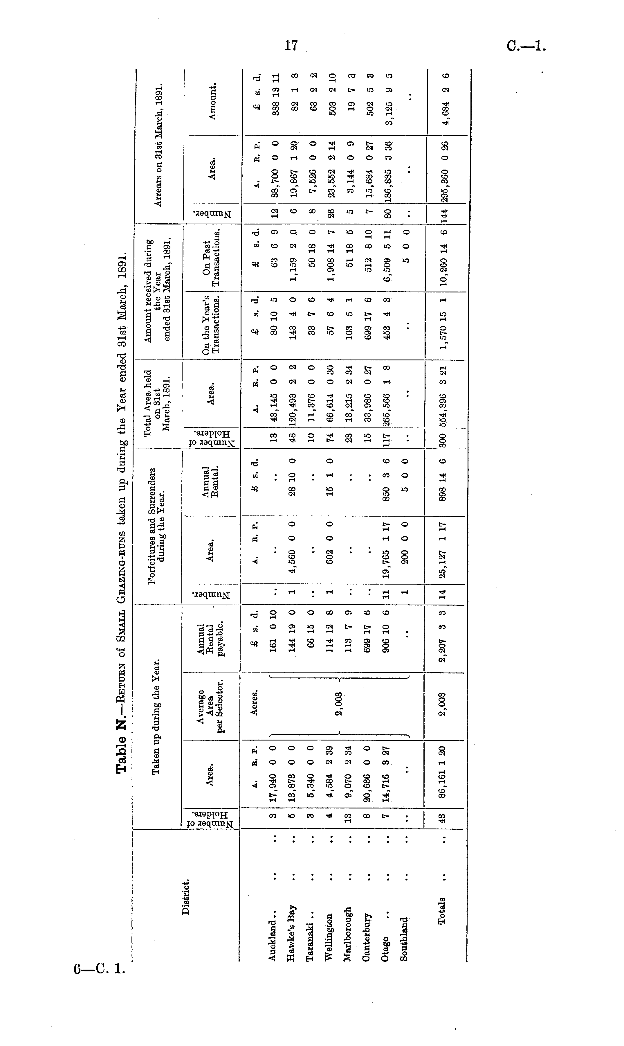 Taken up during the Year. Forfeitures and Surrenders during the Year. Total Area held on 31st March, 1891. Amount received during the Year ended 31st March, 1891. Arrears on 31st March, 1891. District. Average Area per Selector. Annual Rental payable. U B 1Area. i Area. Annual Rental. Area. On the Year's Transactions. On Past Transactions. O Area. Amount. A. B. P. Acres. £ s. d. A. E. P. £ s. d. A. E. P. £ s. d. £ s. d. £ s. d. a. e. p. Auckland.. 3 17,940 0 0 161 0 10 13 43,145 0 0 80 10 5 63 6 9 12 38,700 0 0 388 13 11 Hawke's Bay 5 13,873 0 0 144 19 0 1 4,560 0 0 28 10 0 - 120,493 2 2 143 4 0 1,159 2 0 6 19,867 1 20 82 1 8 Taranaki .. 3 5,340 0 0 66 15 0 10 11,376 0 0 33 7 6 50 18 0 8 7,526 0 0 63 2 2 Wellington 4 4,584 2 39 114 12 8 1 602 0 0 15 1 0 74 66,614 0 30 57 6 4 1,908 14 7 26 23,552 2 14 503 2 10 Marlborough 13 2,003 113 7 9 9,070 2 34 23 13,215 2 34 103 5 1 51 18 5 5 3,144 0 9 19 7 3 Canterbury 8 20,636 0 0 699 17 6 15 33,986 0 27 699 17 6 512 8 10 7 15,684 0 27 502 5 3 Otago 7 14,716 3 27 906 10 6 11 19,765 1 17 850 3 6 117 265,566 1 8 453 4 3 6,509 5 11 80 186,885 3 36 3,125 9 5 Southland 1 200 0 0 5 0 0 5 0 0 Totals 43 86,161 1 20 2,003 2,207 3 3 14 25,127 1 17 898 14 6 300 554,396 3 21 1,570 15 1 10,260 14 6 144 |295,360 0 26 4,684 2 6
