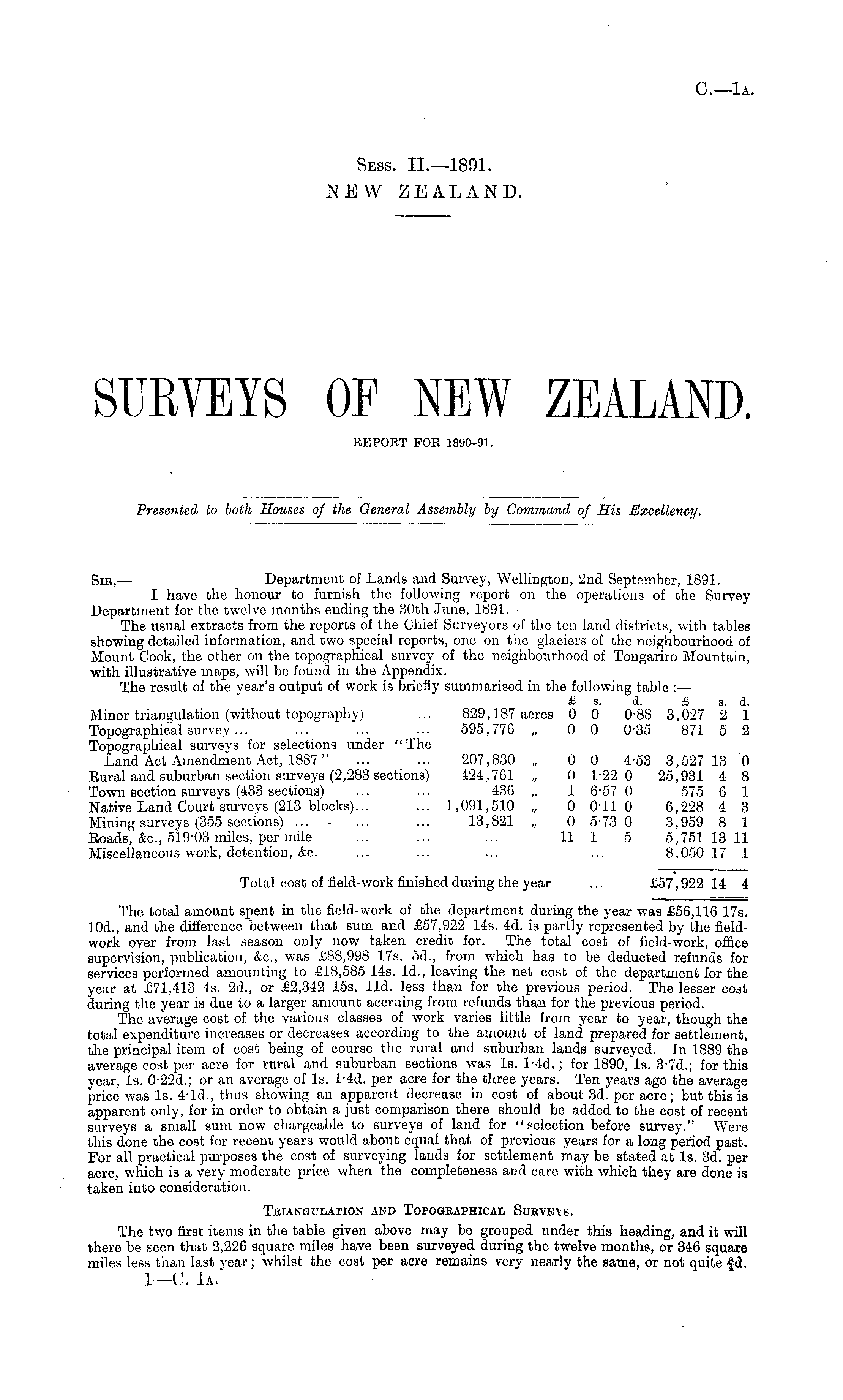SURVEYS OF NEW ZEALAND. REPORT FOR 1890-91.