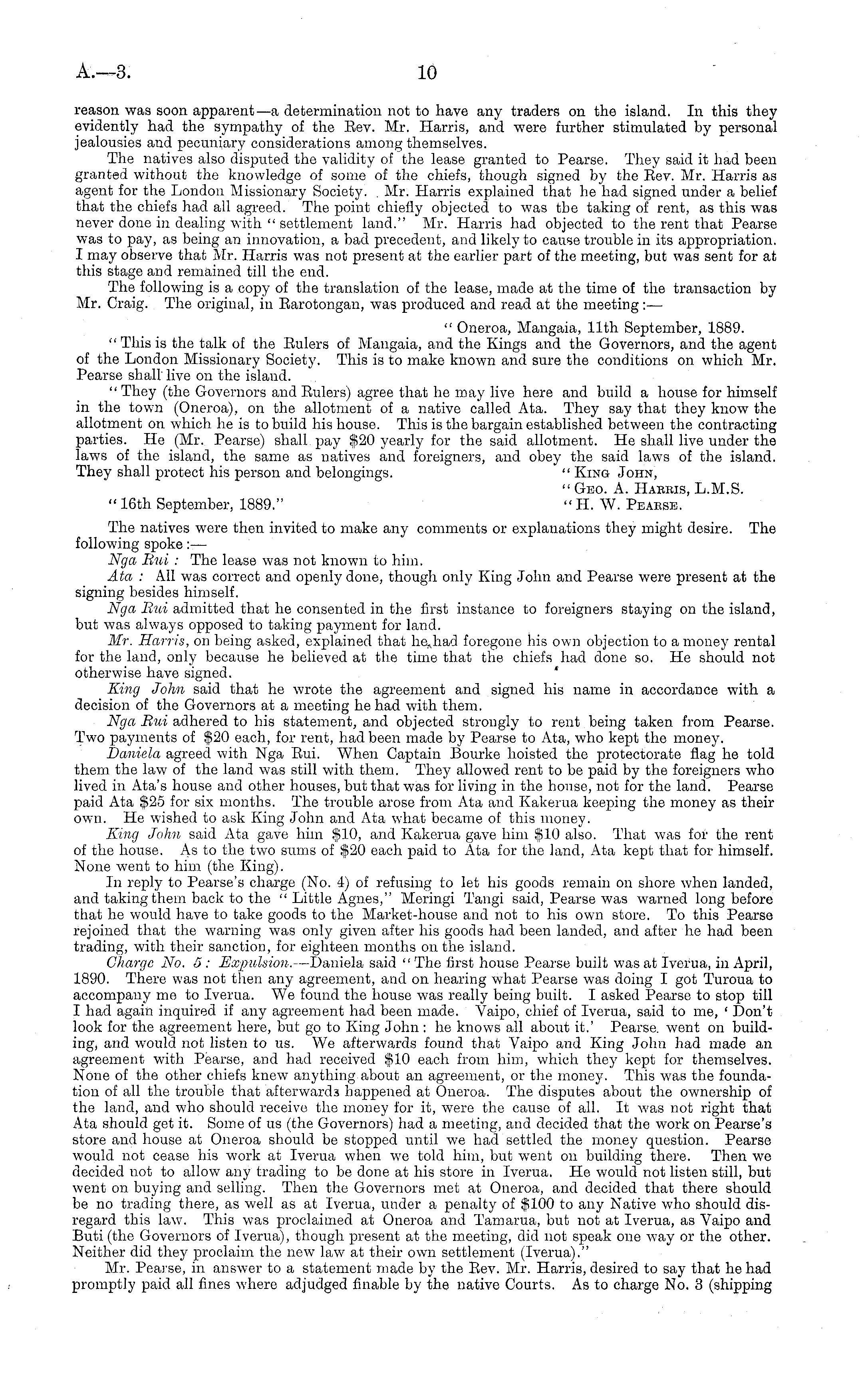 reason was soon apparent—a determination not to have any traders on the island. In this they evidently had the sympathy of the Eev. Mr. Harris, and were further stimulated by personal jealousies and pecuniary considerations among themselves. The natives also disputed the validity of the lease granted to Pearse. They said it had been granted without the knowledge of some of the chiefs, though signed by the Eev. Mr. Harris as agent for the London Missionary Society. . Mr. Harris explained that he had signed under a belief that the chiefs had all agreed. The point chiefly objected to was the taking of rent, as this was never done in dealing with " settlement land." Mr. Harris had objected to the rent that Pearse was to pay, as being an innovation, a bad precedent, and likely to cause trouble in its appropriation. I may observe that Mr. Harris was not present at the earlier part of the meeting, but was sent for at this stage and remained till the end. The following is a copy of the translation of the lease, made at the time of the transaction by Mr. Craig. The original, in Earotongan, was produced and read at the meeting:— " Oneroa, Mangaia, 11th September, 1889. " This is the talk of the Eulers of Mangaia, and the Kings and the Governors, and the agent of the London Missionary Society. This is to make known and sure the conditions on which Mr. Pearse shall live on the island. " They (the Governors and Eulers) agree that he may live here and build a house for himself in the town (Oneroa), on the allotment of a native called Ata. They say that they know the allotment on which he is to build his house. This is the bargain established between the contracting parties. He (Mr. Pearse) shall pay $20 yearly for the said allotment. He shall live under the laws of the island, the same as natives and foreigners, and obey the said laws of the island. They shall protect his person and belongings. " King John, " Gbo. A. Haebis, L.M.S. " 16th September, 1889." " H. W. Pearse. The natives were then invited to make any comments or explanations they might desire. The following spoke:— Nga Bui : The lease was not known to him. Ata : All was correct and openly done, though only King John and Pearse were present at the signing besides himself. Nga Bui admitted that he consented in the first instance to foreigners staying on the island, but was always opposed to taking payment for land. Mr. Harris, on being asked, explained that he.had foregone his own objection to a money rental for the land, only because he believed at the time that the chiefs had done so. He should not otherwise have signed. King John said that he wrote the agreement and signed his name in accordance with a decision of the Governors at a meeting he had with them. Nga Bui adhered to his statement, and objected strongly to rent being taken from Pearse. Two payments of $20 each, for rent, had been made by Pearse to Ata, who kept the money. Daniela agreed with Nga Eui. When Captain Bourke hoisted the protectorate flag he told them the law of the land was still with them. They allowed rent to be paid by the foreigners who lived in Ata's house and other houses, but that was for living in the house, not for the land. Pearse paid Ata $25 for six months. The trouble arose from Ata and Kakerua keeping the money as their own. He wished to ask King John and Ata what became of this money. King John said Ata gave him $10, and Kakerua gave him $10 also. That was for the rent of the house. As to the two sums of $20 each paid to Ata for the land, Ata kept that for himself. None went to him (the King). In reply to Pearse's charge (No. 4) of refusing to let his goods remain on shore when landed, and taking them back to the " Little Agnes," Meringi Tangi said, Pearse was warned long before that he would have to take goods to the Market-house and not to his own store. To this Pearse rejoined that the warning was only given after his goods had been landed, and after he had been trading, with their sanction, for eighteen months on the island. Charge No. 5: Expulsion. —Daniela said " The first house Pearse built was at Iverua, in April, 1890. There was not then any agreement, and on hearing what Pearse was doing I got Turoua to accompany me to Iverua. We found the house was really being built. I asked Pearse to stop till I had again inquired if any agreement had been made. Vaipo, chief of Iverua, said to me, ' Don't look for the agreement here, but go to King John :he knows all about it.' Pearse. went on building, and would not listen to us. We afterwards found that Vaipo and King John had made an agreement with Pearse, and had received $10 each from him, which they kept for themselves. None of the other chiefs knew anything about an agreement, or the money. This was the foundation of all the trouble that afterwards happened at Oneroa. The disputes about the ownership of the land, and who should receive the money for it, were the cause of all. It was not right that Ata should get it. Some of us (the Governors) had a meeting, and decided that the work on Pearse's store and house at Oneroa should be stopped until we had settled the money question. Pearse would not cease his work at Iverua when we told him, but went on building there. Then we decided not to allow any trading to be done at his store in Iverua. He would not listen still, but went on buying and selling. Then the Governors met at Oneroa, and decided that there should be no trading there, as well as at Iverua, under a penalty of $100 to any Native who should disregard this law. This was proclaimed at Oneroa and Tamarua, but not at Iverua, as Vaipo and Buti (the Governors of Iverua), though present at the meeting, did not speak ono way or the other. Neither did they proclaim the new law at their own settlement (Iverua)." Mr. Pearse, in answer to a statement made by the Eev. Mr. Harris, desired to say that he had promptly paid all fines where adjudged finable by the native Courts. As to charge No. 3 (