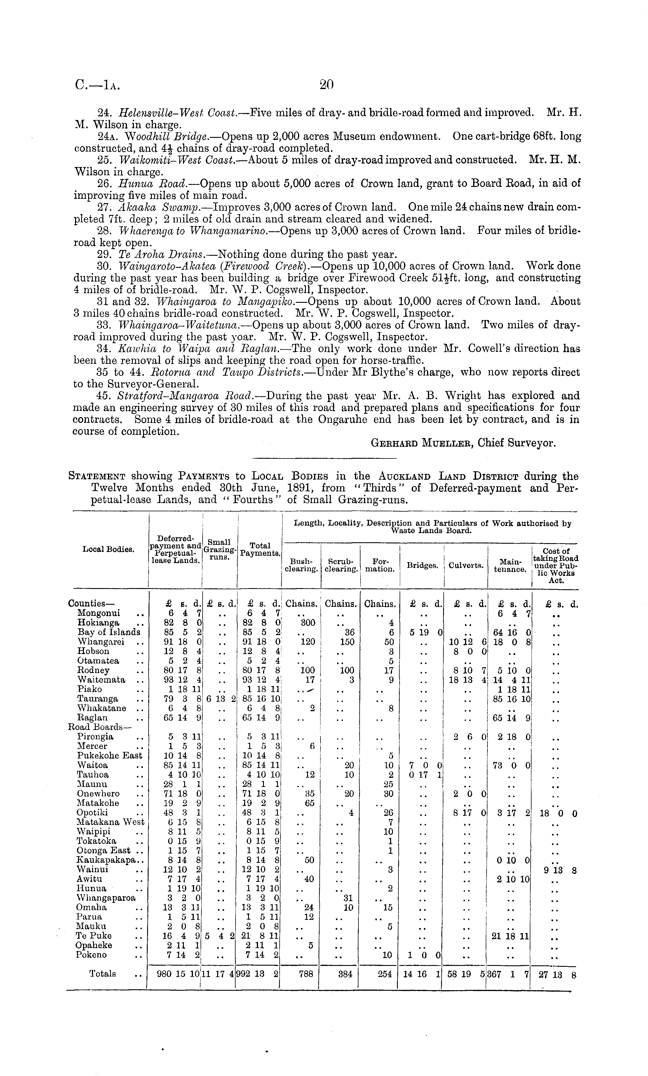 24. HelensviUe-West Coast, —Five miles of dray- and bridle-road formed and improved. Mr. H. M. Wilson in charge. 24a. ~Woodhill Bridge, —Opens up 2,000 acres Museum endowment. One cart-bridge 68ft. long constructed, and 4$ chains of dray-road completed. 25. Waikomiti-West Coast. —About 5 miles of dray-road improved and constructed. Mr. H. M. Wilson in charge. 26. Hunua Road. —Opens up about 5,000 acres of Crown land, grant to Board Eoad, in aid of improving five miles of main road. 27. Akaaka Swamp. —lmproves 3,000 acres of Crown land. One mile 24 chains new drain completed 7ft. deep; 2 miles of old drain and stream cleared and widened. 28. Whacrenr/ato Whangamarino. —Opens up 3,000 acres of Crown land. Four miles of bridleroad kept open. 29. Te Aroha Drains. —Nothing done during the past year. 30. Waingaroto-Ahatea (Firewood Creek). —Opens up 10,000 acres of Crown land. Work done during the past year has been building a bridge over Firewood Creek 51Jft. long, and constructing 4 miles of of bridle-road. Mr. W. P. Cogswell, Inspector. 31 and 32. Whaingaroa to Mangapiko. —Opens up about 10,000 acres of Crown land. About 3 miles 40 chains bridle-road constructed. Mr. W. P. Cogswell, Inspector. 33. Wlutingaroa-Waitetuna. —Opens up about 3,000 acres of Crown land. Two miles of drayroad improved during the past yoar. Mr. W. P. Cogswell, Inspector. 34. Kaiuhia to Waipa and Raglan. —The only work done under Mr. Cowell's direction has been the removal of slips and keeping the road open for horse-traffic. 35 to 44. Rotorua and Taupo Districts. —Under Mr Blythe's charge, who now reports direct to the Surveyor-General. 45. Stratford-Mangaroa Road. —During the past year Mr. A. B. Wright has explored and made an engineering survey of 30 miles of this road and prepared plans and specifications for four contracts. Some 4 miles of bridle-road at the Ongaruhe end has been let by contract, and is in course of completion. Geehard Muellee, Chief Surveyor.
