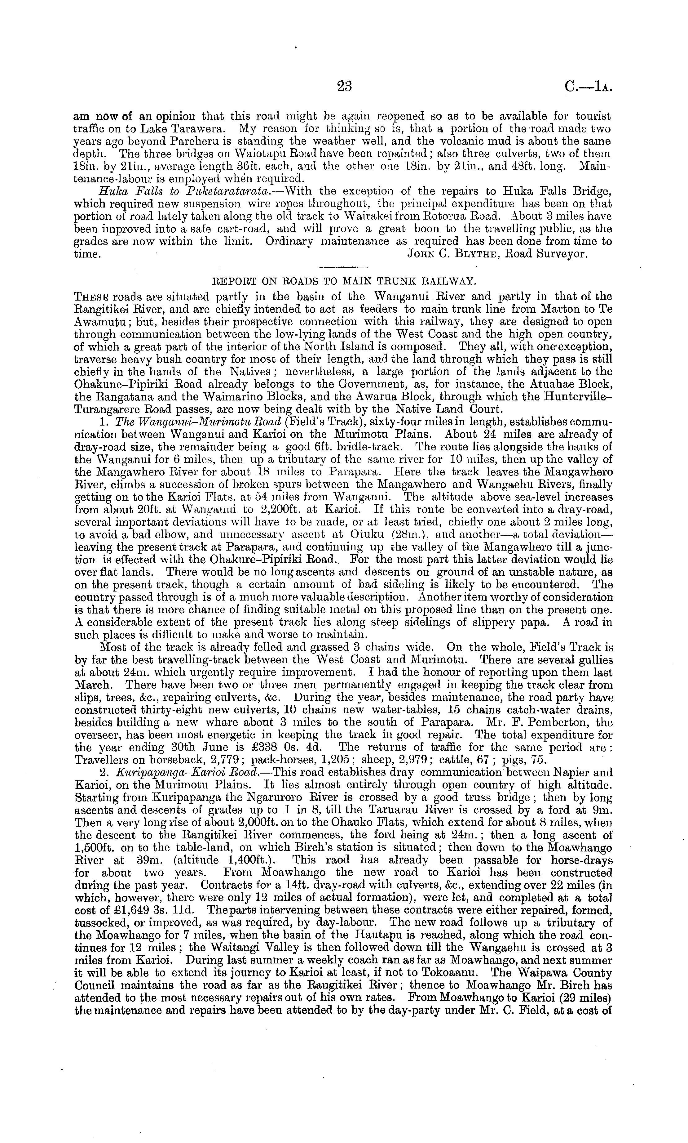 REPORT ON ROADS TO MAIN TRUNK RAILWAY. These roads are situated partly in the basin of the Wauganui Eiver and partly in that of the Eangitikei Eiver, and are chiefly intended to act as feeders to main trunk line from Marton to Te Awamutu; but, besides their prospective connection with this railway, they are designed to open through communication between the low-lying lands of the West Coast and the high open country, of which a great part of the interior of the North Island is oomposed. They all, with one , exception, traverse heavy bush country for most of their length, and the land through which they pass is still chiefly in the hands of the Natives ; nevertheless, a large portion of the lands adjacent to the Ohakune-Pipiriki Eoad already belongs to the Government, as, for instance, the Atuahae Block, the Eangatana and the Waimarino Blocks, and the Awarua Block, through which the HuntervilleTurangarere Eoad passes, are now being dealt with by the Native Land Court. 1. The Wang anui-Miirimot v Boad (Field's Track), sixty-four miles in length, establishes communication between Wanganui and Karioi on the Murimotu Plains. About 24 miles are already of dray-road size, the remainder being a good 6ft. bridle-track. The route lies alongside the banks of the Wanganui for 6 miles, then up a tributary of the same river for 10 miles, then up the valley of the Mangawhero Eiver for about 18 miles to Parapara. Here the track leaves the Mangawhero Eiver, climbs a succession of broken spurs between the Mangawhero and Wangaehu Eivers, finally getting on to the Karioi Flats, at 54 miles from Wanganui. The altitude above sea-level increases from about 20ft. at Wanganui to 2,200 ft. at Karioi. If this ronte be converted into a dray-road, several important deviations will have to be made, or at least tried, chiefly one about 2 miles long, to avoid a bad elbow, and unnecessary ascent at Otuku (28m.), and another—a total deviation— leaving the present track at Parapara, and continuing up the valley of the Mangawhero till a junction is effected with the Ohakure-Pipiriki Eoad.. For the most part this latter deviation would lie over fiat lands. There would be no long ascents and descents on ground of an unstable nature, as on the present track, though a certain amount of bad sideling is likely to be encountered. The country passed through is of a much more valuable description. Another item worthy of consideration is that there is more chance of finding suitable metal on this proposed line than on the present one. A considerable extent of the present track lies along steep sidelings of slippery papa. A road in such places is difficult to make and worse to maintain. Most of the track is already felled and grassed 3 chains wide. On the whole, Field's Track is by far the best travelling-track between the West Coast and Murimotu. There are several gullies at about 24m. which urgently require improvement. I had the honour of reporting upon them last March. There have been two or three men permanently engaged in keeping the track clear from slips, trees, &c, repairing culverts, <tc. During the year, besides maintenance, the road party have constructed thirty-eight new culverts, 10 chains new water-tables, 15 chains catch-water drains, besides building a new whare about 3 miles to the south of Parapara. Mr. F. Pemberton, the overseer, has been most energetic in keeping the track in good repair. The total expenditure for the year ending 30th June is £338 os. 4d. The returns of traffic for the same period are : Travellers on horseback, 2,779; pack-horses, 1,205; sheep, 2,979; cattle, 67 ; pigs, 75. 2. Kivrvpa/paiuja-Karioh Boad. —This road establishes dray communication between Napier and Karioi, on the Murimotu Plains. It lies almost entirely through open country of high altitude. Starting from Kuripapanga the Ngaruroro Eiver is crossed by a good truss bridge ; then by long ascents and descents of grades up to 1 in 8, till the Taruarau Eiver is crossed by a ford at 9m. Then a very long rise of about 2,000 ft. on to the Ohauko Flats, which extend for about 8 miles, when the descent to the Eangitikei Eiver commences, the ford being at 24m.; then a long ascent of 1,500 ft. on to the table-land, on which Birch's station is situated; then down to the Moawhango Eiver at 39m. (altitude 1,400 ft.). This raod has already been passable for horse-drays for about two years. From Moawhango the new road to Karioi has been constructed during the past year. Contracts for a 14ft. dray-road with culverts, &c, extending over 22 miles (in which, however, there were only 12 miles of actual formation), were let, and completed at a total cost of £1,649 3s. lid. Theparts intervening between these contracts were either repaired, formed, tussocked, or improved, as was required, by day-labour. The new road follows up a tributary of the Moawhango for 7 miles, when the basin of the Hautapu is reached, along which the road continues for 12 miles ; the Waitangi Valley is then followed down till the Wangaehu is crossed at 3 miles from Karioi. During last summer a weekly coach ran as far as Moawhango, and next summer it will be able to extend its journey to Karioi at least, if not to Tokoaanu. The Waipawa County Council maintains the road as far as the Eangitikei Eiver; thence to Moawhango Mr. Birch has attended to the most necessary repairs out of his own rates. From Moawhango to Karioi (29 miles) the maintenance and repairs have been attended to by the day-party under Mr. C. Field, at a cost of