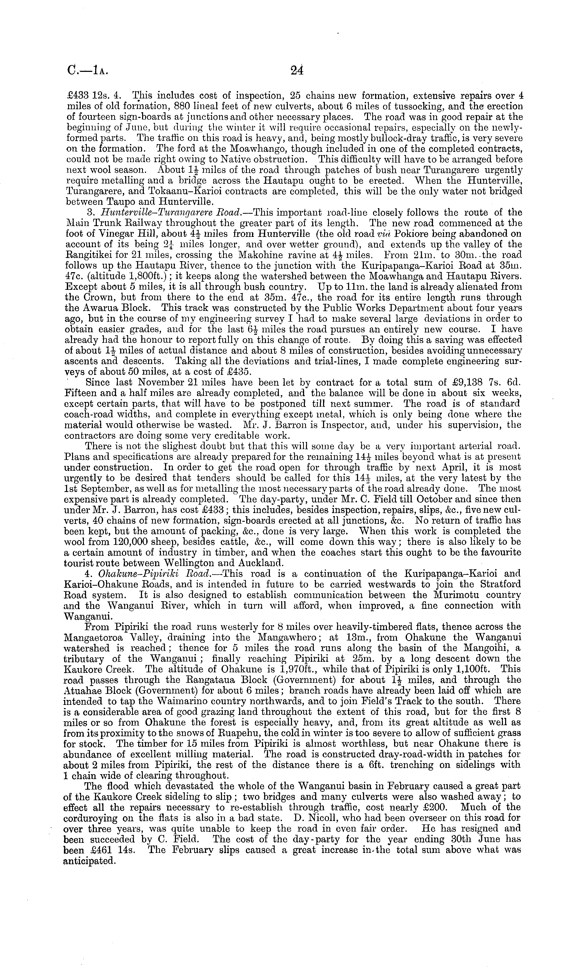 £433 12s. 4. This includes cost of inspection, 25 chains new formation, extensive repairs over 4 miles of old formation, 880 lineal feet of new culverts, about 6 miles of tussocking, and the erection of fourteen sign-boards at junctions and other necessary places. The road was in good repair at the beginning of June, but during the winter it will require occasional repairs, especially on the newlyformed parts. The traffic on this road is heavy, and, being mostly bullock-dray traffic, is very severe on the formation. The ford at the Moawhango, though included in one of the completed contracts, could not be made right owing to Native obstruction. This difficulty will have to be arranged before next w-00l season. About If miles of the road through patches of bush near Turangarere urgently require metalling and a bridge across the Hautapu ought to be erected. When the Hunterville, Turangarere, and Tokaanu-Karioi contracts are completed, this will be the only water not bridged between Taupo and Hunterville. 3. Hunterville-Turangarcre Road. —This important road-line closely follows the route of the Main Trunk Bailway throughout the greater part of its length. The new road commenced at the foot of Vinegar Hill, about 4| miles from Hunterville (the old road via Pokiore being abandoned on account of its being 2 \ miles longer, and over wetter ground), and extends up the valley of the Bangitikei for 21 miles, crossing the Makohine ravine at 4-f miles, from 21m. to 30m. the road follows up the Hautapu Biver, thence to the junction with the Kuripapanga-Karioi Boad at 35m. 47c. (altitude 1,800 ft.); it keeps along the watershed between the Moawhanga and Hautapu Bivers. Except about 5 miles, it is all through bush country. Up to 11m. the land is already alienated from the Crown, but from there to the end at 35m. 47c, the road for its entire length runs through the Awarua Block. This track was constructed by the Public Works Department about four years ago, but in the course of my engineering survey I had to make several large deviations in order to obtain easier grades, and for the last 6-|- miles the road pursues an entirely new course. I have already had the honour to report fully on this change of route. By doing this a saving was effected of about \\ miles of actual distance and about 8 miles of construction, besides avoiding unnecessary ascents and descents. Taking all the deviations and trial-lines, I made complete engineering surveys of about 50 miles, at a cost of £435. Since last November 21 miles have been let by contract for a total sum of £9,138 7s. 6d. Fifteen and a half miles are already completed, and the balance will be done in about six weeks, except certain parts, that will have to be postponed till next summer. The road is of standard coach-road widths, and complete in everything except metal, which is only being done where the material would otherwise be wasted. Mr. J. Barron is Inspector, and, under his supervision, the contractors are doing some very creditable work. There is not the slighest doubt but that this will some day be a very important arterial road. Plans and specifications are already prepared for the remaining 14{ f miles beyond what is at present under construction. In order to get the road open for through traffic by next April, it is most urgently to be desired that tenders should be called for this 144 miles, at the very latest by the Ist September, as well as for metalling the most necessary parts of the road already done. The most expensive part is already completed. The day-party, under Mr. C. Field till October and since then under Mr. J. Barron, has cost £433 ; this includes, besides inspection, repairs, slips, &c, five new culverts, 40 chains of new formation, sign-boards erected at all junctions, &c. No return of traffic has been kept, but the amount of packing, &c, done is very large. When this work is completed the wool from 120,000 sheep, besides cattle, &c, will come down this way; there is also likely to be a certain amount of industry in timber, and when the coaches start this ought to be the favourite tourist route between Wellington and Auckland. 4. Ohakune-Pipiriki Road. —This road is a continuation of the Kuripapanga-Karioi and Karioi-Ohakune Boads, and is intended in future to be carried westwards to join the Stratford Boad system. It is also designed to establish communication between the Murimotu country and the Wanganui Biver, which in turn will afford, when improved, a fine connection with Wanganui. From Pipiriki the road runs westerly for 8 miles over heavily-timbered flats, thence across the Mangaetoroa Valley, draining into the Mangawdiero; at 13m., from Ohakune the Wanganui watershed is reached; thence for 5 miles the road runs along the basin of the Mangoihi, a tributary of the Wanganui ; finally reaching Pipiriki at 25m. by a long descent down the Kaukore Creek. The altitude of Ohakune is 1,970 ft., while that of Pipiriki is only I,looft. This road passes through the Bangataua Block (Government) for about 14 miles, and through the Atuahae Block (Government) for about 6 miles; branch roads have already been laid off which are intended to tap the Waiinarino country northwards, and to join Field's Track to the south. There is a considerable area of good grazing land throughout the extent of this road, but for the first 8 miles or so from Ohakune the forest is especially heavy, and, from its great altitude as well as from its proximity to the snows of Buapehu, the cold in winter is too severe to allow of sufficient grass for stock. The timber for 15 miles from Pipiriki is almost worthless, but near Ohakune there is abundance of excellent milling material. The road is constructed dray-road-width in patches for about 2 miles from Pipiriki, the rest of the distance there is a 6ft. trenching on sidelings with 1 chain wide of clearing throughout. The flood which devastated the whole of the Wanganui basin in February caused a great part 