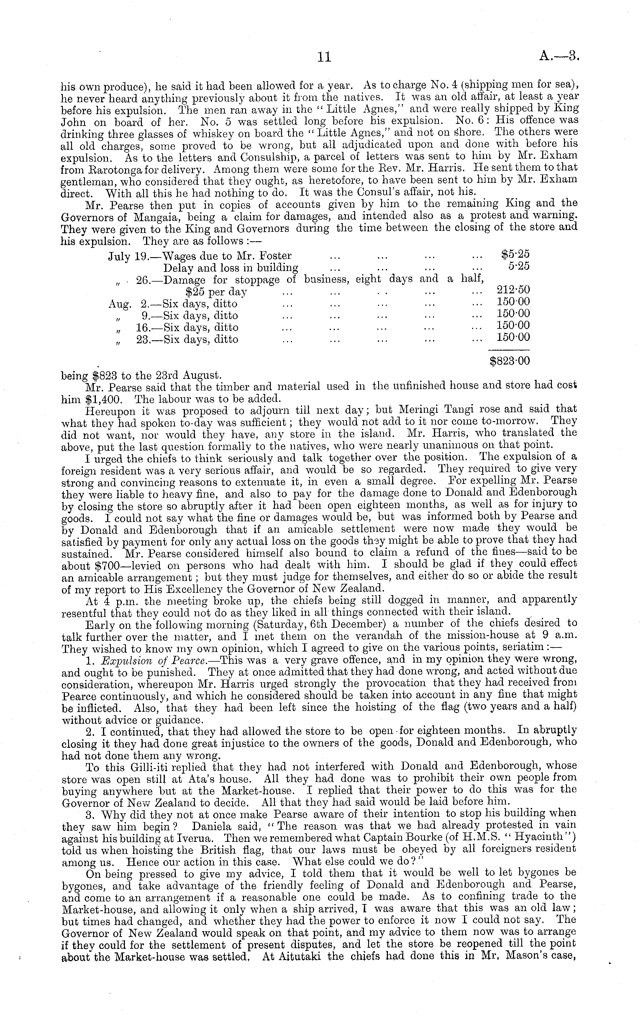 his own produce), he said it had been allowed for a year. As to charge No. 4 (shipping men for sea), he never heard anything previously about it from the natives. It was an old affair, at least a year before his expulsion. The men ran away in the " Little Agnes," and were really shipped by King John on board of her. No. 5 was settled long before his expulsion. No. 6: His offence was drinking three glasses of whiskey on board the " Little Agnes," and not on shore. The others were all old charges, some proved to be wrong, but all adjudicated upon and done with before his expulsion. As to the letters and Consulship, a parcel of letters was sent to him by Mr. Exhain from Earotonga for delivery. Among them were some for the Eev. Mr. Harris. He sent them to that gentleman, who considered that they ought, as heretofore, to have been sent to him by Mr. Exham direct. With all this he had nothing to do. It was the Consul's affair, not his. Mr. Pearse then put in copies of accounts given by him to the remaining King and the Governors of Mangaia, being a claim for damages, and intended also as a protest and warning. They were given to the King and Governors during the time between the closing of the store and his expulsion. They are as follows : — July 19.—Wages due to Mr. Foster ... ... ... ... $5-25 Delay and loss in building ... ... ... ■•• 5-25 „ 26. —Damage for stoppage of business, eight days and a half, |25perday ... 212-50 Aug. 2.—Six days, ditto ... ... ... ■•• ■•• 150-00 9.—Six days, ditto ... ... ... •■• ••■ 150-00 „ 16.—Six days, ditto ... ... ... ••• •■• 150-00 „ 23.—Six days, ditto ... ... ... ••■ ■•• 150-00 1823-00 being $823 to the 23rd August. Mr. Pearse said that the timber and material used in the unfinished house and store had cost him $1,400. The labour was to be added. Hereupon it was proposed to adjourn till next day; but Meringi Tangi rose and said that what they had spoken to-day was sufficient; they would not add to it nor come to-morrow. They did not want, nor would they have, any store in the island. Mr. Harris, who translated the above, put the last question formally to the natives, who were nearly unanimous on that point. I urged the chiefs to think seriously and talk together over the position. The expulsion of a foreign resident was a very serious affair, and would be so regarded. They required to give very strong and convincing reasons to extenuate it, in even a small degree. For expelling Mr. Pearse they were liable to heavy fine, and also to pay for the damage done to Donald and Edenborough by closing the store so abruptly after it had been open eighteen months, as well as for injury to goods. 1 could not say what the fine or damages would be, but was informed both by Pearse and by Donald and Edenborough that if an amicable settlement were now made they would be satisfied by payment for only any actual loss on the goods thsy might be able to prove that they had sustained. Mr. Pearse considered himself also bound to claim a refund of the fines—said to be about $700—levied on persons who had dealt with him. I should be glad if they could effect an amicable arrangement; but they must judge for themselves, and either do so or abide the result of my report to His Excellency the Governor of New Zealand. At 4 p.m. the meeting broke up, the chiefs being still dogged in manner, and apparently resentful that they could not do as they liked in all things connected with their island. Early on the "following morning (Saturday, 6th December) a number of the chiefs desired to talk further over the matter, and I met them on the verandah of the mission-house at 9 a.m. They wished to know my own opinion, which I agreed to give on the various points, seriatim: — 1. Exjndsion of Pearce. —This was a very grave offence, and in my opinion they were wrong, and ought to be punished. They at once admitted that they had done wrong, and acted without due consideration, whereupon Mr. Harris urged strongly the provocation that they had received from Pearce continuously, and which he considered should be taken into account in any fine that might be inflicted. Also, that they had been left since the hoisting of the flag (two years and a half) without advice or guidance. 2. I continued, that they had allowed the store to be open-for eighteen months. In abruptly closing it they had done great injustice to the owners of the goods, Donald and Edenborough, who had not done them any wrong. To this Gilli-iti replied that they had not interfered with Donald and Edenborough, whose store was open still at Ata's house. All they had done was to prohibit their own people from buying anywhere but at the Market-house, "i replied that their power to do this was for the Governor of New Zealand to decide. All that they had said would be laid before him. 3. Why did they not at once make Pearse aware of their intention to stop his building when they saw him begin? Daniela said, "The reason was that we had already protested in vain against his building at Iverua. Then we remembered what Captain Bourke (of H.M.S." Hyacinth") told us when hoisting the British flag, that our laws must be obeyed by all foreigners resident among us. Hence our action in this case. What else could we do? " On being pressed to give my advice, I told them that it would be well to let bygones be bygones, and take advantage of the friendly feeling of Donald and Edenborough and Pearse, and come to an arrangement if a reasonable one could be made. As to confining trade to the Market-house, and allowing it only when a ship arrived, I was aware that this was an old law; but times had changed, and whether they had the power to enforce it now I could not say. The Governor of New Zealand would speak on that point, and my advice to them now was to arrange if they could for the settlement of present disputes, and let the store be reopened till the point about"the Market-ho